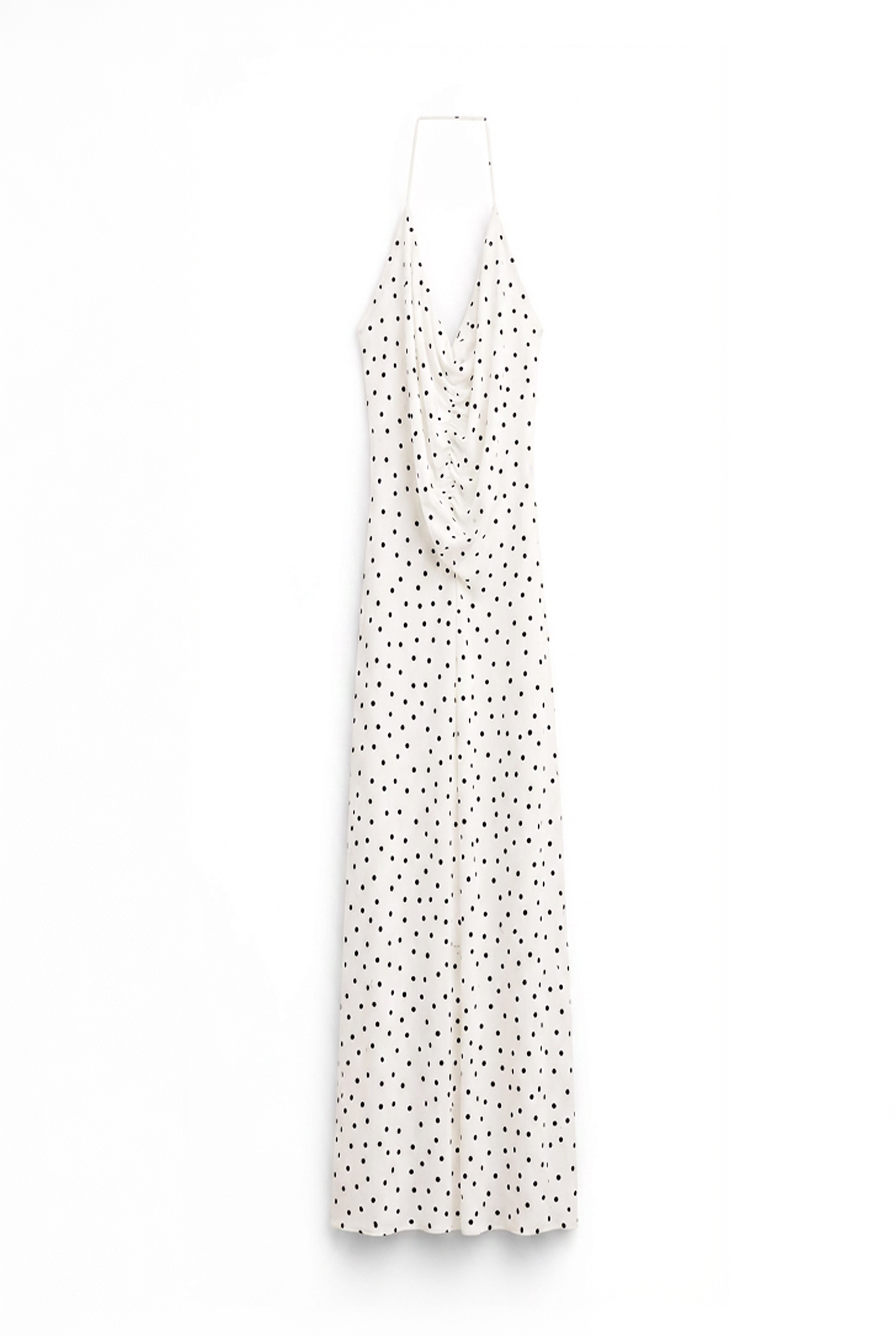 Abito lungo scollo morbido drappeggiato con stampa a pois. Spalline sottili regolabili. Presenta fodera interna. Costruzione con fascia con arriccio centrale frontale. Vestibilità regolare, disponibile in taglia S/M, M/L.