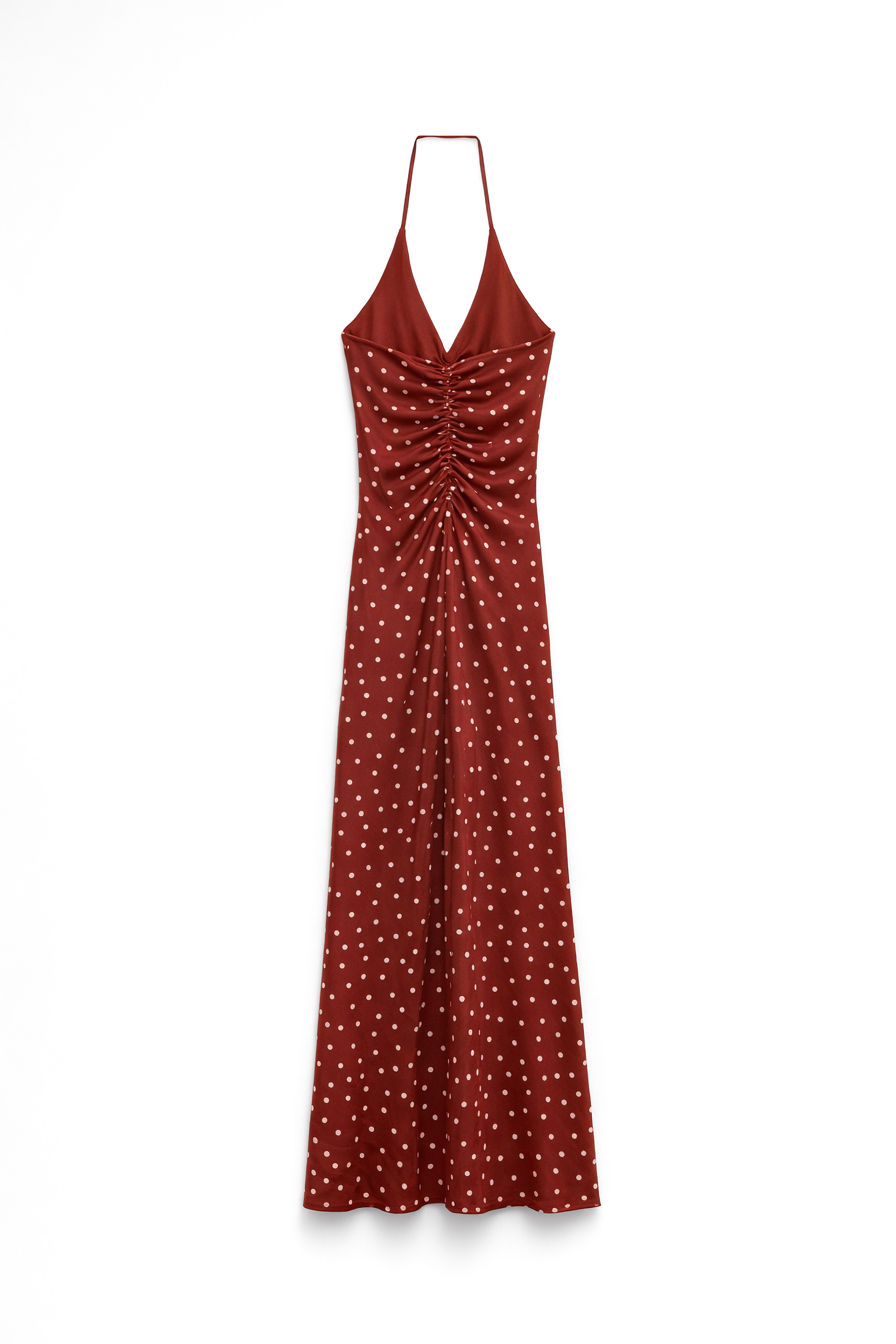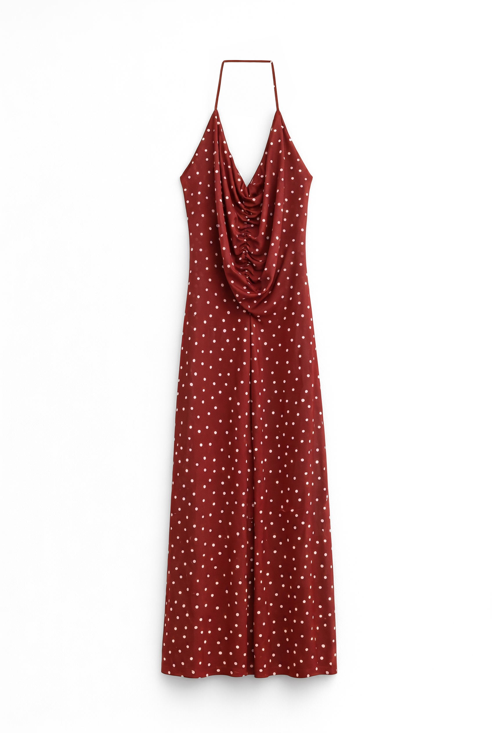 Abito lungo scollo morbido drappeggiato con stampa a pois.
