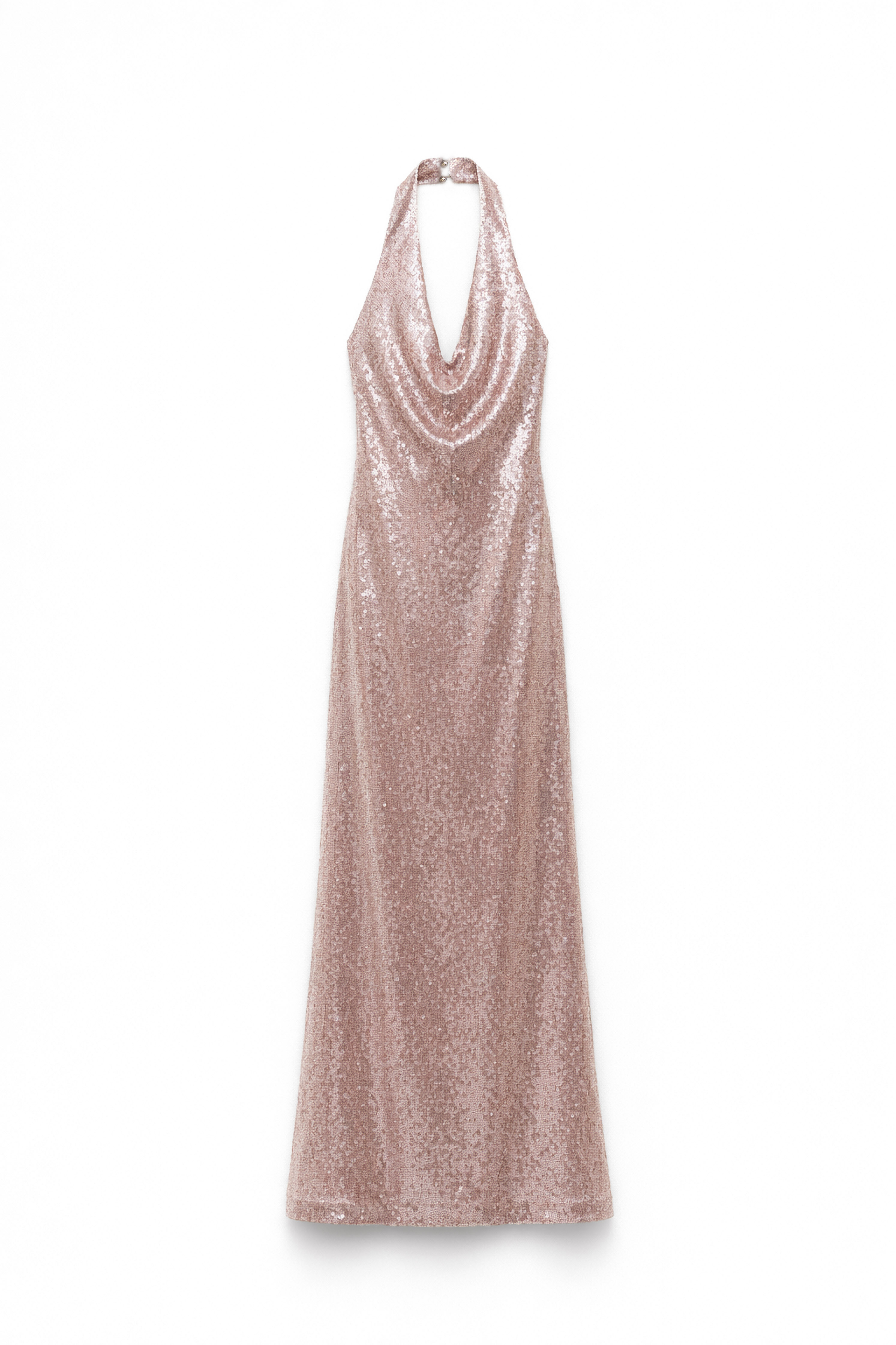 Abito lungo con tessuto in rete con applicazione di paillettes. Scollo ampio e drappeggiato sul davanti. Fodera interna. Collo halter con chiusura sul retro con bottoni gioiello. Chiusura laterale con zip invisibile nascosta. Vestibilità regolare, disponibile in taglia S/M, M/L.