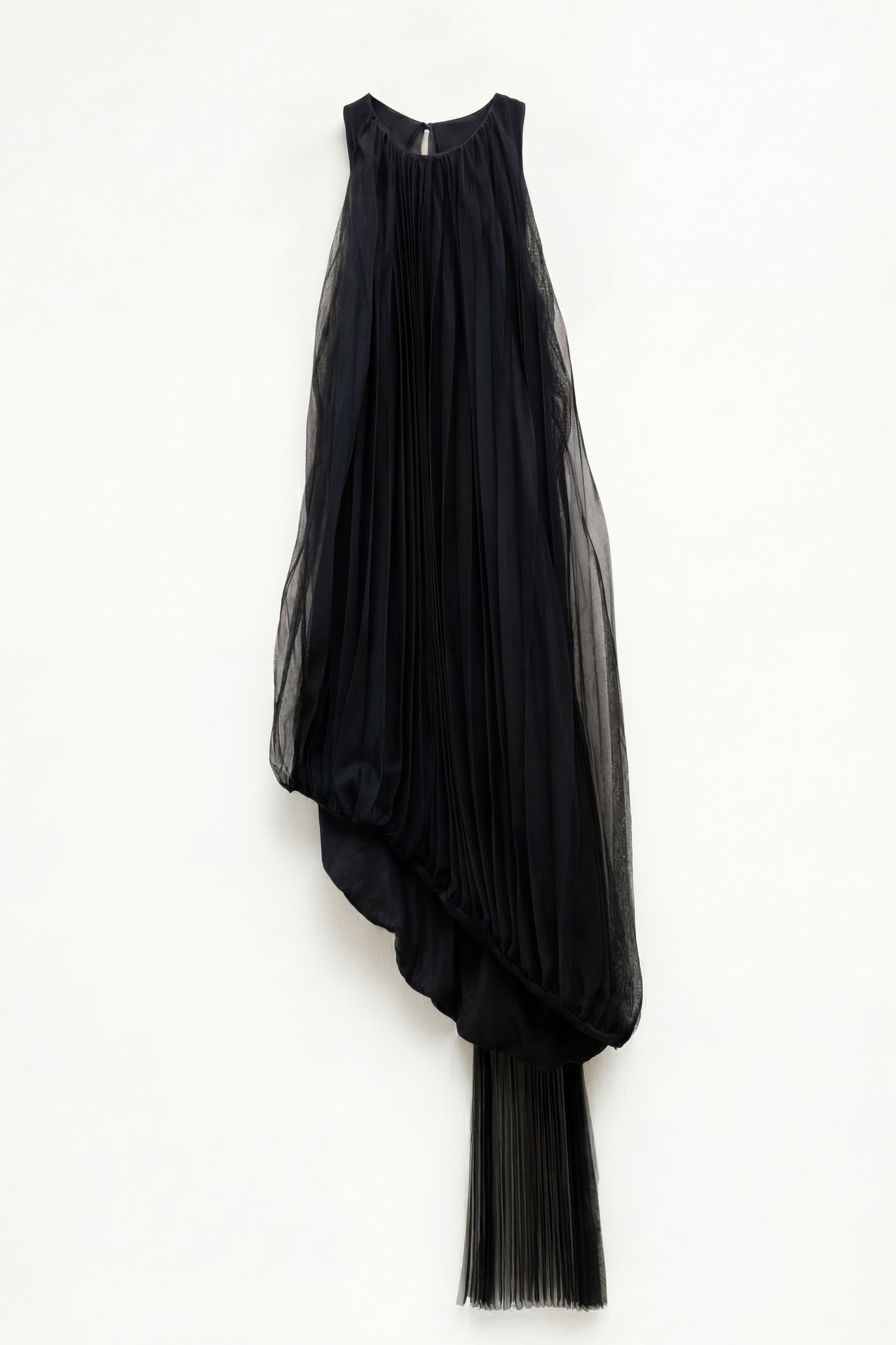 Abito lungo con struttura a doppio strato. Sottovestito interno in tessuto liscio. Tessuto esterno in tulle leggero plissettato. Scollo rotondo morbido. Modello smanicato. Costruzione asimmetrica con pannello laterale. Apertura a goccia sul retro con chiusura a bottone. Vestibilità regolare, disponibile in taglia UNICA.