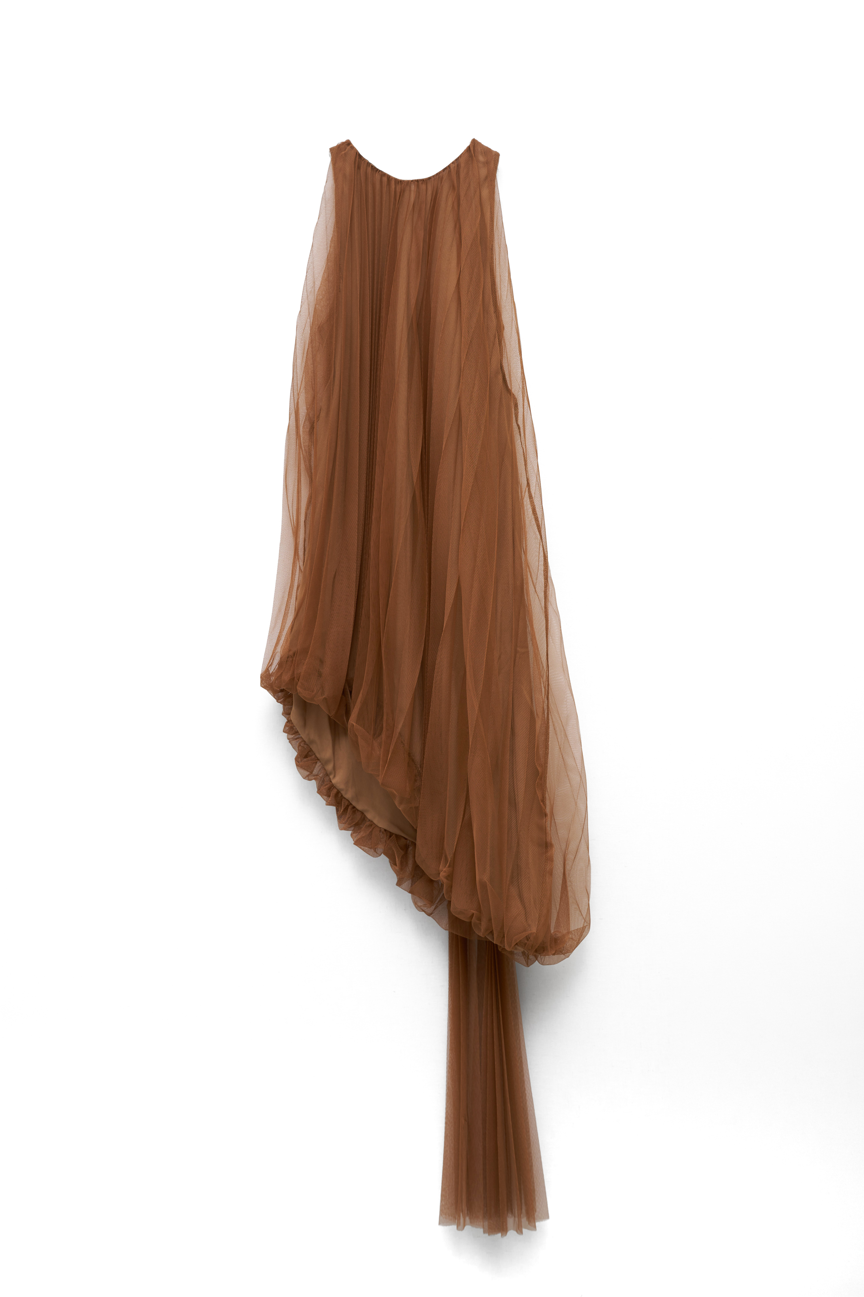 Abito lungo con struttura a doppio strato. Sottovestito interno in tessuto liscio. Tessuto esterno in tulle leggero plissettato. Scollo rotondo morbido. Modello smanicato. Costruzione asimmetrica con pannello laterale. Apertura a goccia sul retro con chiusura a bottone. Vestibilità regolare, disponibile in taglia UNICA.