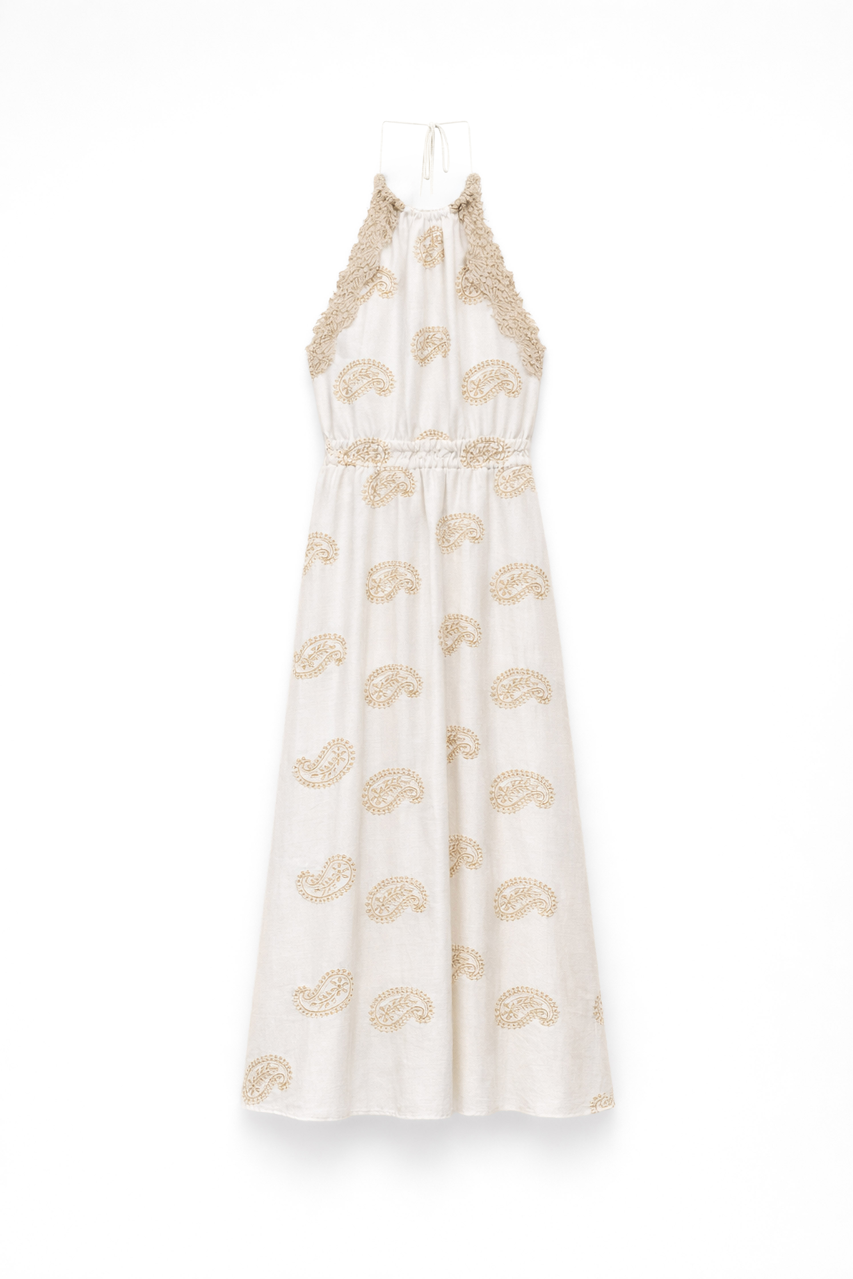 Abito lungo in misto lino con ricami paisley all-over. Scollo halter con laccetti regolabili e nappine decorative. Inserti in pizzo a contrasto nella parte superiore. Punta vita elasticizzato. Gonna lunga ampia e svasata. Vestibilità regolare, disponibile in taglia S/M, M/L.