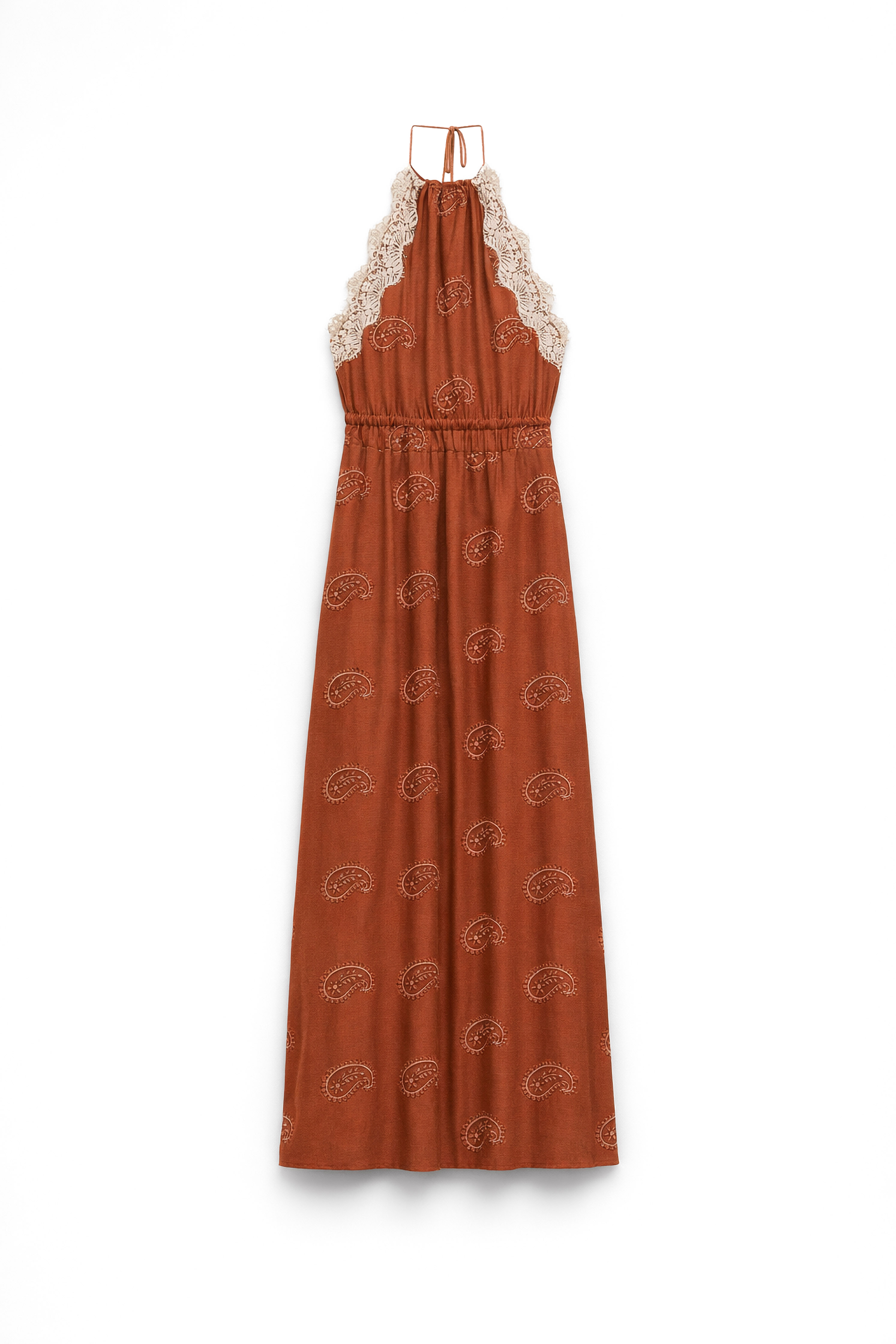 Abito lungo in misto lino con ricami paisley all-over. Scollo halter con laccetti regolabili e nappine decorative. Inserti in pizzo a contrasto nella parte superiore. Punta vita elasticizzato. Gonna lunga ampia e svasata. Vestibilità regolare, disponibile in taglia S/M, M/L.