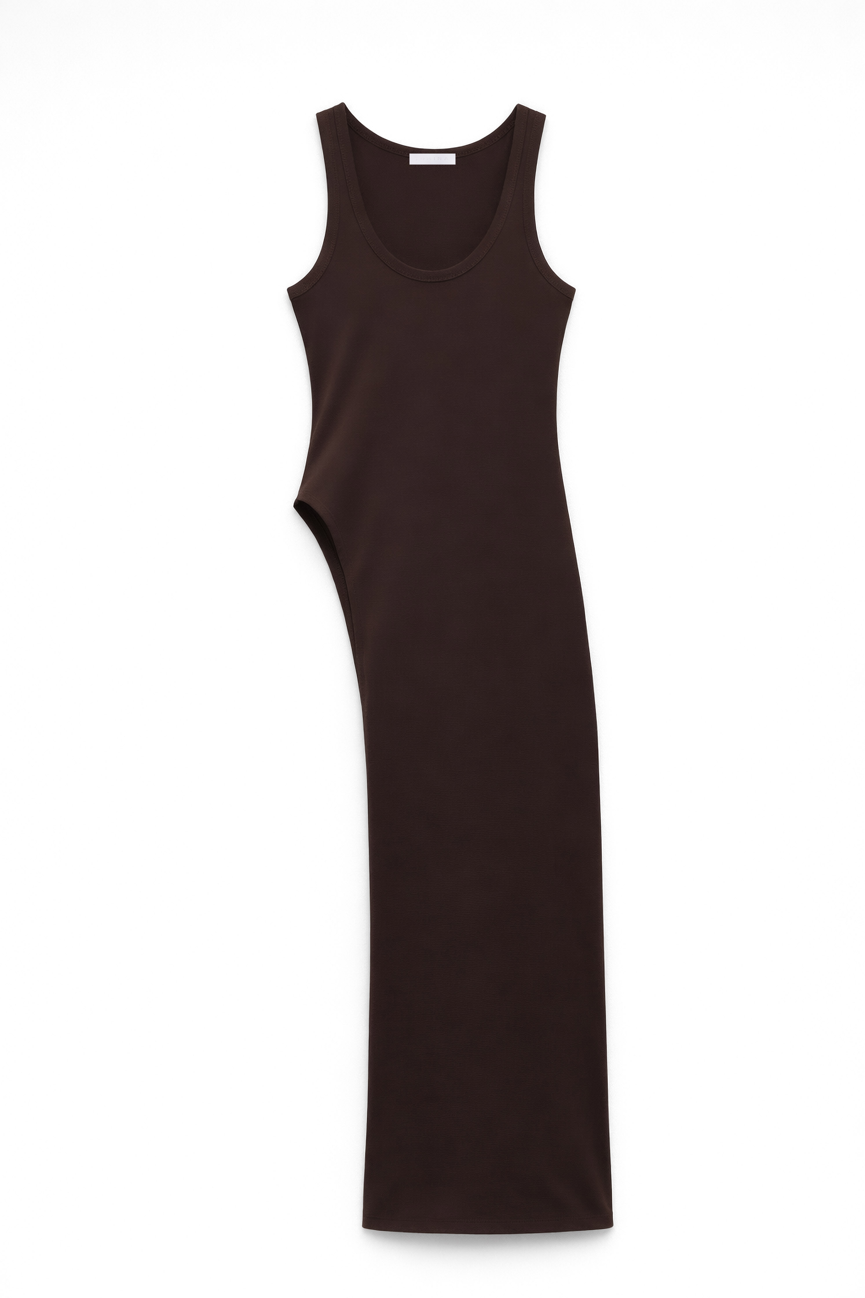 Abito lungo in jersey di cotone elasticizzato. Scollo rotondo. Senza maniche con spalla larga. Dettaglio spacco laterale lungo. Vestibilità aderente, disponibile in taglia S/M, M/L.
