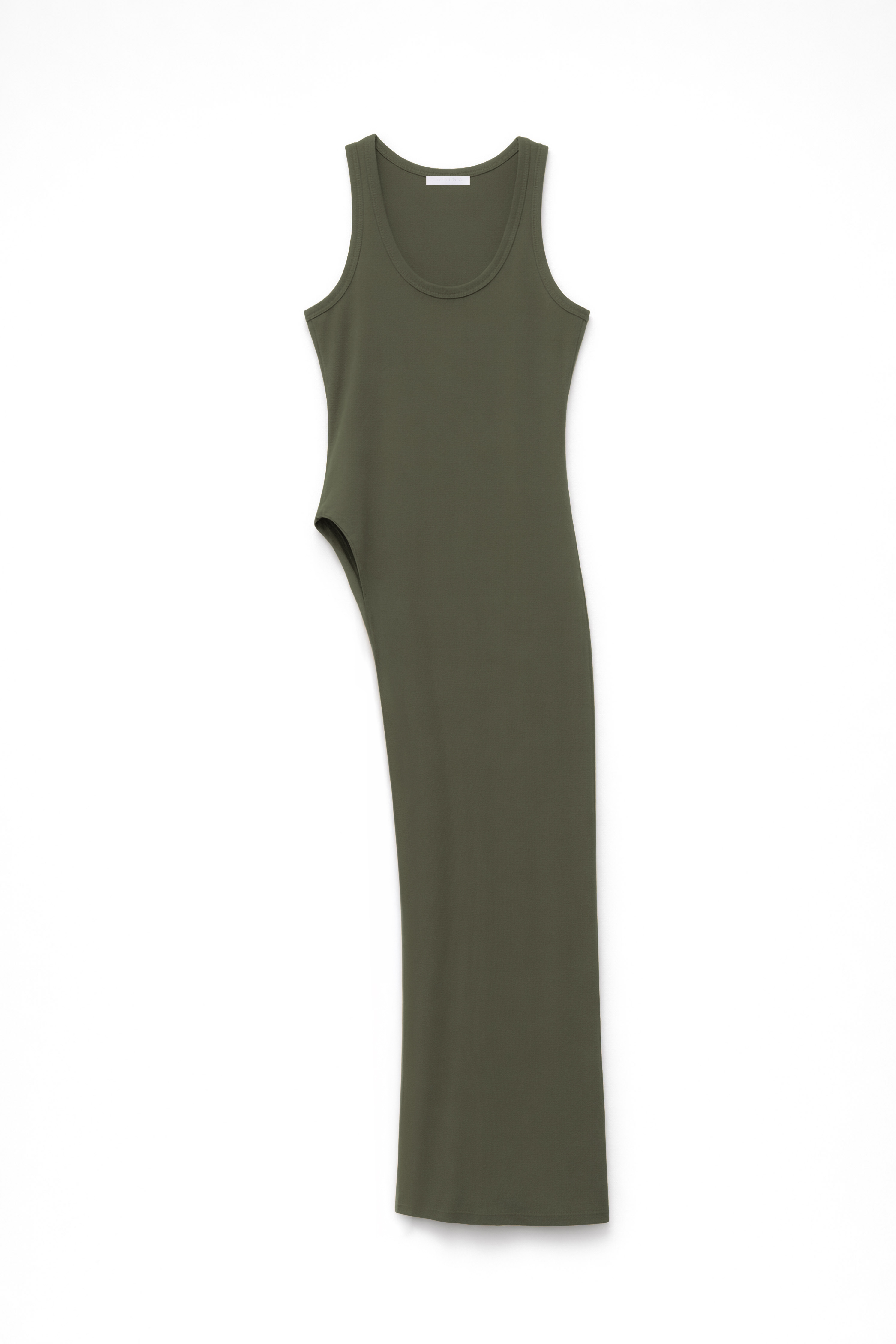 Abito lungo in jersey di cotone elasticizzato. Scollo rotondo. Senza maniche con spalla larga. Dettaglio spacco laterale lungo. Vestibilità aderente, disponibile in taglia S/M, M/L.