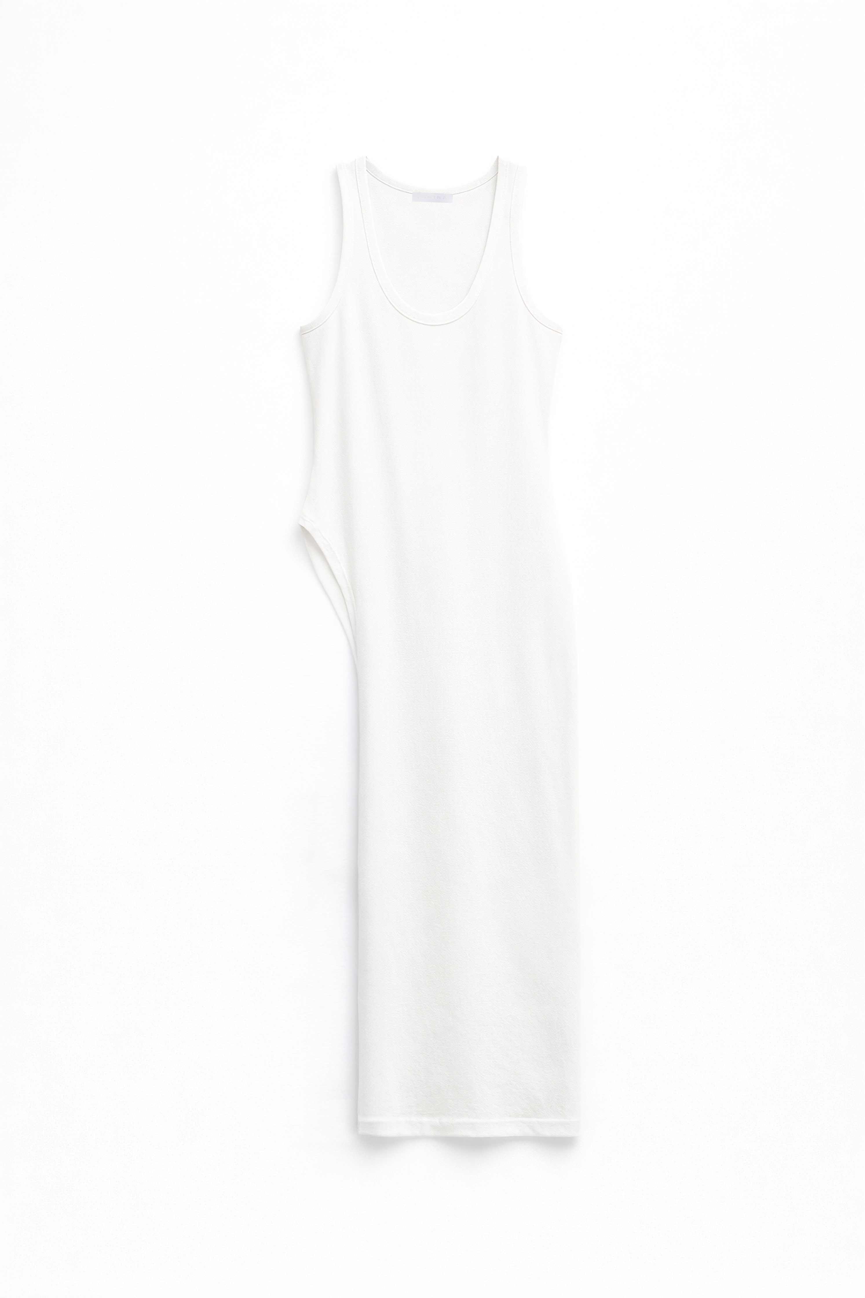 Abito lungo in jersey di cotone elasticizzato. Scollo rotondo. Senza maniche con spalla larga. Dettaglio spacco laterale lungo. Vestibilità aderente, disponibile in taglia S/M, M/L.