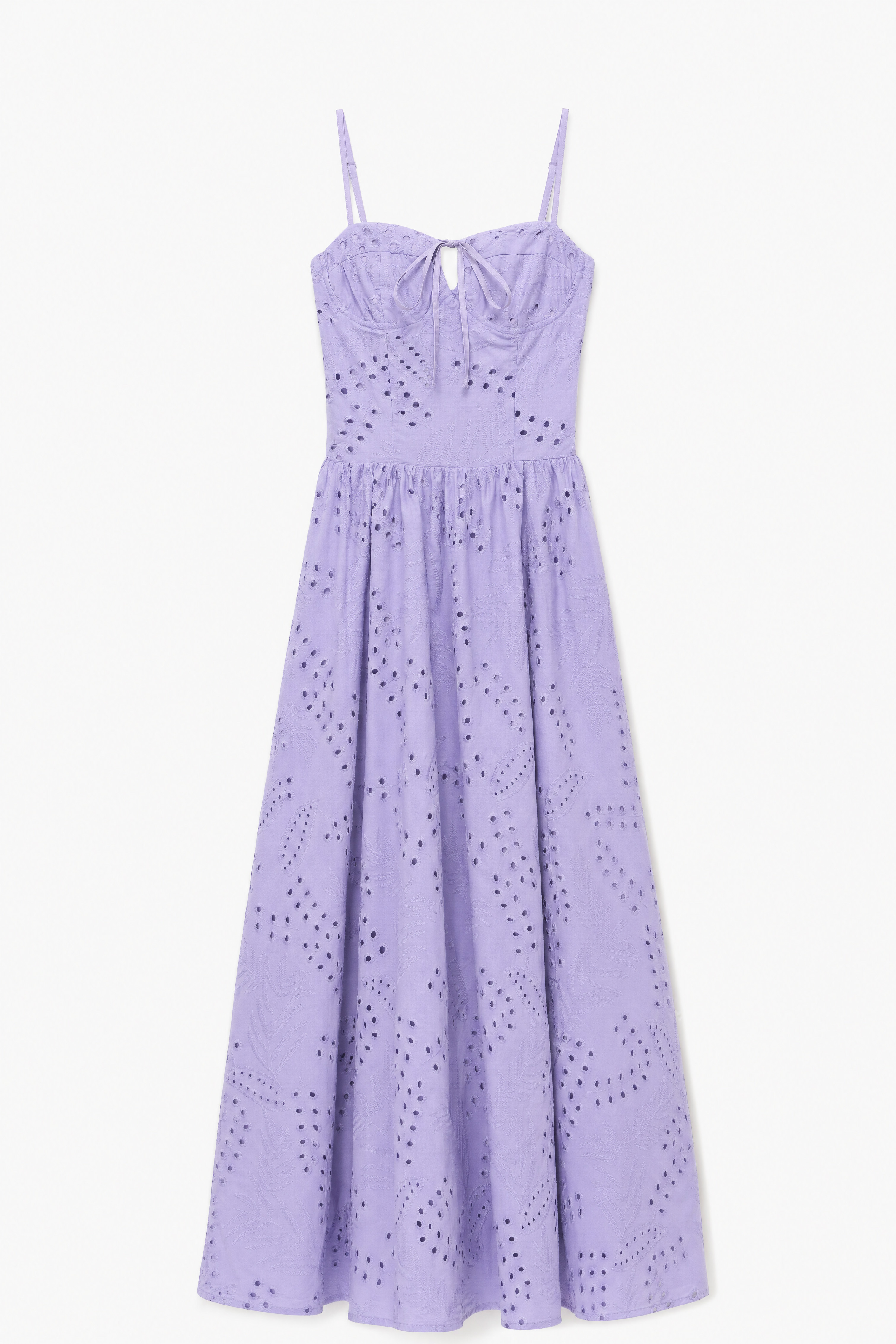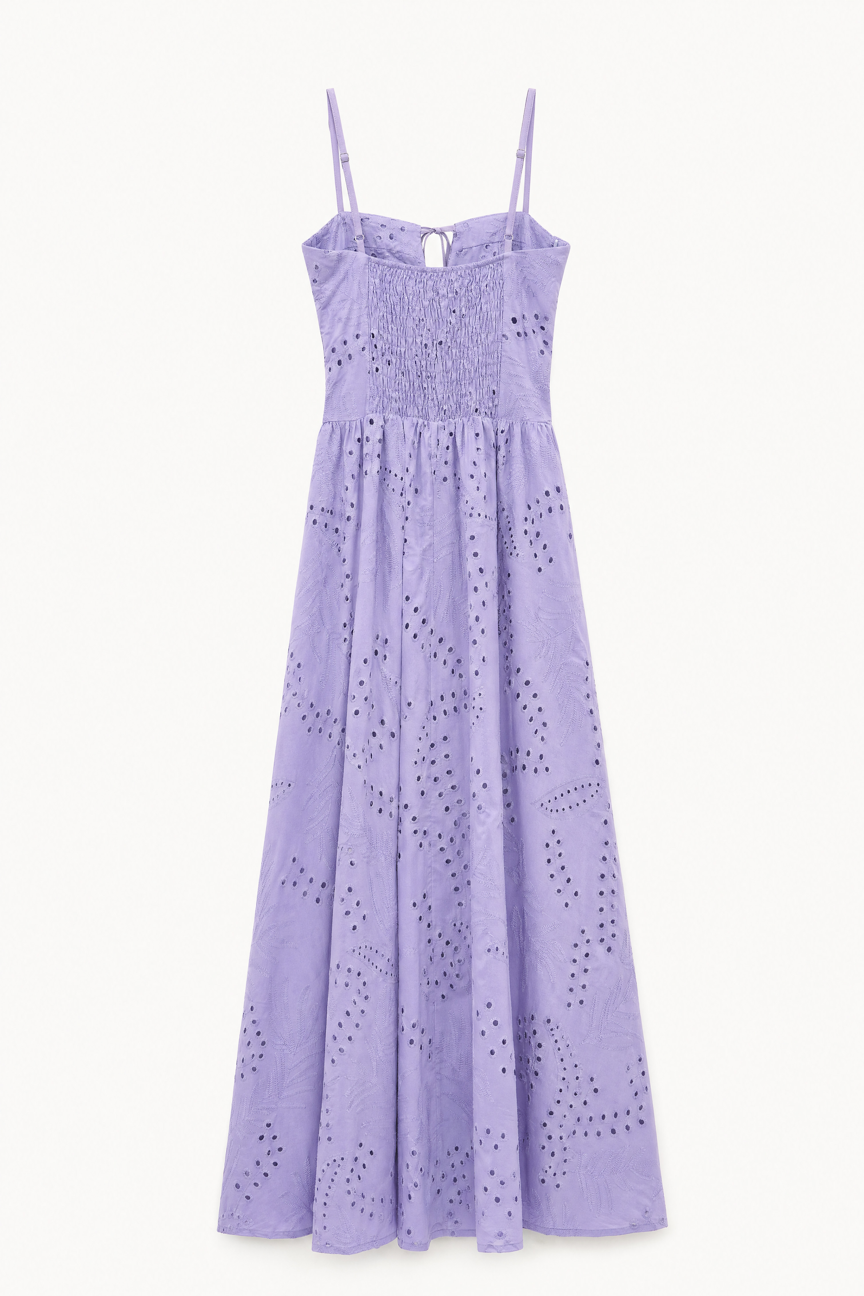 Abito lungo in sangallo con ricami traforati. Scollo a cuore con struttura bustier. Spalline sottili regolabili. Fodera interna. Dettaglio laccetto frontale decorativo. Schiena con inserto elasticizzato. Chiusura laterale con zip invisibile. Vestibilità regolare, disponibile in taglia S, M, L.