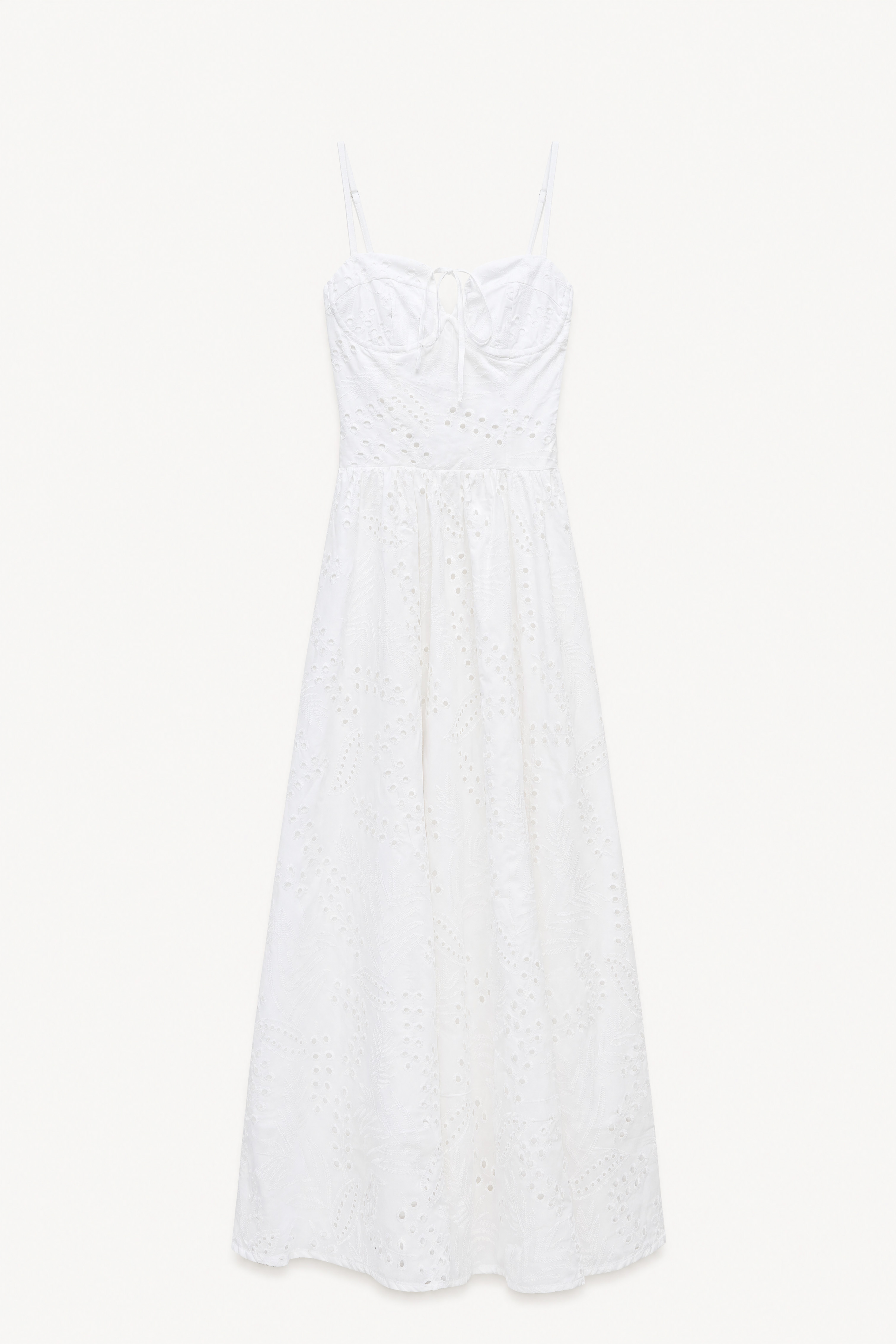Abito lungo in sangallo con ricami traforati. Scollo a cuore con struttura bustier. Spalline sottili regolabili. Fodera interna. Dettaglio laccetto frontale decorativo. Schiena con inserto elasticizzato. Chiusura laterale con zip invisibile. Vestibilità regolare, disponibile in taglia S, M, L.