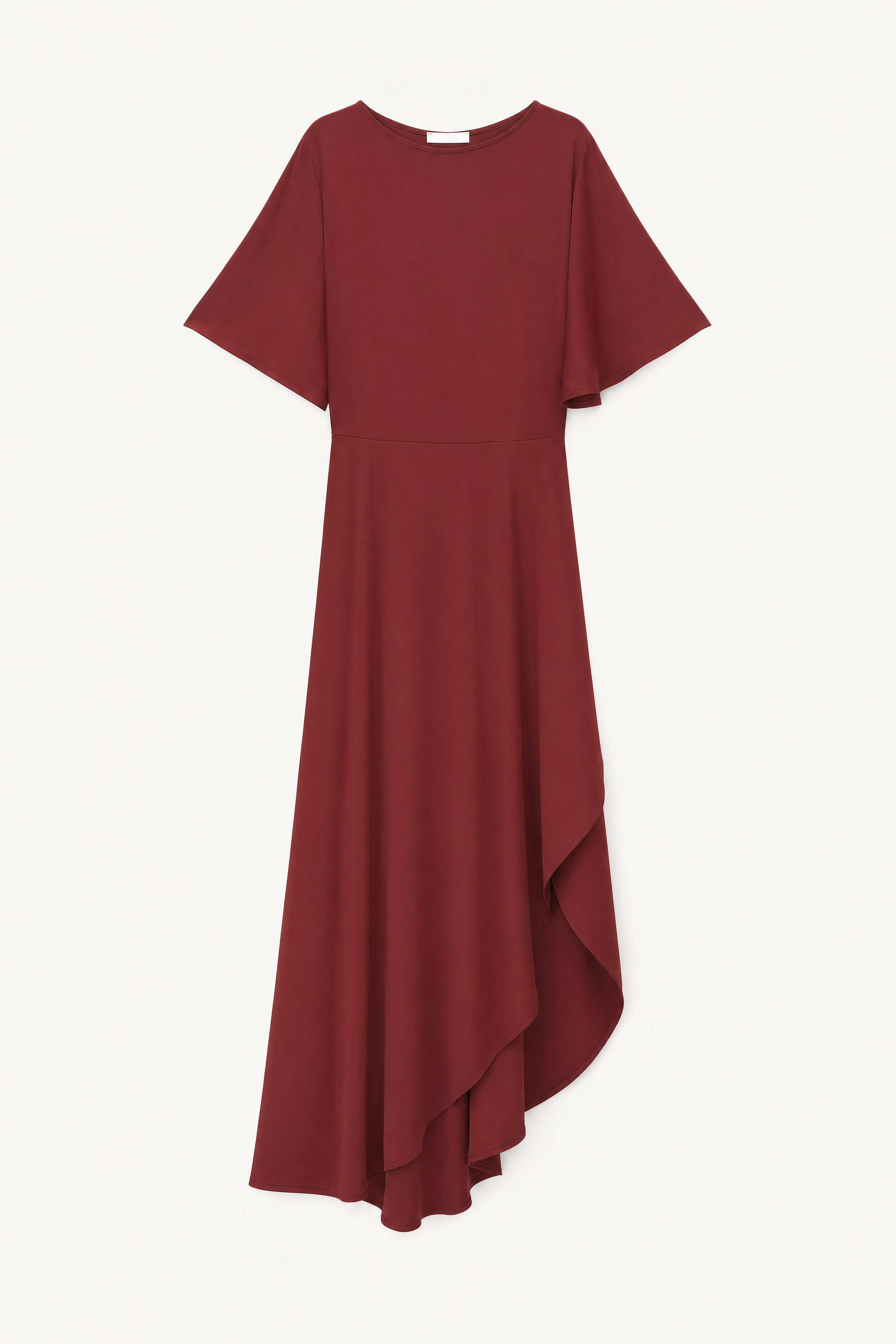 Abito lungo con scollo ampio arrotondato. Costruzione con cuciture verticali modellanti. Gonna ampia e svasata con movimento fluido. Chiusura laterali con zip invisibile. Vestibilità regolare, disponibile in taglia S, M, L.