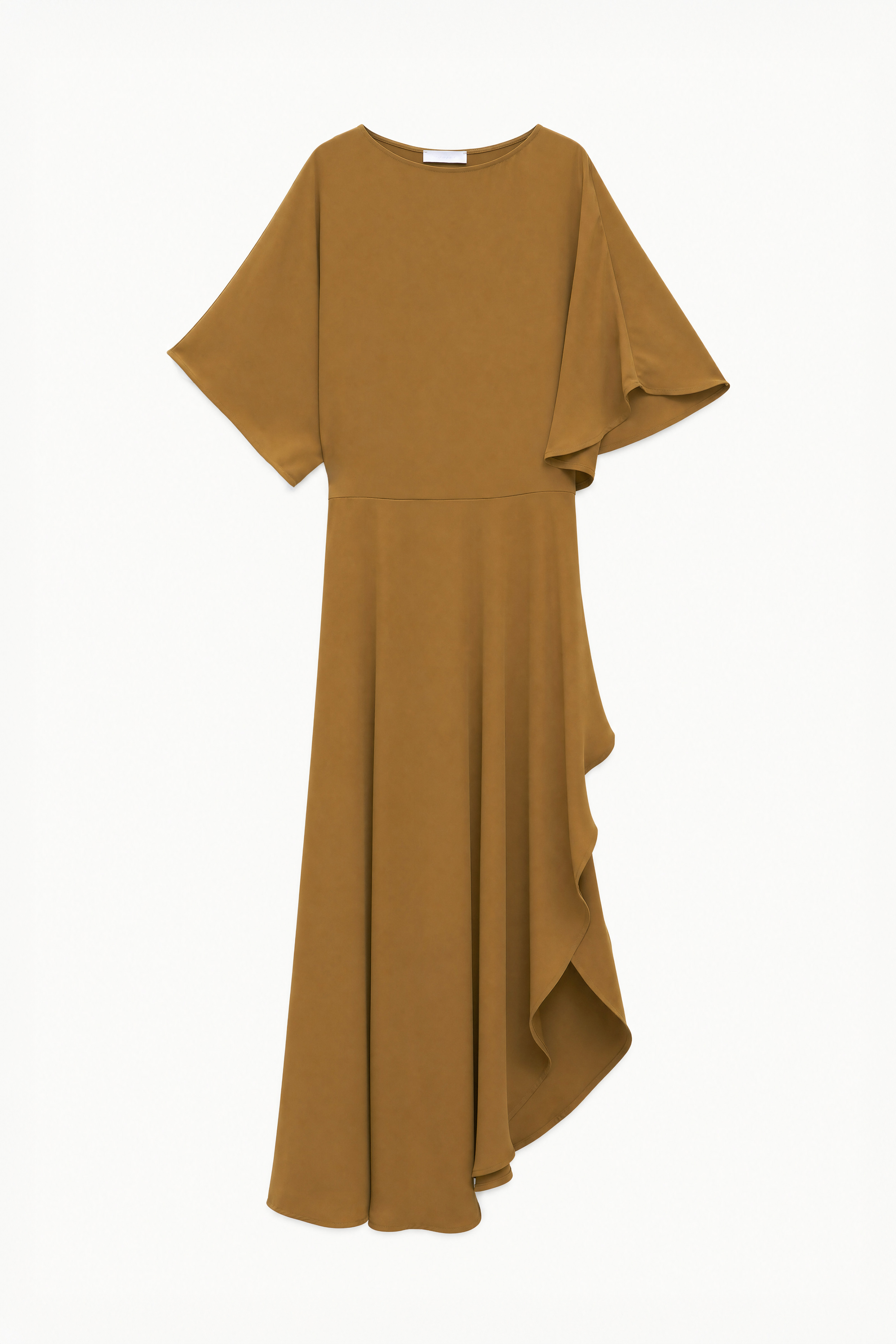 Abito lungo maniche corte ampie a kimono. Costruzione con taglio in vita e gonna lunga. Gonna con pannello asimmetrico sovrapposto. Chiusura laterale regolabile con bottoni esterni ed interni. Vestibilità regolare, disponibile in taglia S/M, M/L.