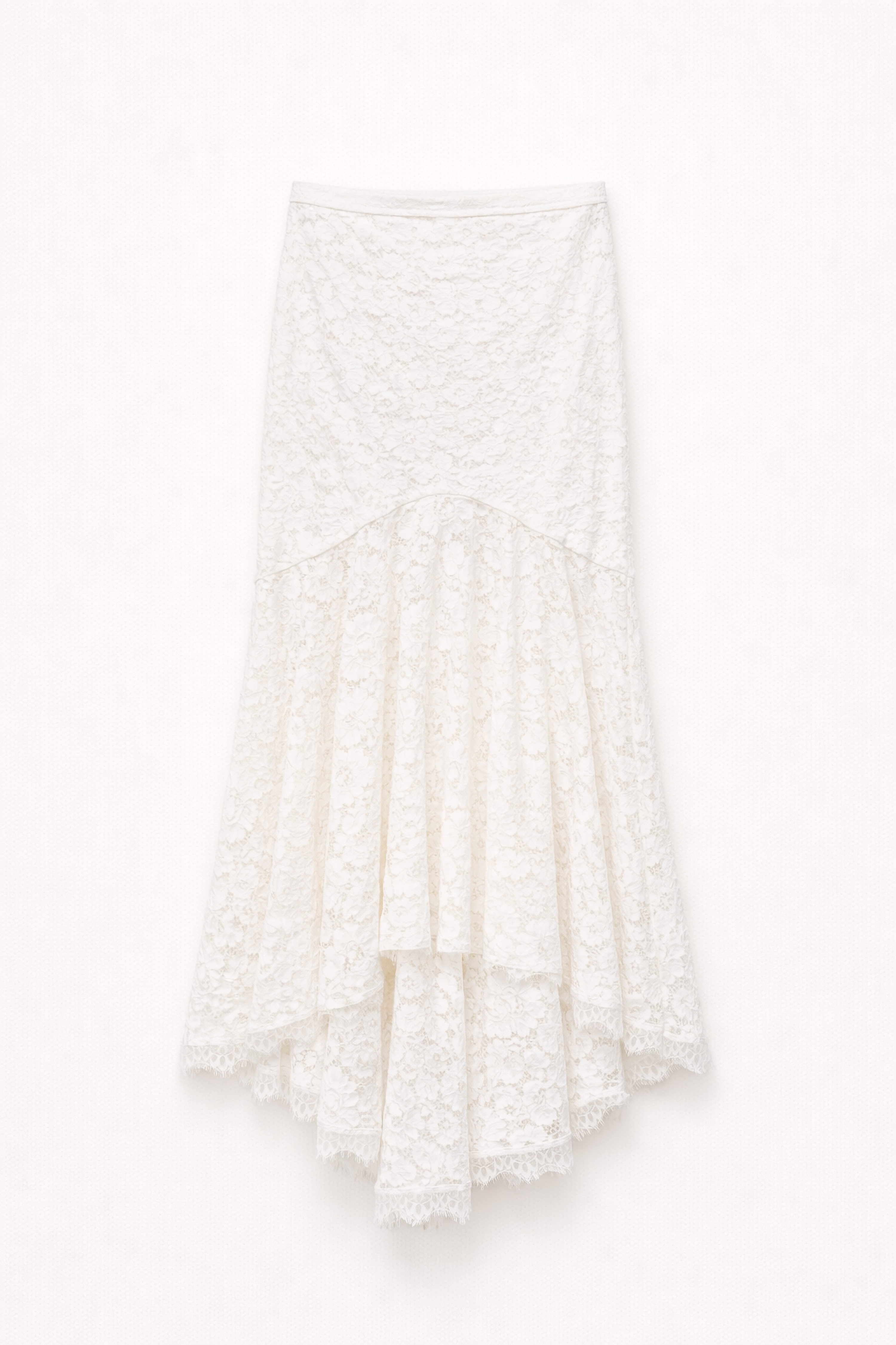 Gonna lunga in pizzo floreale. Vita alta con fascia liscia strutturata. Presenta sottogonna interna. Chiusura laterale con zip invisibile. Vestibilità regolare, disponibile in taglia S, M, L.