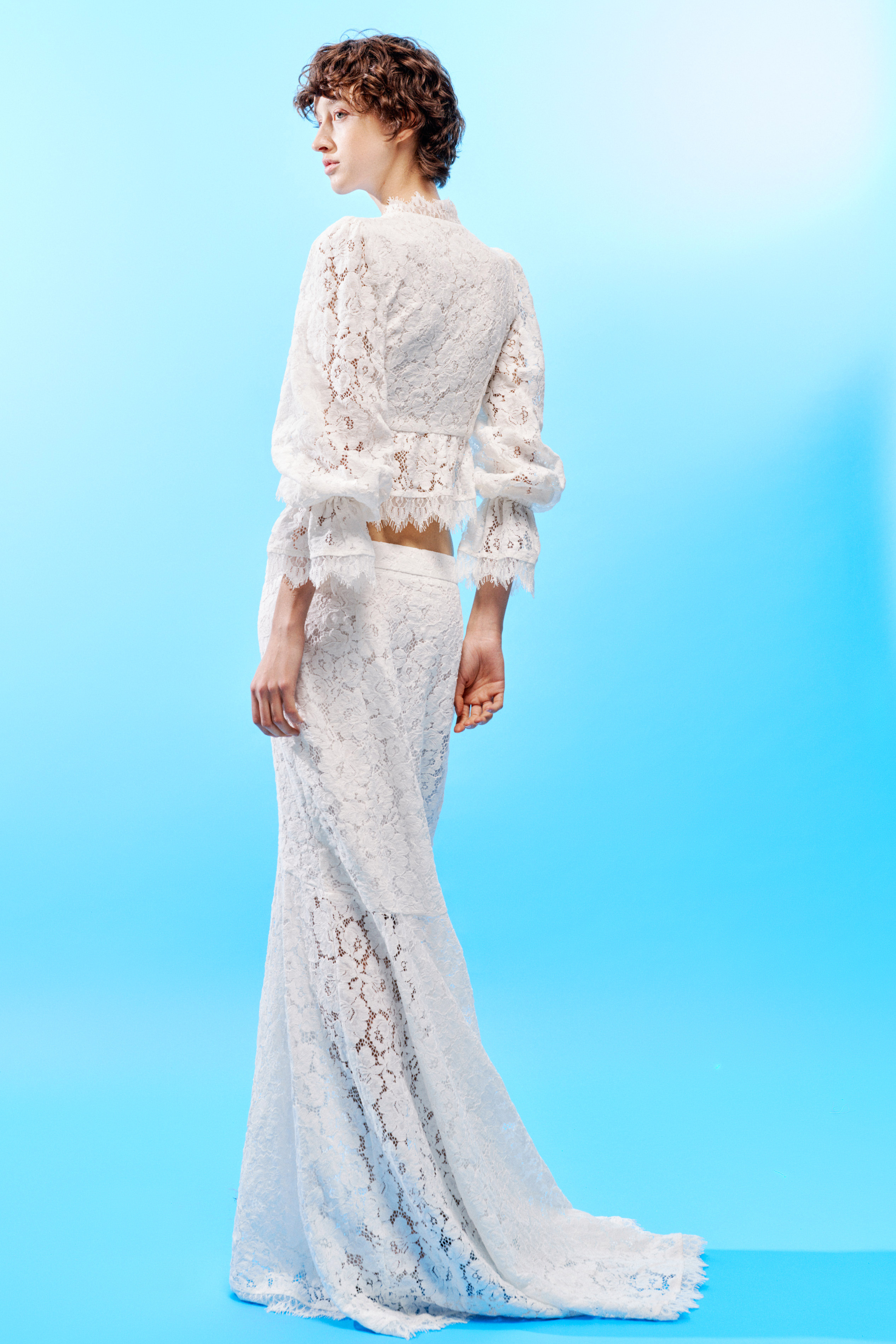 Abito lungo in pizzo floreale misto cotone. Corpetto strutturato con coppe sagomate. Gonna ampia con balza applicata. Fondi rifiniti con bordi smerlati. Chiusura posteriore con cerniera invisibile. Vestibilità regolare, disponibile in taglia S, M, L.