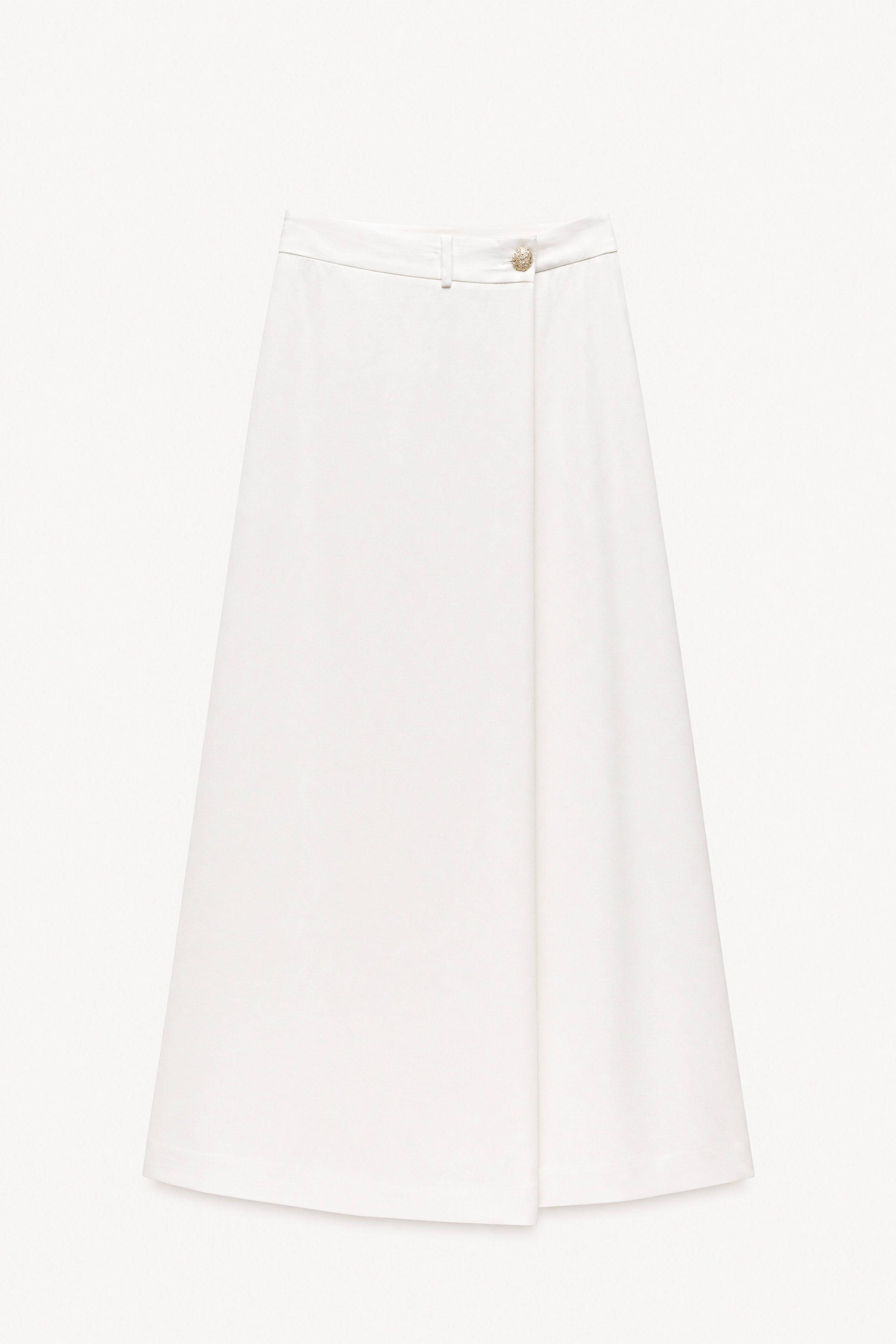 Gonna maxi in misto lino fiammato. Vita alta strutturata con passanti per cintura. Dettaglio costruzione incrociata frontale. Tasche laterali inserite. Tasche posteriori a filetto. Chiusura a portafoglio con bottone gioiello e bottone interno. Vestibilità regolare, disponibile in taglia S, M, L.