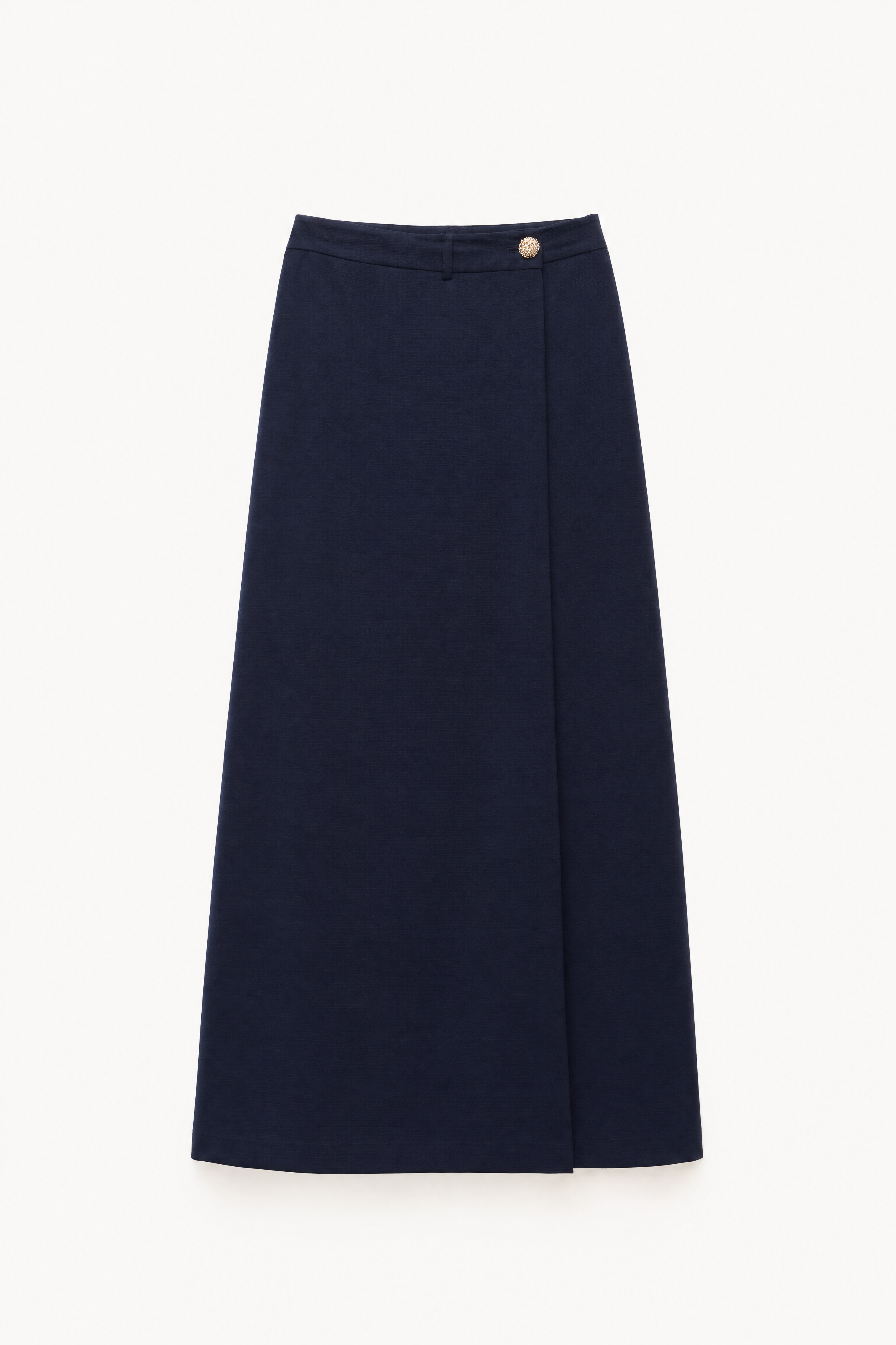 Gonna maxi in misto lino fiammato. Vita alta strutturata con passanti per cintura. Dettaglio costruzione incrociata frontale. Tasche laterali inserite. Tasche posteriori a filetto. Chiusura a portafoglio con bottone gioiello e bottone interno. Vestibilità regolare, disponibile in taglia S, M, L.