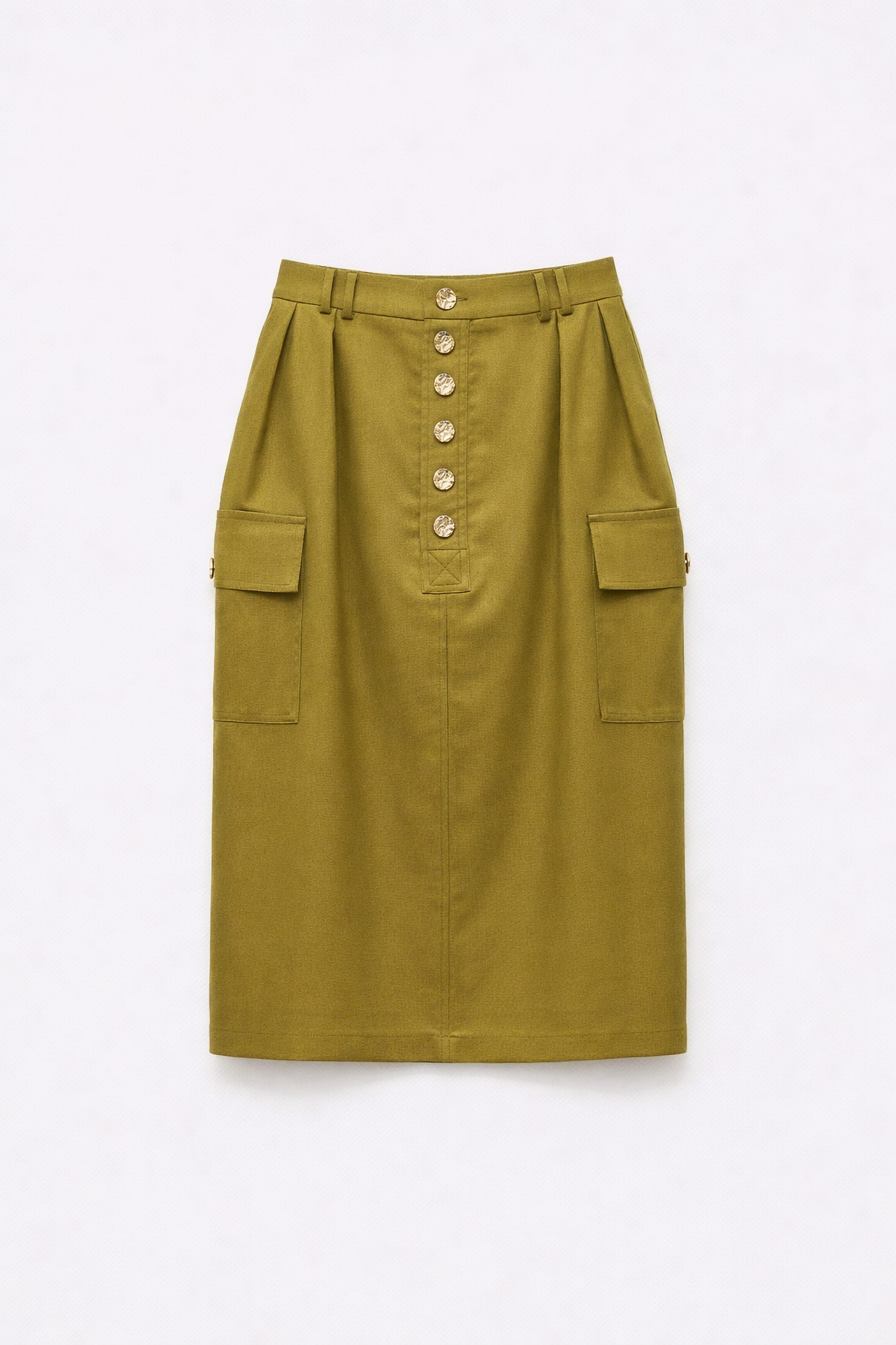 Gonna midi realizzata in tessuto misto lino. Vita regolare con passanti. Pinces sul davanti. Tasche laterali applicate con patta. Chiusura frontale con bottoni. Vestibilità regolare, disponibile in taglia S, M, L.