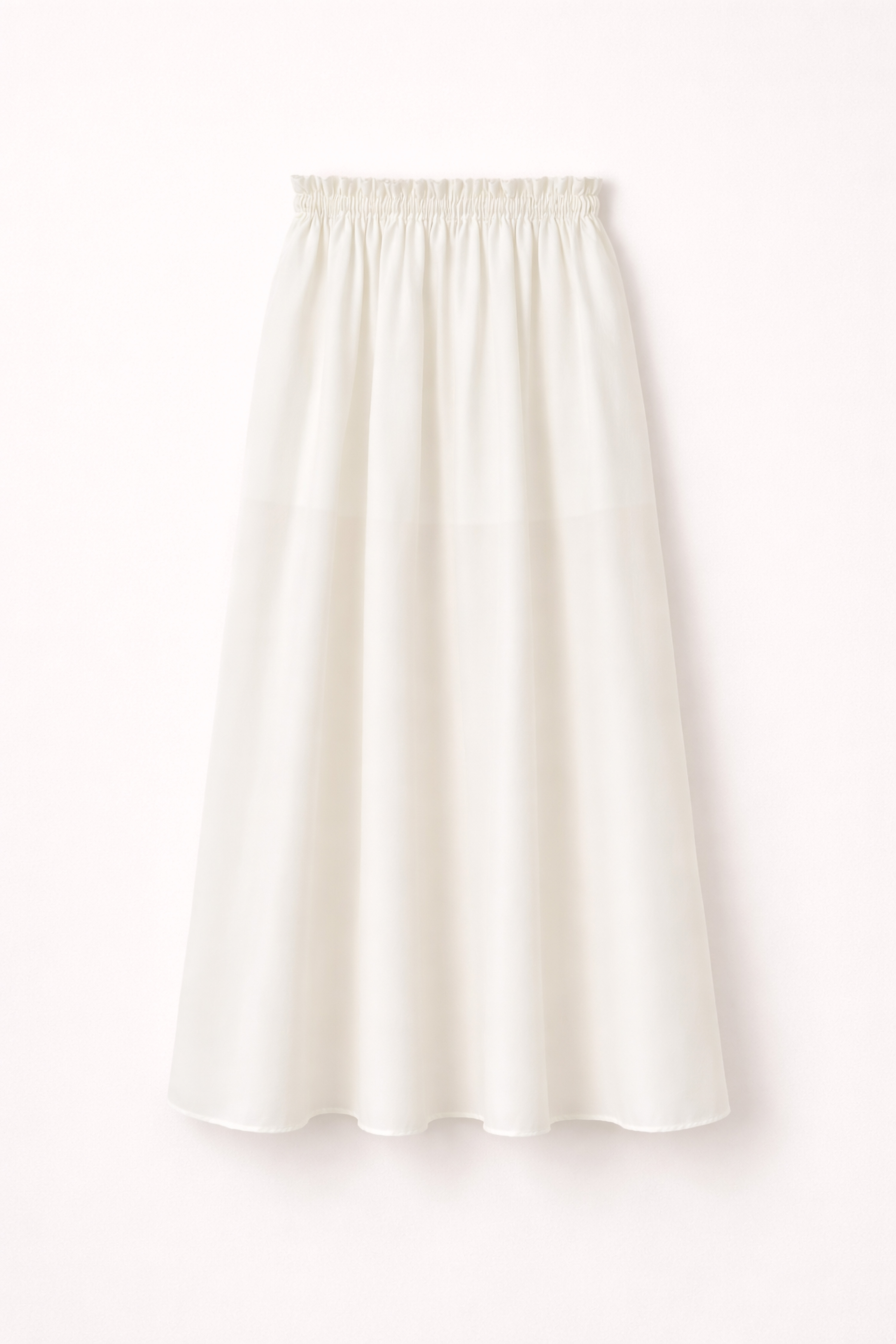 Gonna midi in tessuto misto lyocell. Vita alta con elastico arricciato. Tasche laterali inserite nei fianchi. Linea ampia e leggermente svasata. Vestibilità regolare, disponibile in taglia S/M, M/L.