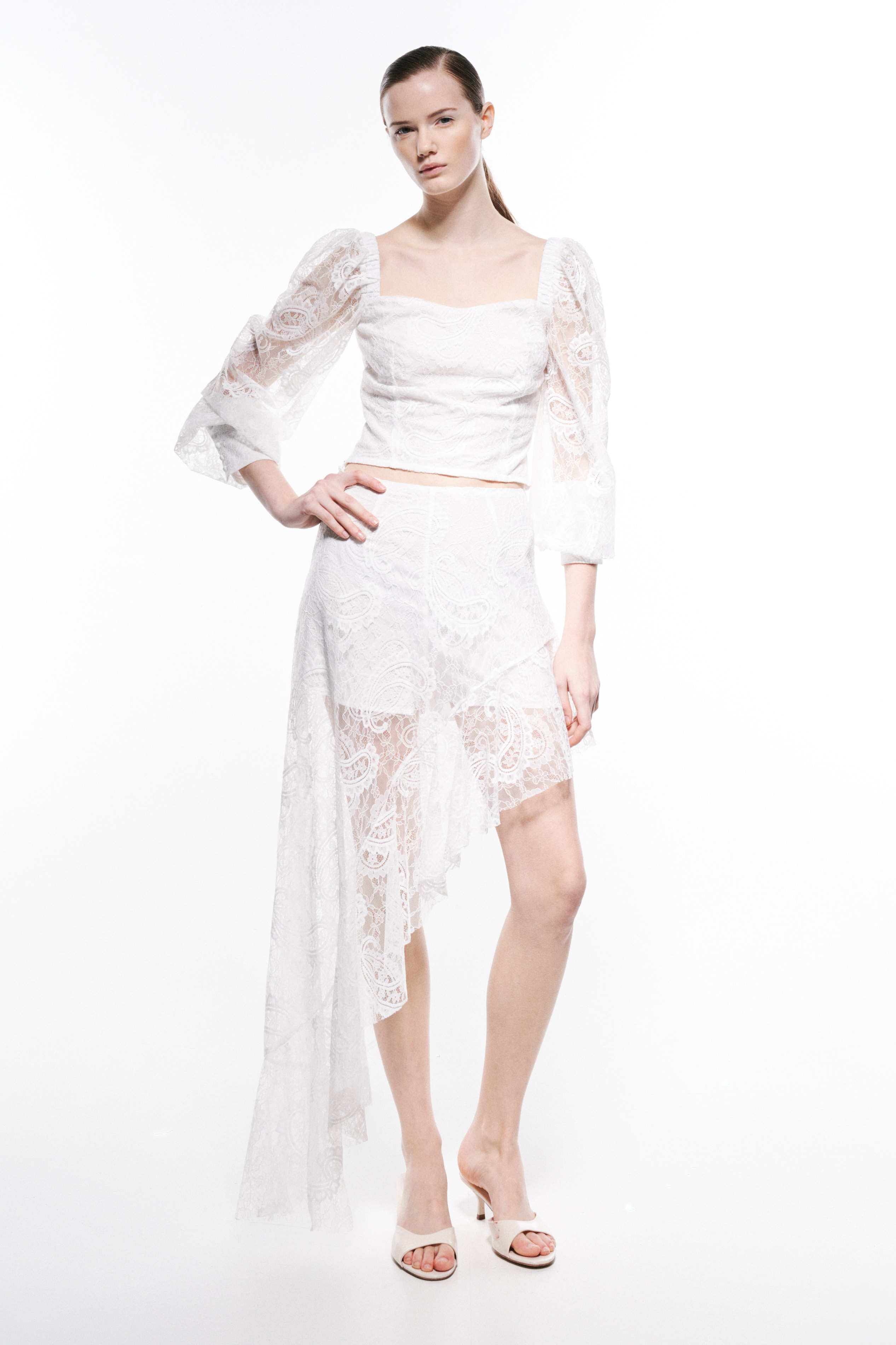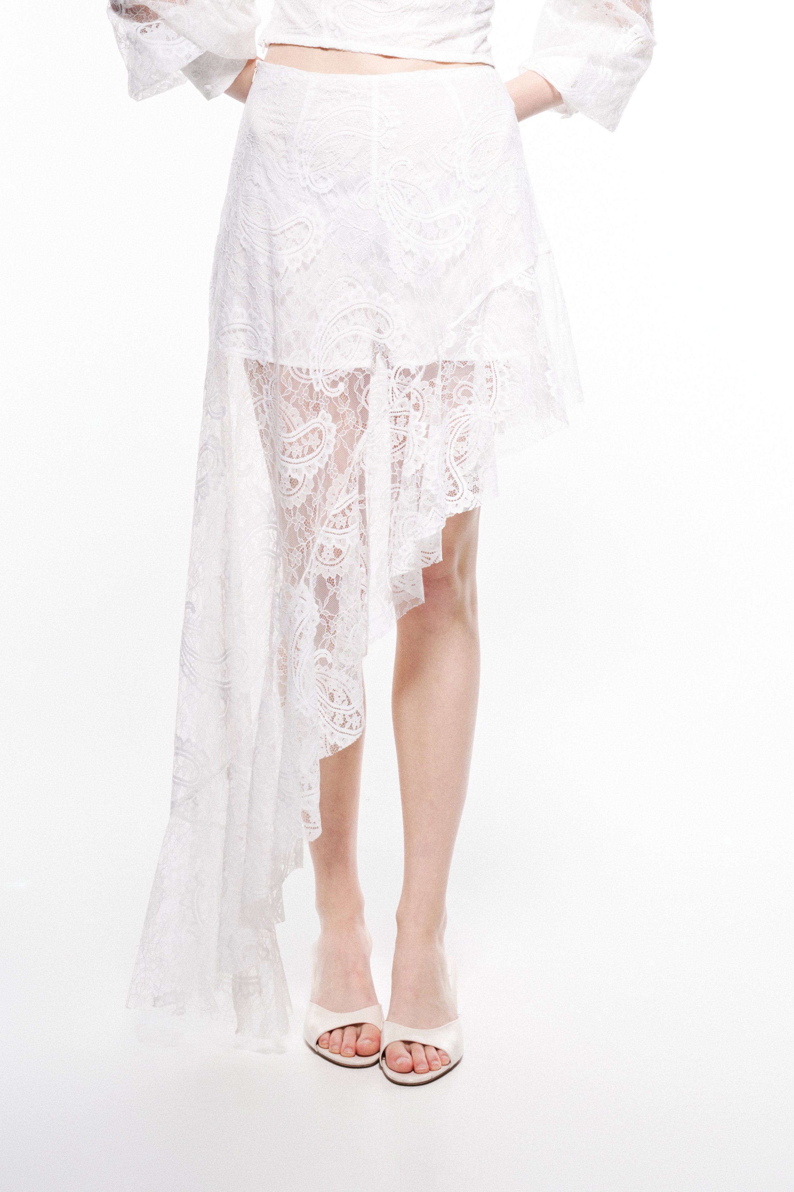 Gonna pareo in pizzo con motivo paisley e floreale.