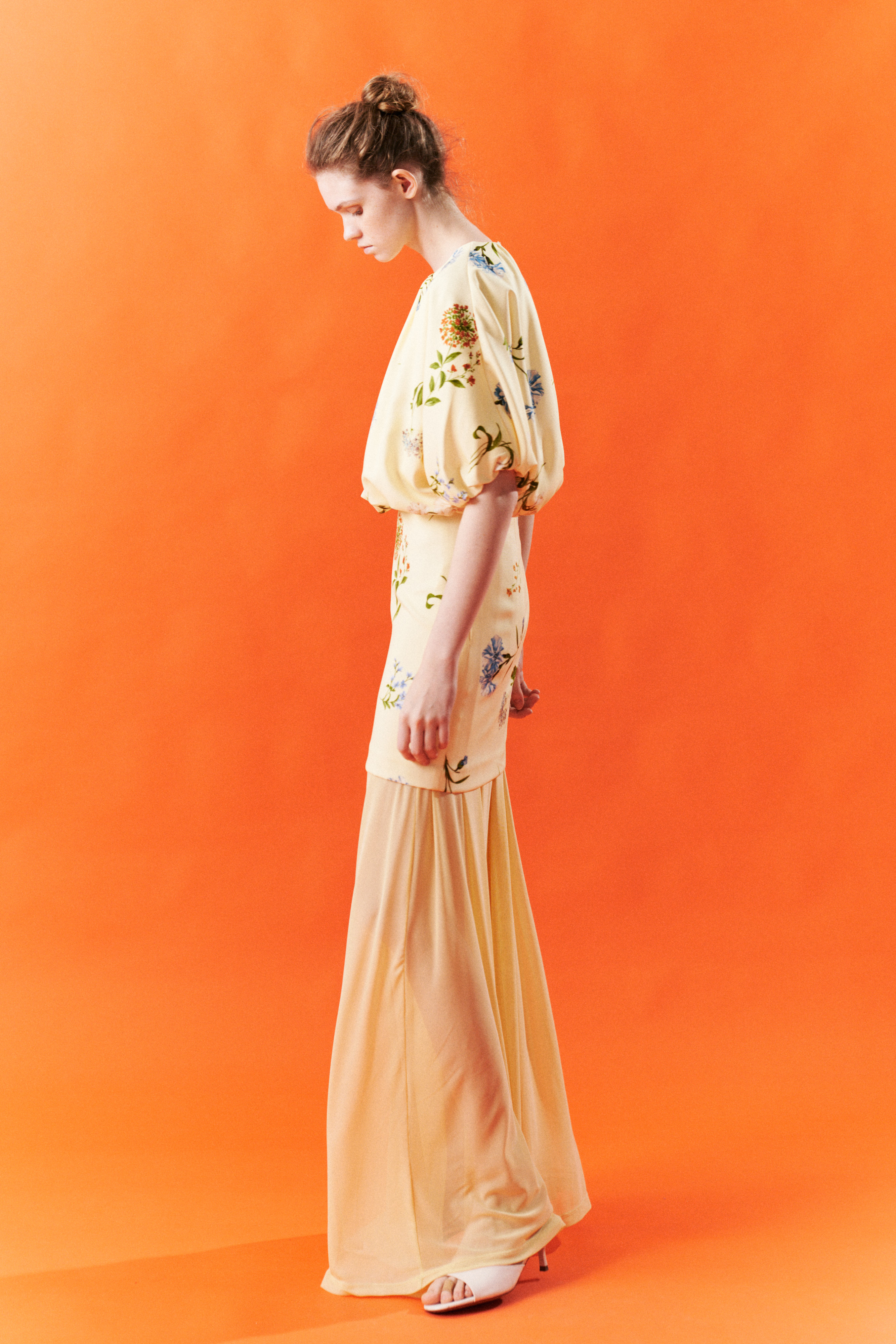 Abito mini bustier con stampa floreale. Scollo a cuore e spalline sottili regolabili. Corpetto con cuciture verticali modellanti. Parte inferiore con gonna effetto balloon. Chiusura frontale con ganci metallici interni. Chiusura posteriore con zip invisibile. Vestibilità regolare, disponibile in taglia S, M, L.