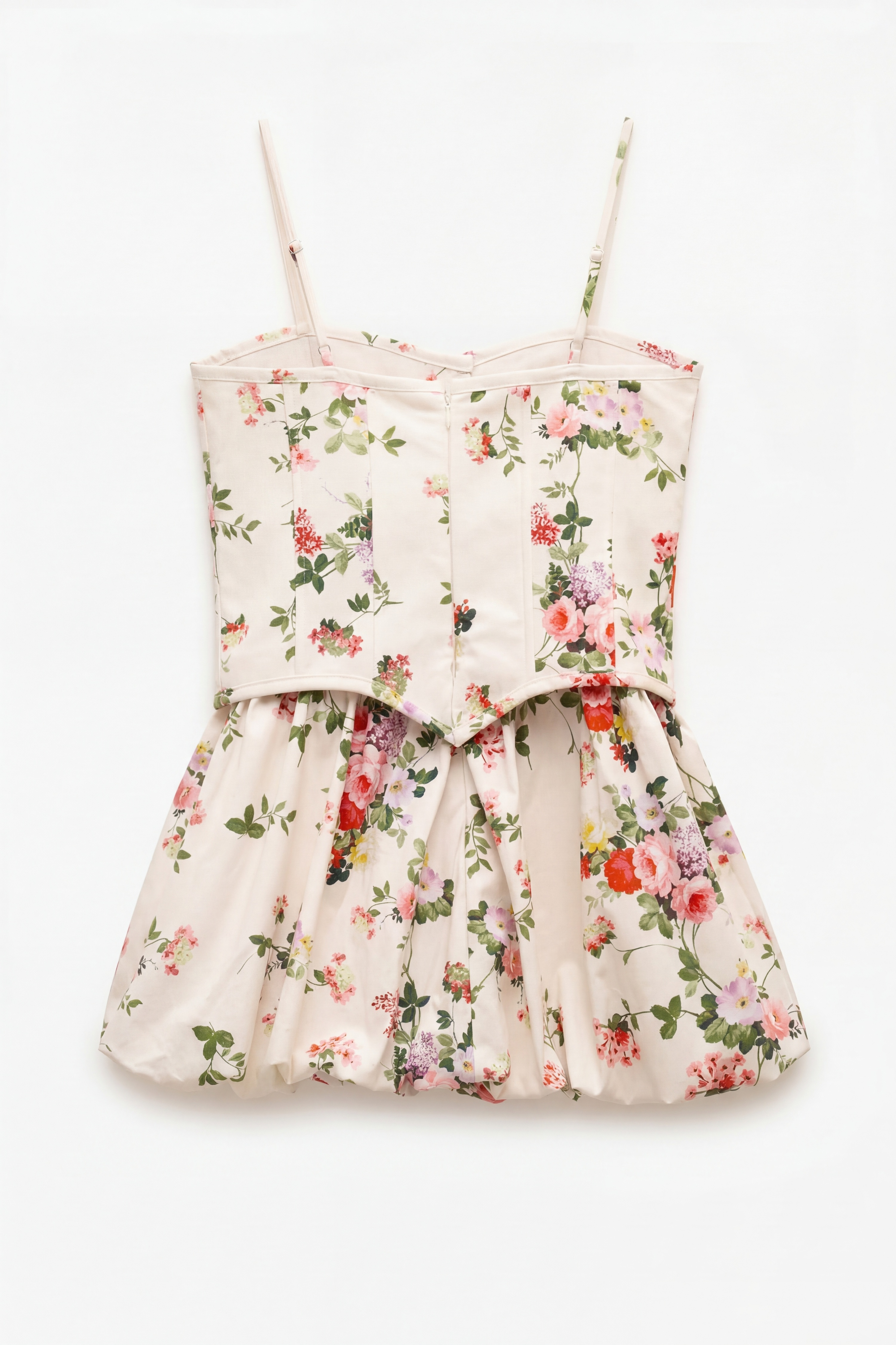 Abito mini bustier con stampa floreale. Scollo a cuore e spalline sottili regolabili. Corpetto con cuciture verticali modellanti. Parte inferiore con gonna effetto balloon. Chiusura frontale con ganci metallici interni. Chiusura posteriore con zip invisibile. Vestibilità regolare, disponibile in taglia S, M, L.