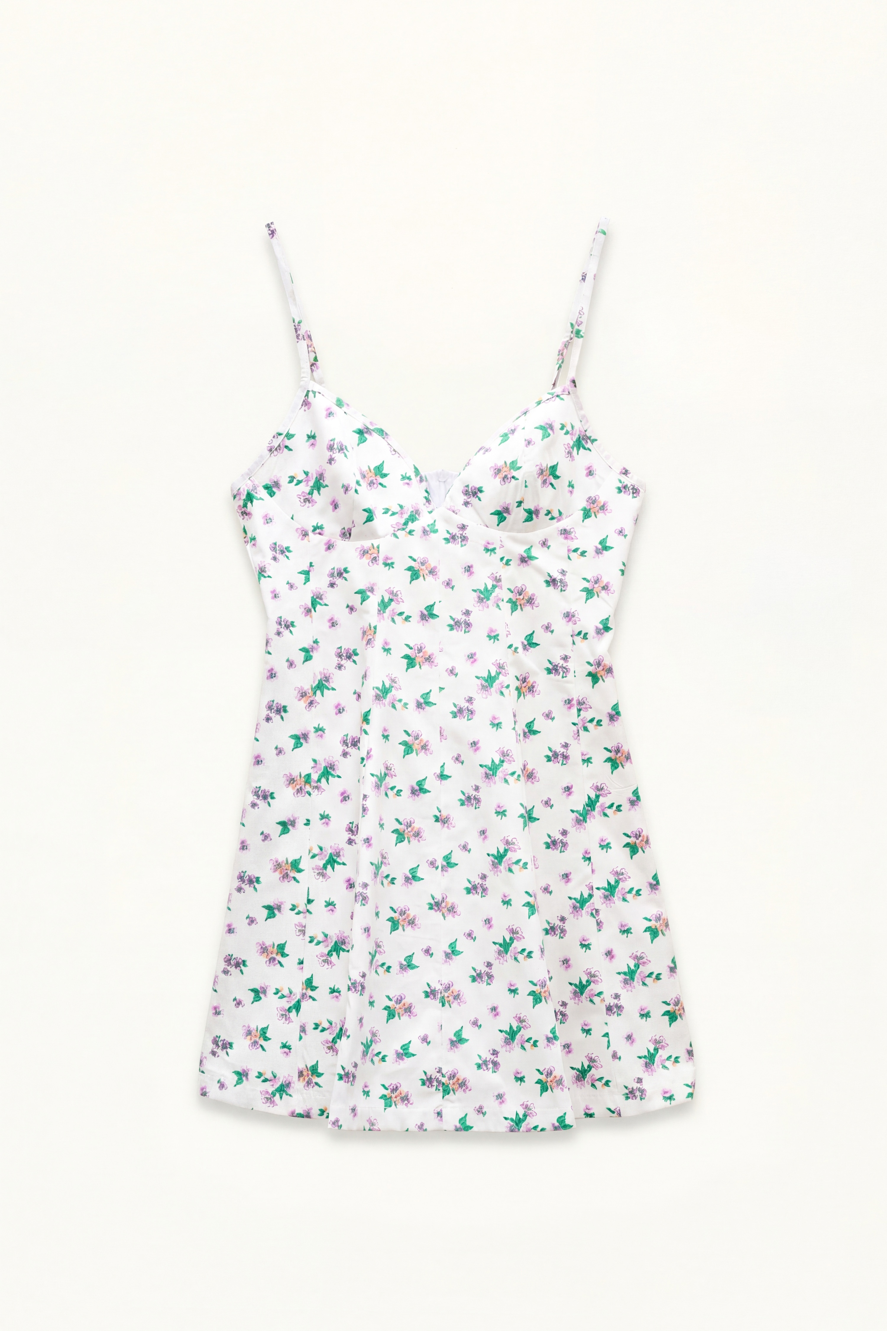 Abito mini con stampa floreale all-over. Scollo a cuore con coppe strutturate. Spalline sottili regolabili. Fodera interna. Corpetto aderente con cuciture sagomate. Chiusura con zip invisibile sul retro. Vestibilità regolare, disponibile in taglia S, M, L.