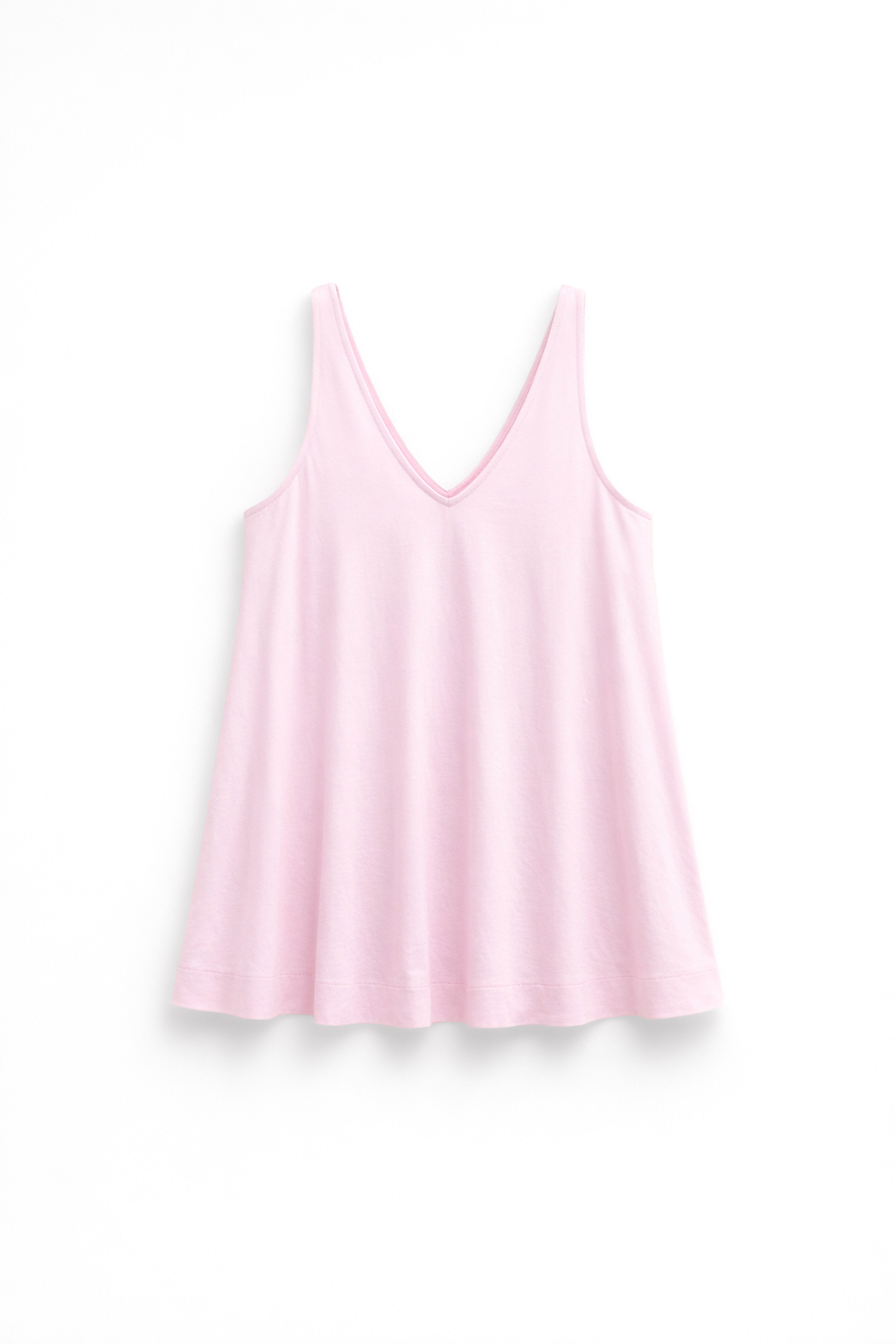 Abito mini realizzato in jersey di cotone. Scollo a V profondo sul davanti e dietro. Costruzione ampia con linea svasata e fondo arrotondato. Cucitura centrale frontale e posteriore. Vestibilità regolare, disponibile in taglia UNICA.