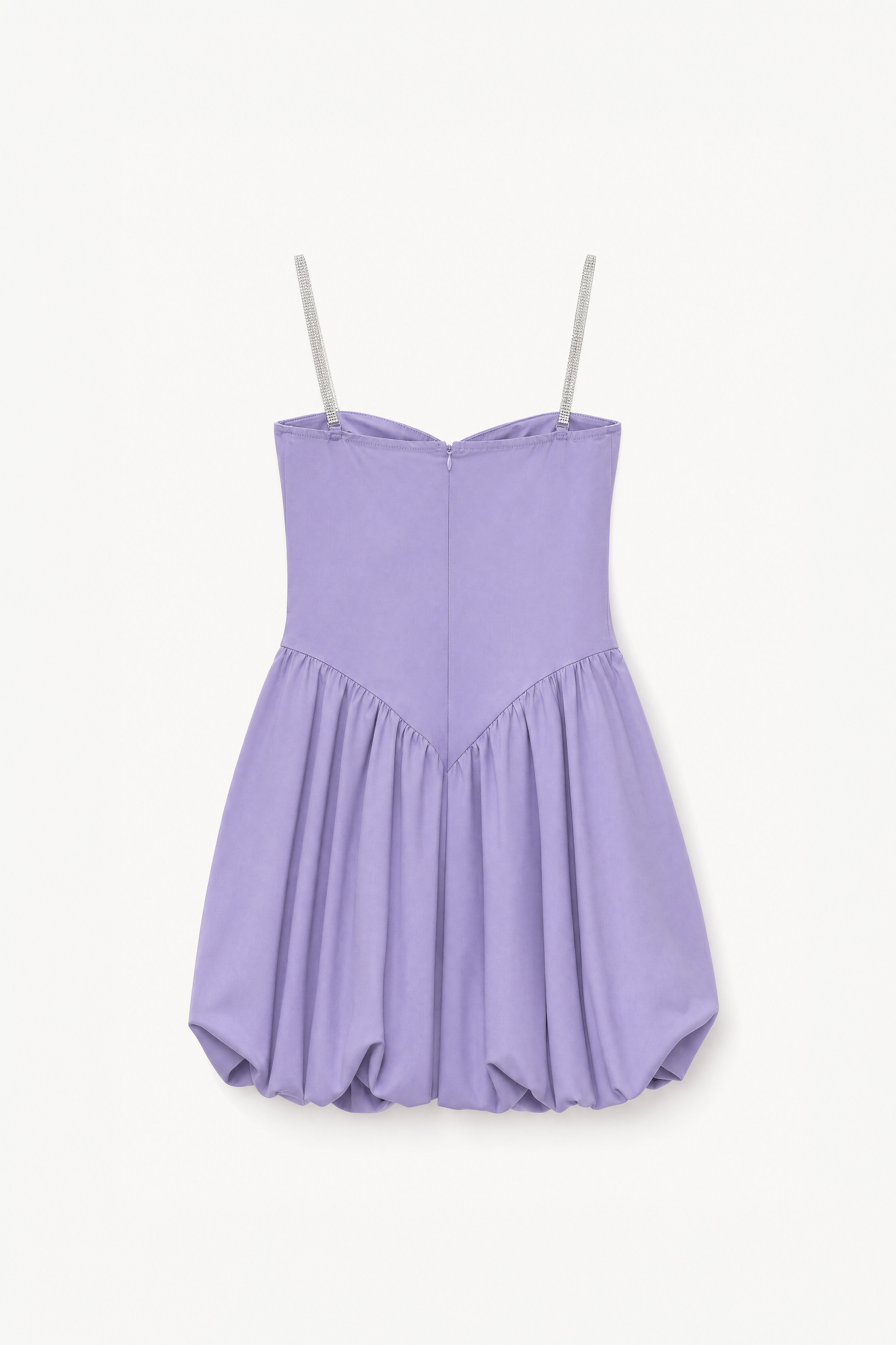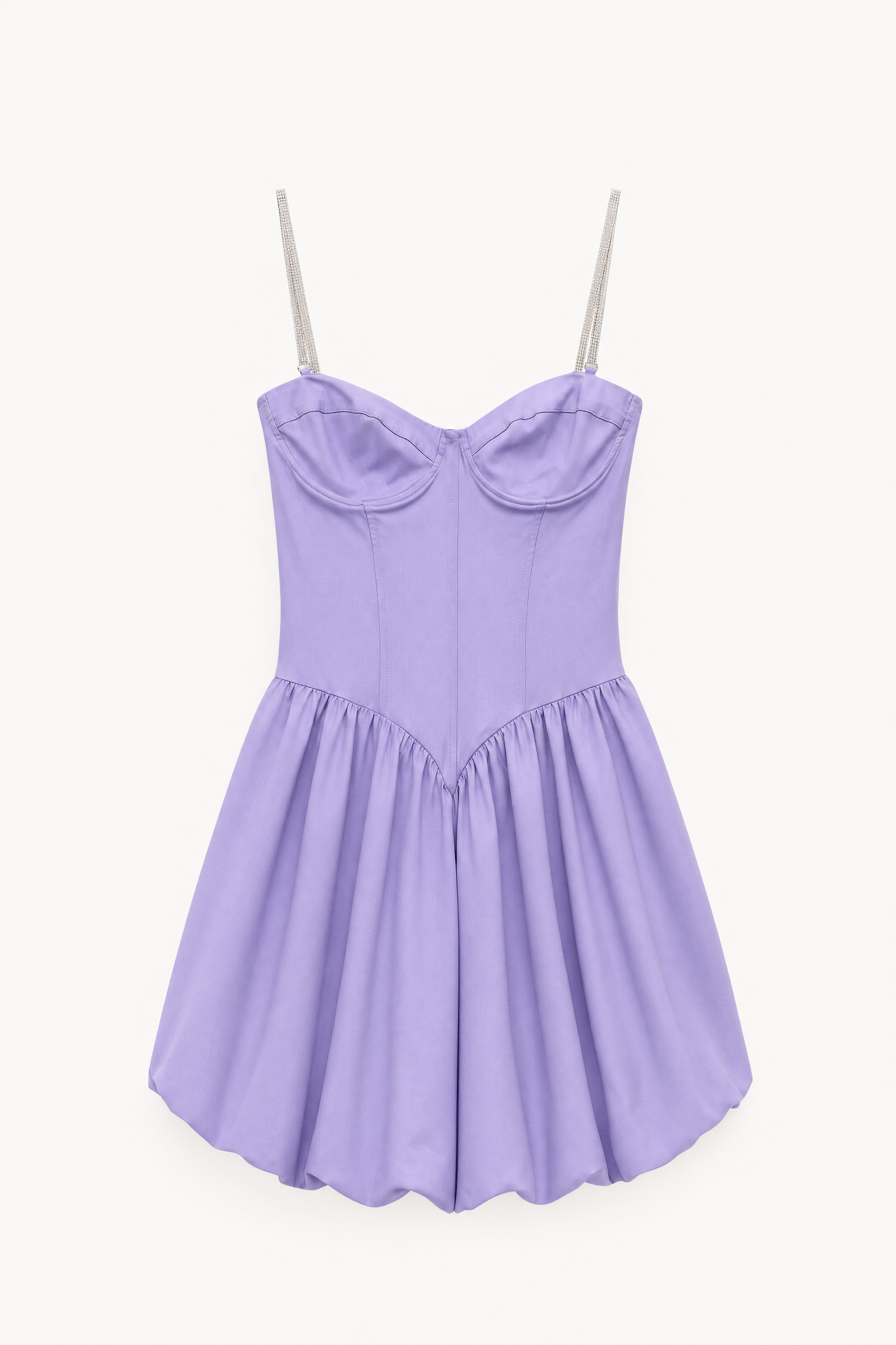Abito mini bustier foderato internamente. Scollo a cuore con coppe preformate. Spalline sottili gioiello removibili tramite gancio. Corpetto aderente con tagli verticali modellanti. Gonna corta con costruzione balloon. Chiusura con zip invisibile centrale sul retro. Vestibilità regolare, disponibile in taglia S, M, L.