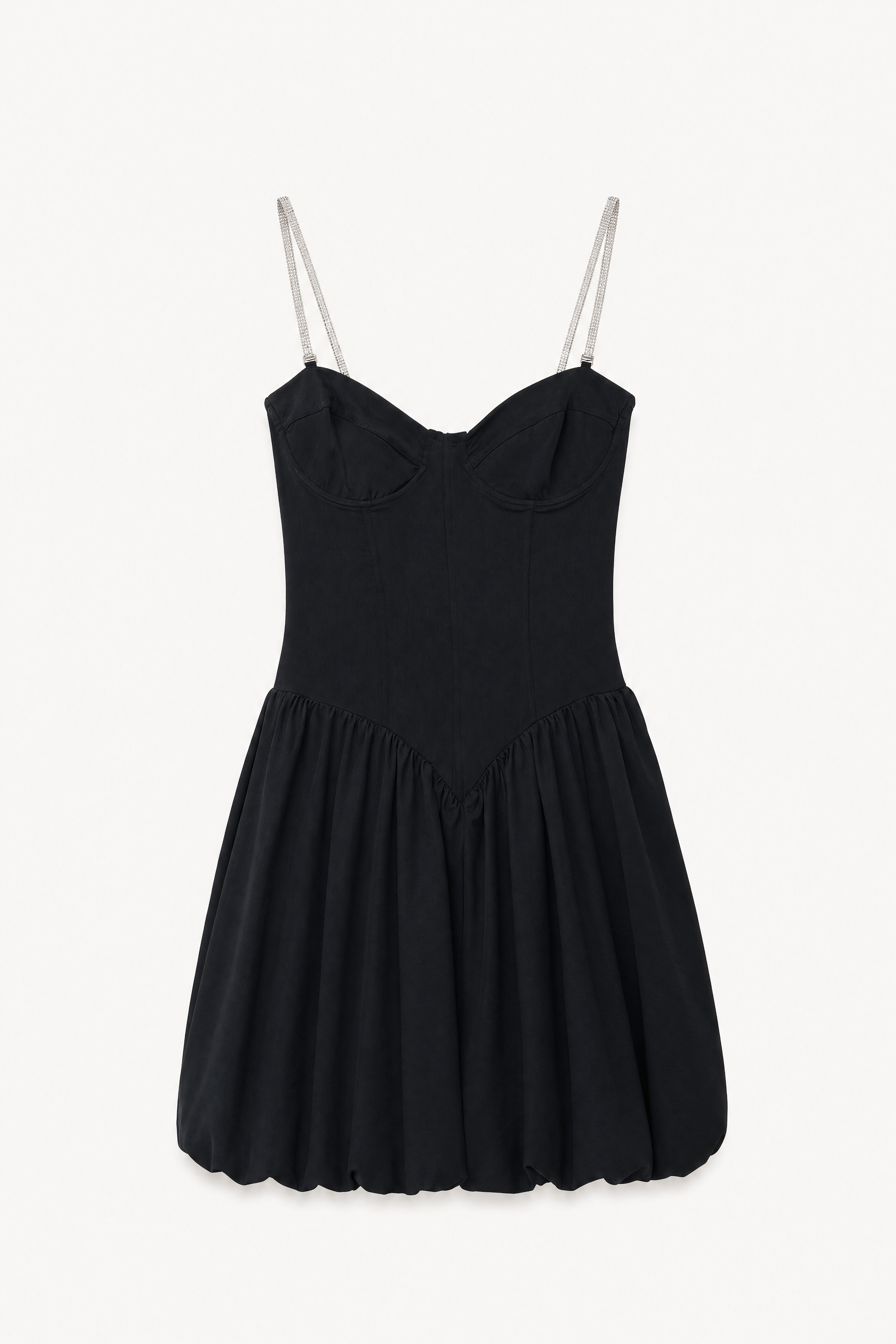 Abito mini bustier foderato internamente. Scollo a cuore con coppe preformate. Spalline sottili gioiello removibili tramite gancio. Corpetto aderente con tagli verticali modellanti. Gonna corta con costruzione balloon. Chiusura con zip invisibile centrale sul retro. Vestibilità regolare, disponibile in taglia S, M, L.