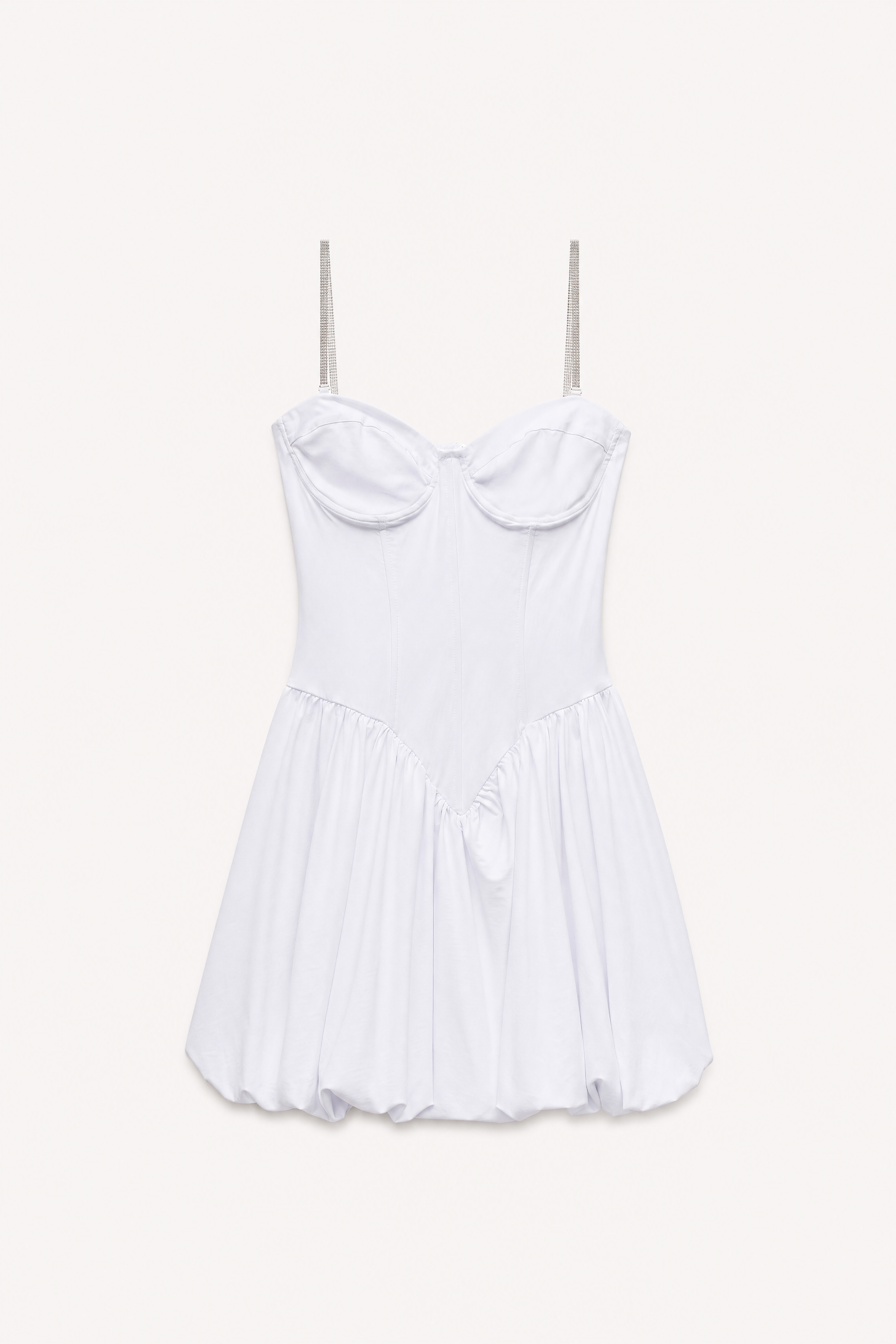 Abito mini bustier foderato internamente. Scollo a cuore con coppe preformate. Spalline sottili gioiello removibili tramite gancio. Corpetto aderente con tagli verticali modellanti. Gonna corta con costruzione balloon. Chiusura con zip invisibile centrale sul retro. Vestibilità regolare, disponibile in taglia S, M, L.