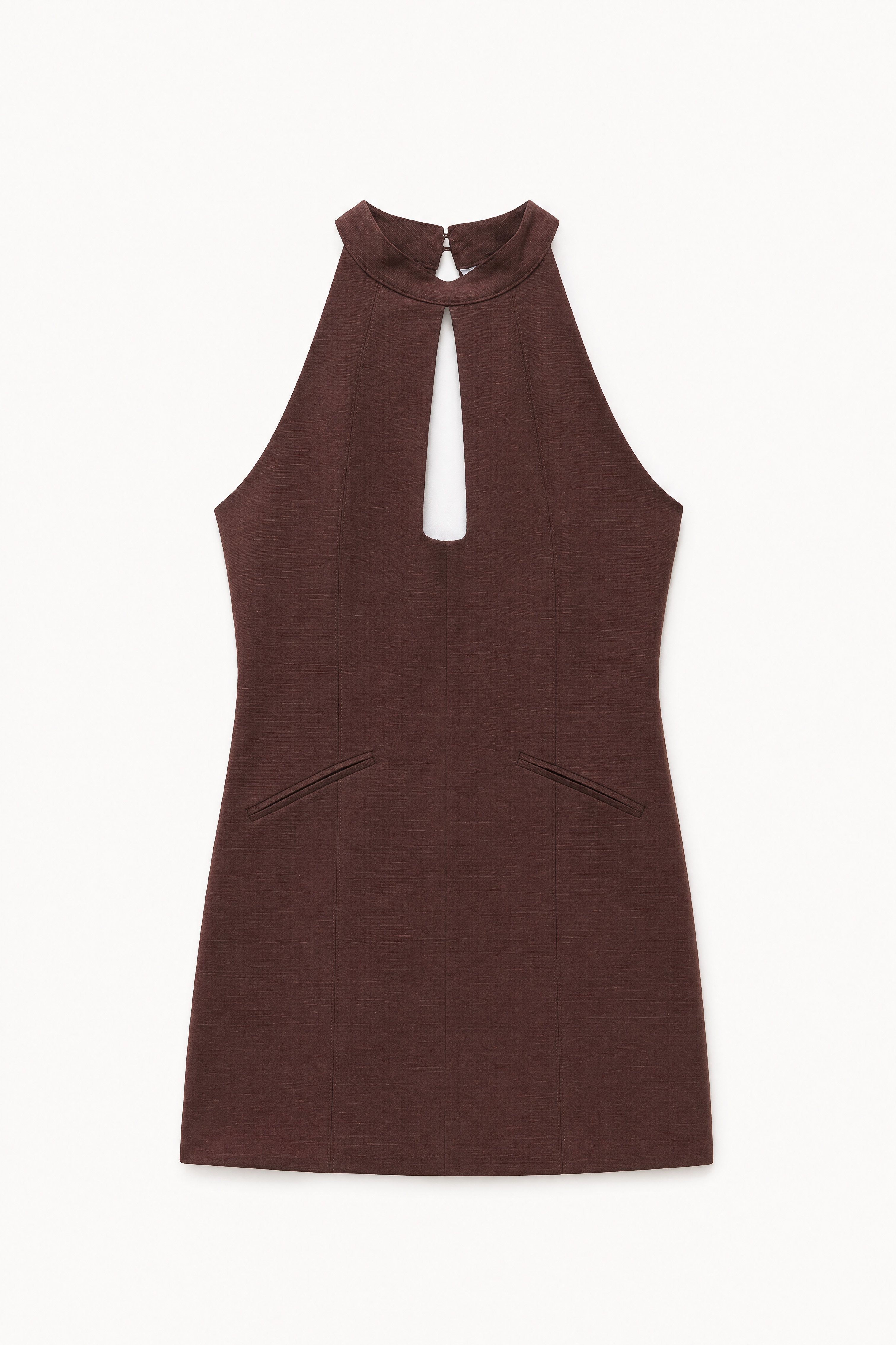 Abito mini in misto lino fiammato. Scollo halter con collo alto avvolgente. Chiusura posteriore con bottone al collo. Apertura a goccia frontale e posteriore. Tasche decorative a filetto frontali. Chiusura posteriore con zip invisibile centrale. Vestibilità regolare, disponibile in taglia S, M, L.