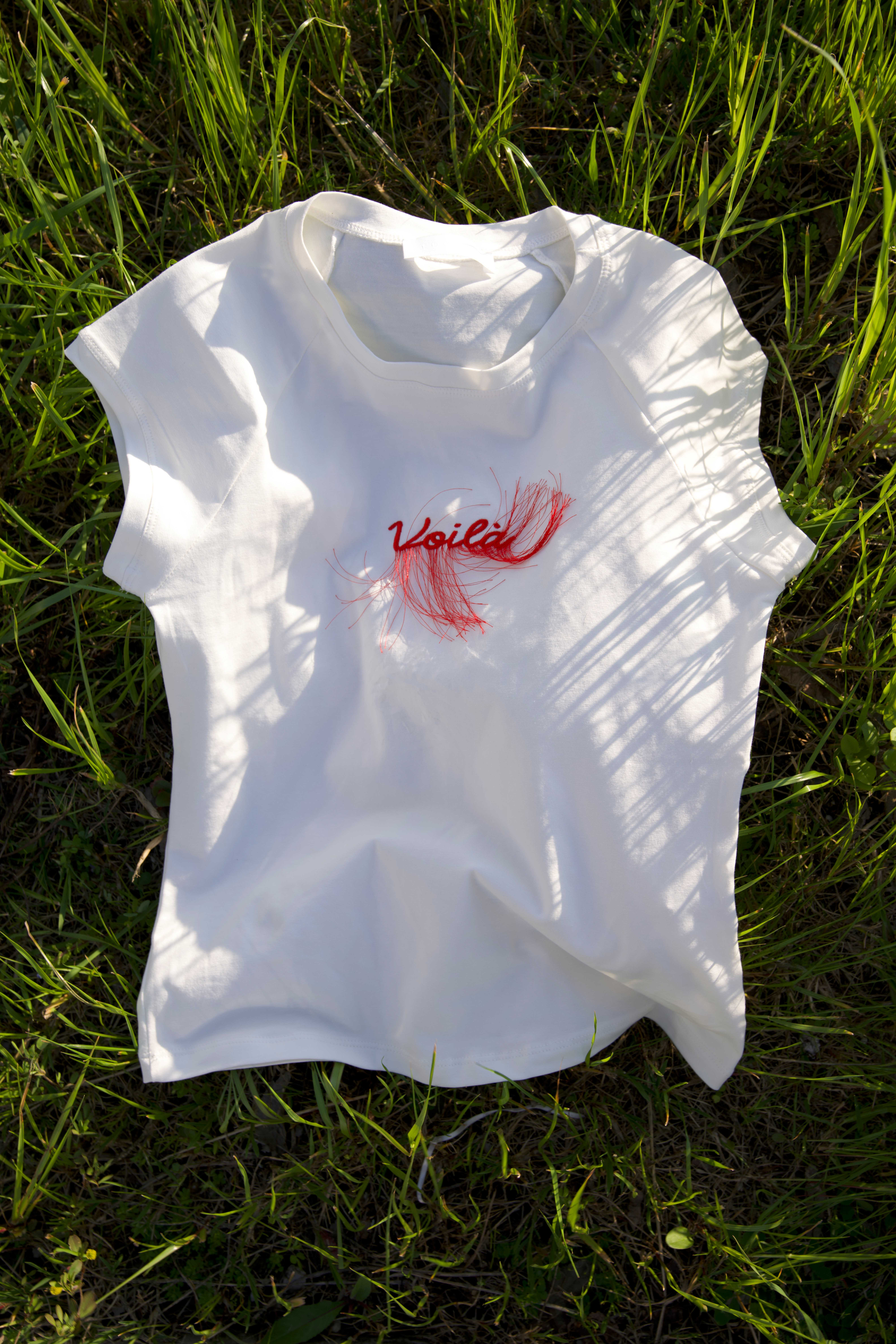 Ricamo frontale con scritta e applicazione fili decorativi.
