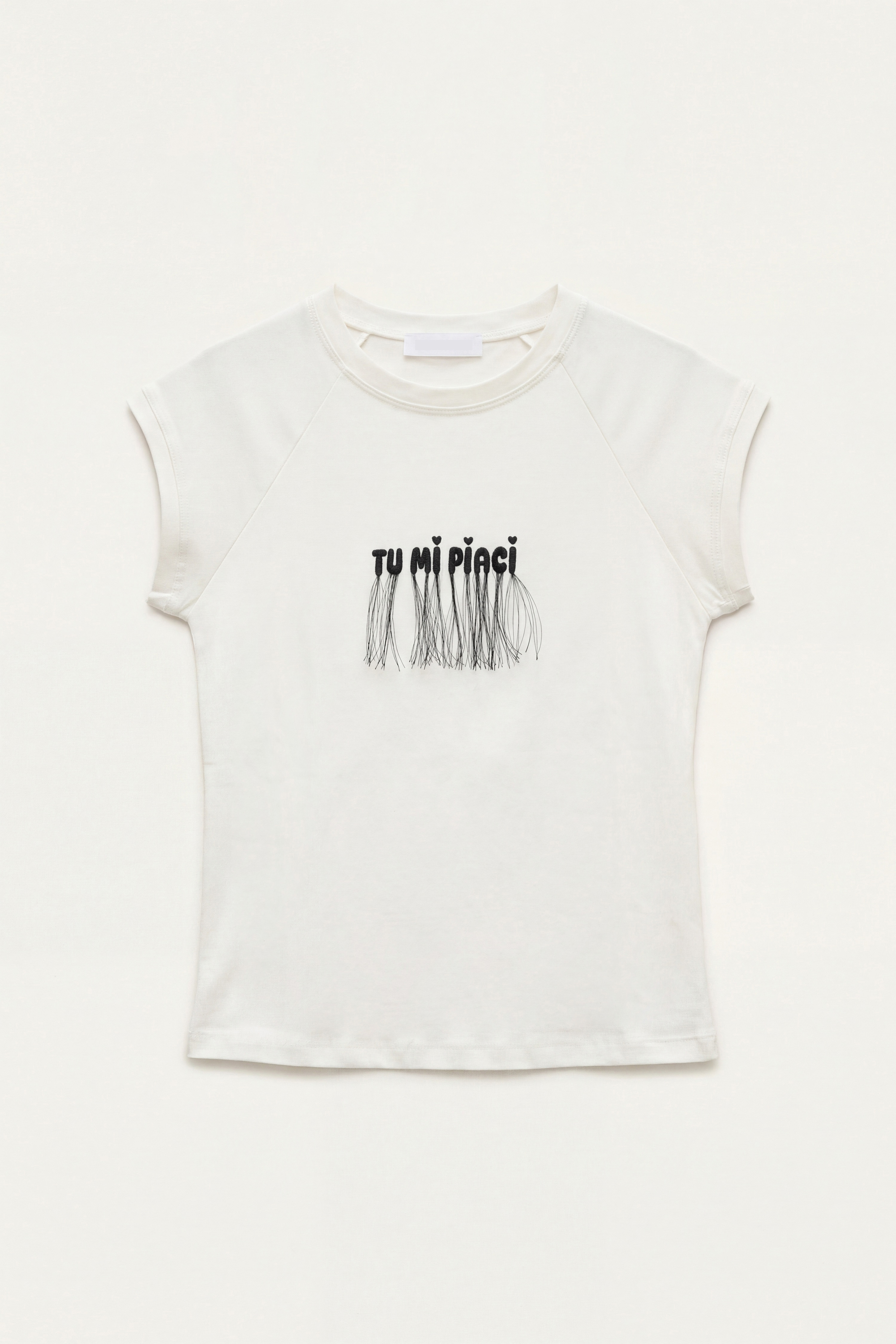 Ricamo frontale con scritta e applicazione fili decorativi.