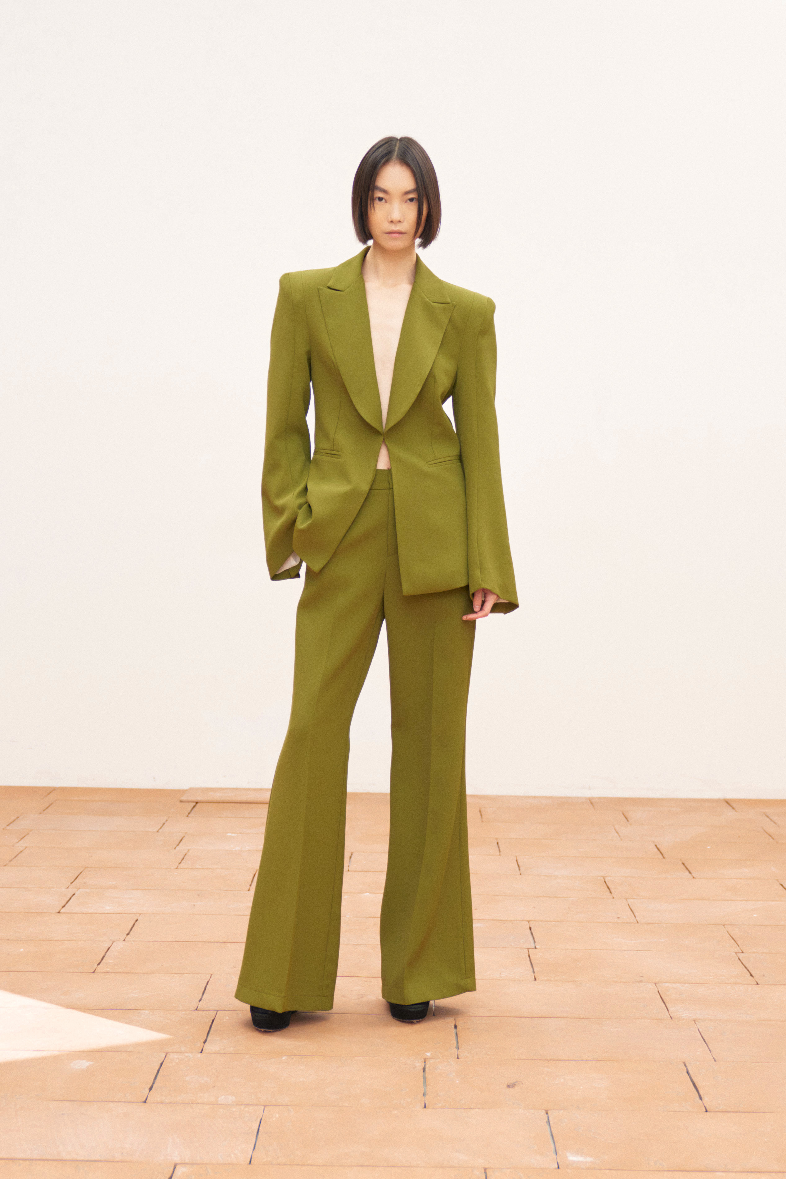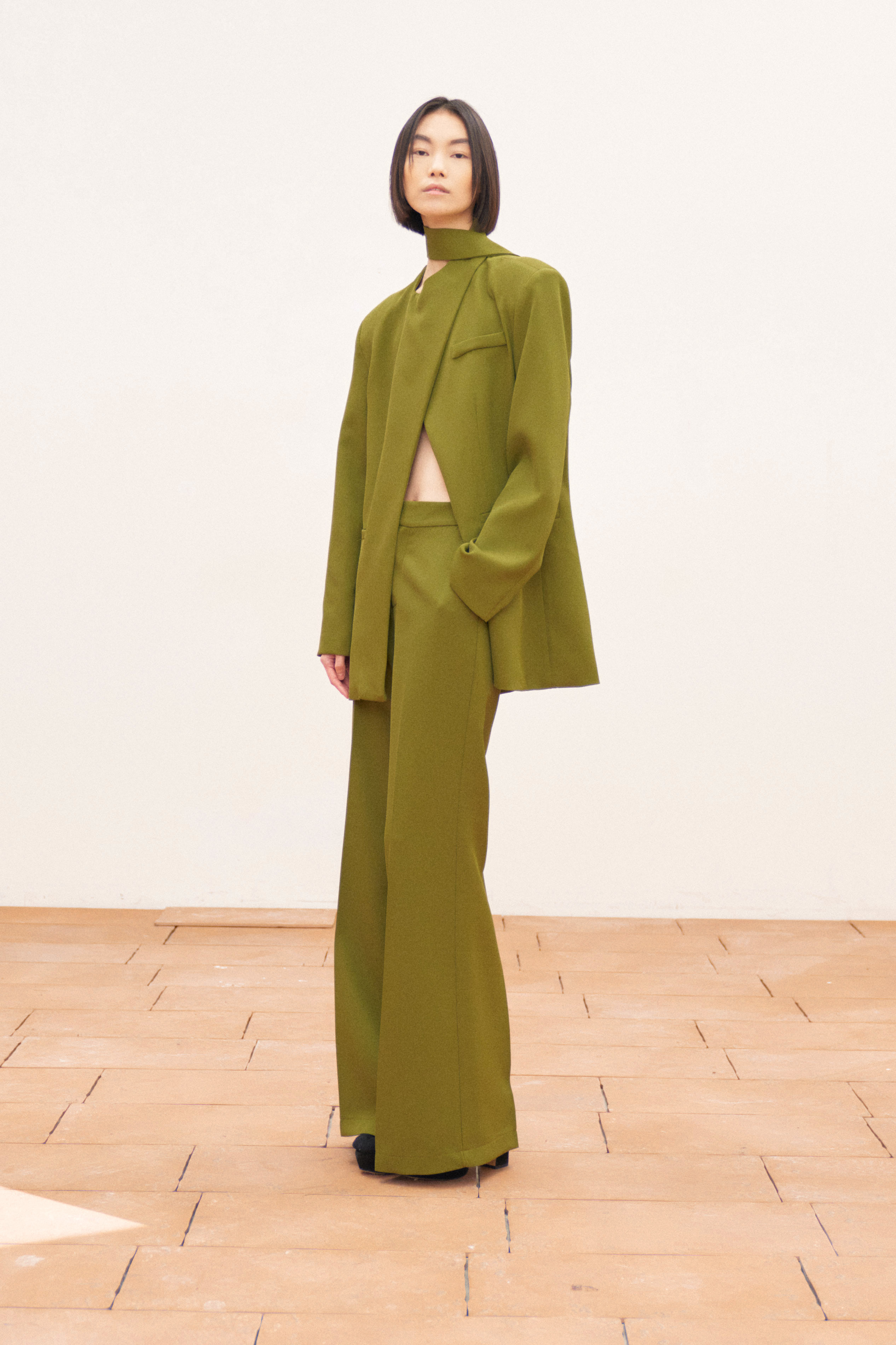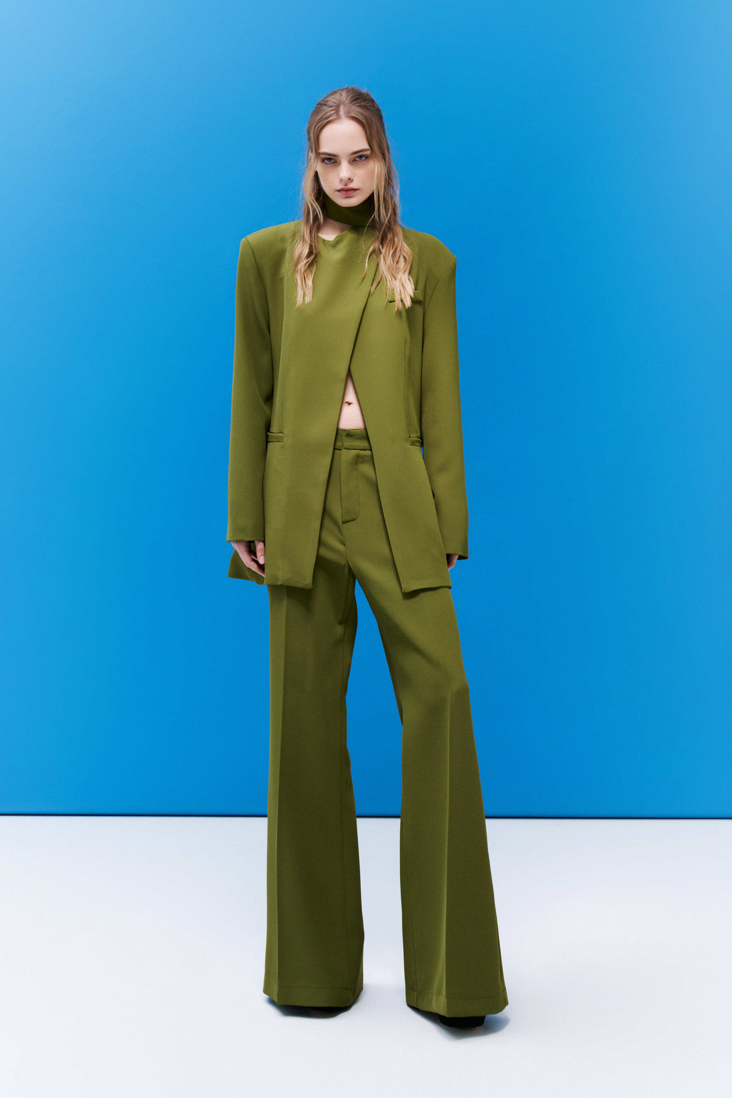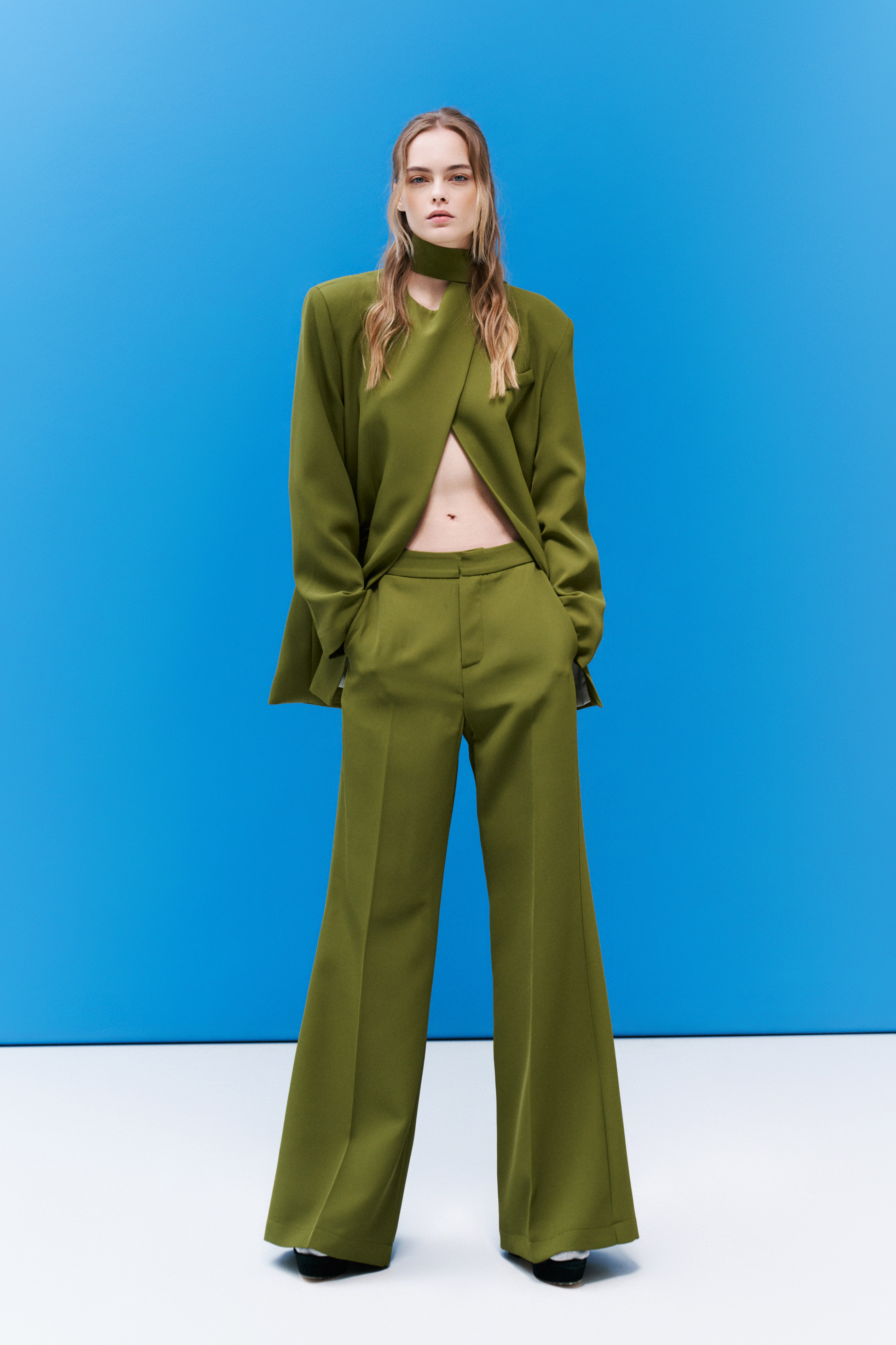 Pantaloni palazzo in tessuto semitrasparente satinato.