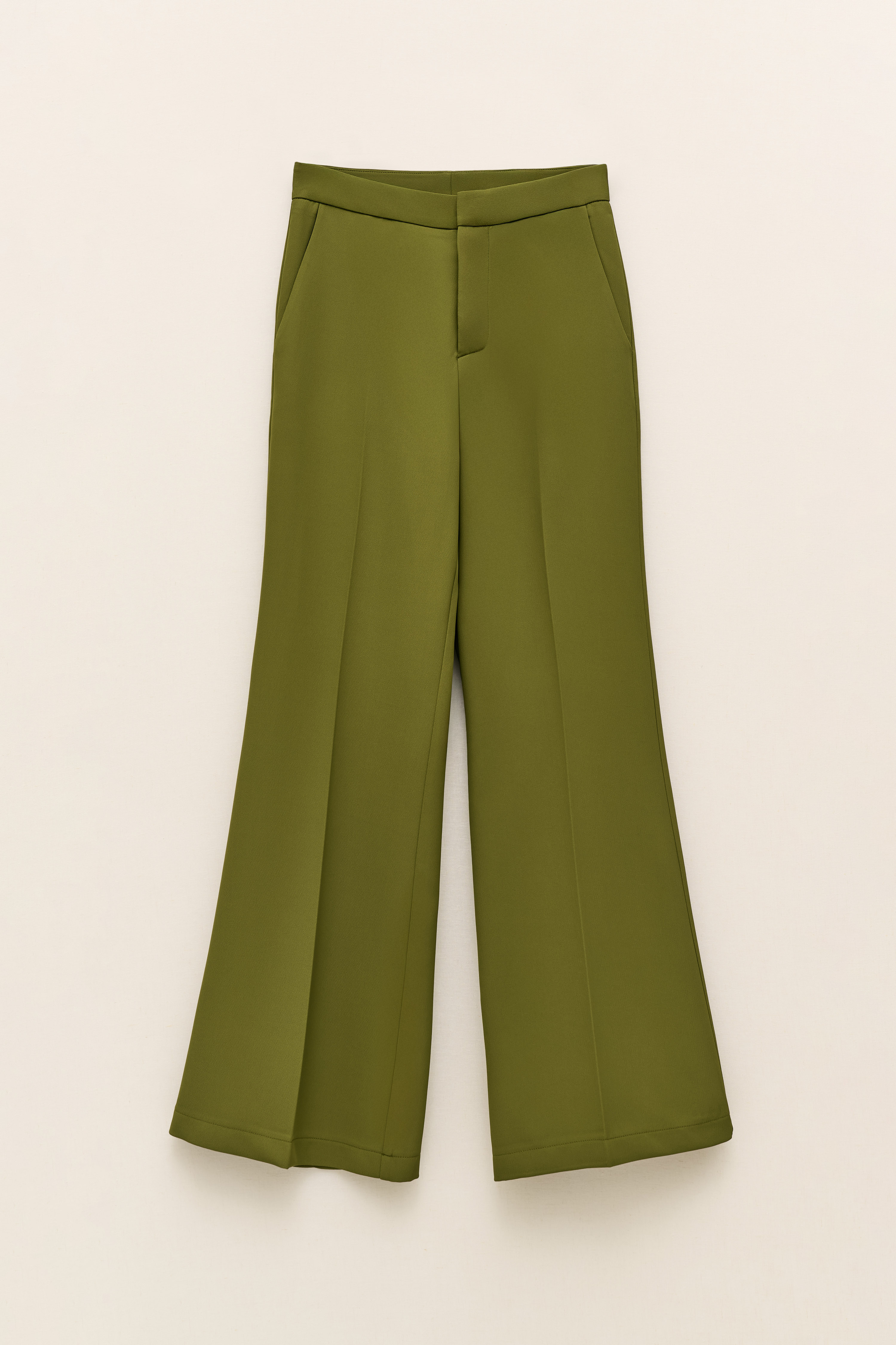 Vita alta con fascia elasticizzata. Tasche laterali inserite.