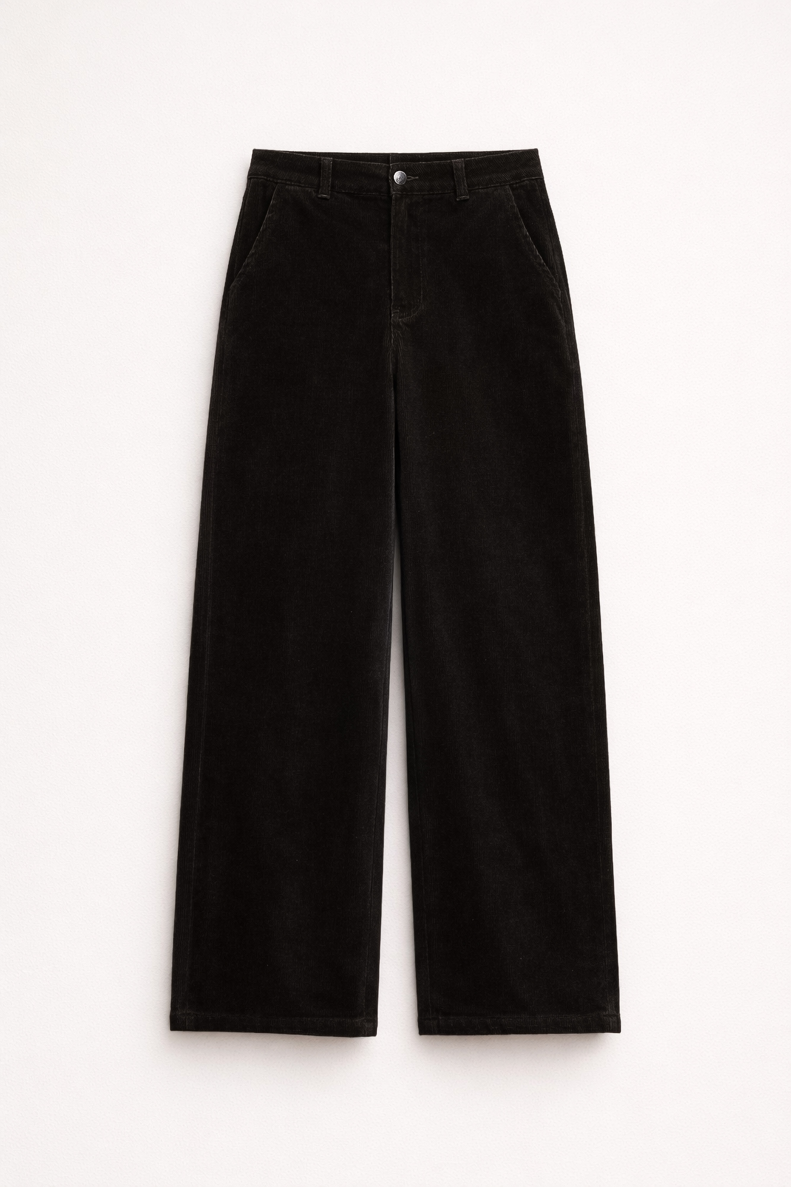 Vita alta con fascia elasticizzata. Tasche laterali inserite.