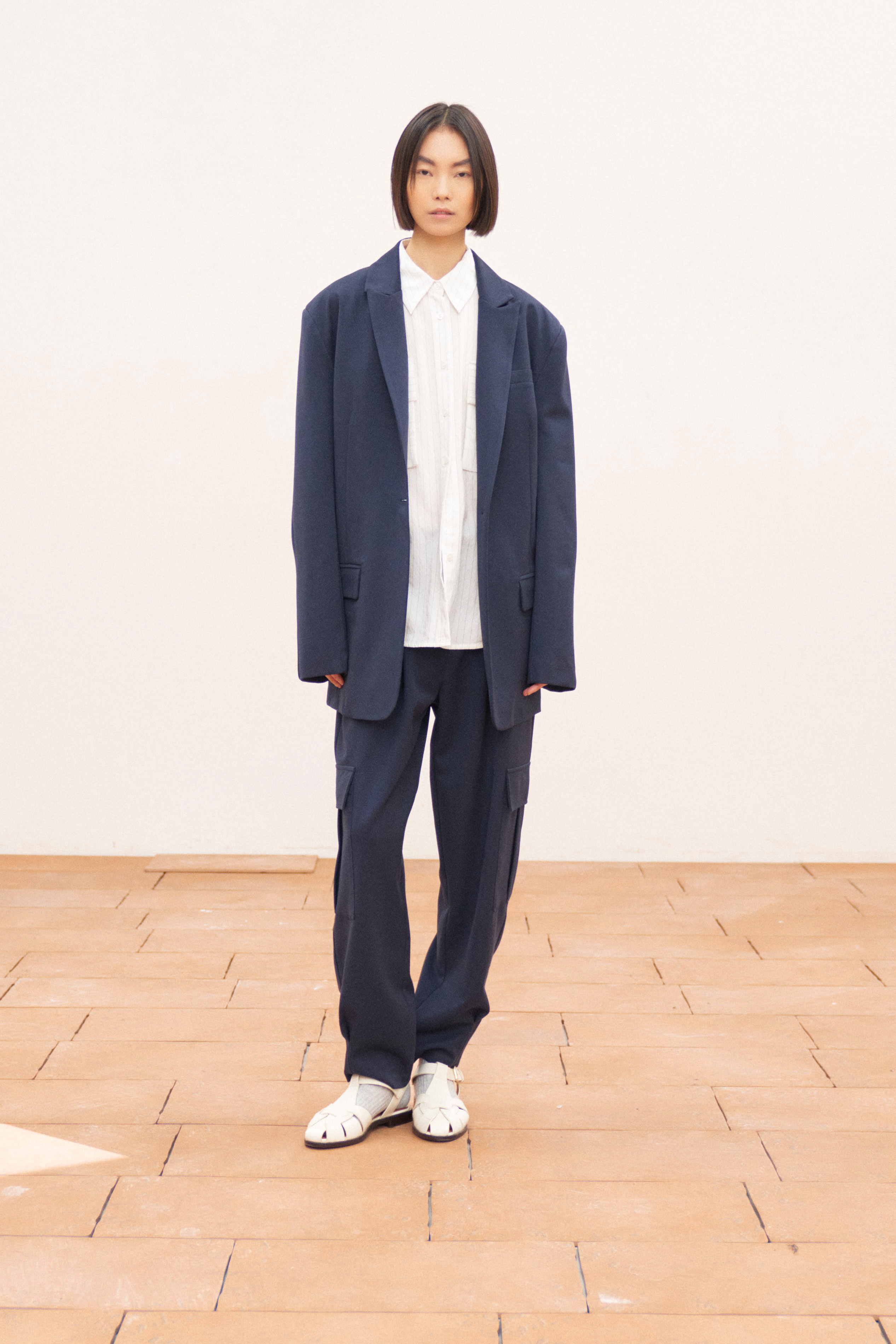 Pantaloni baggy in cotone strutturato. Vita media con passanti per cintura. Tasche laterali e tasche applicate sul retro. Chiusura frontale con cerniera e bottone. Vestibilità regolare, disponibile in taglia S, M, L.