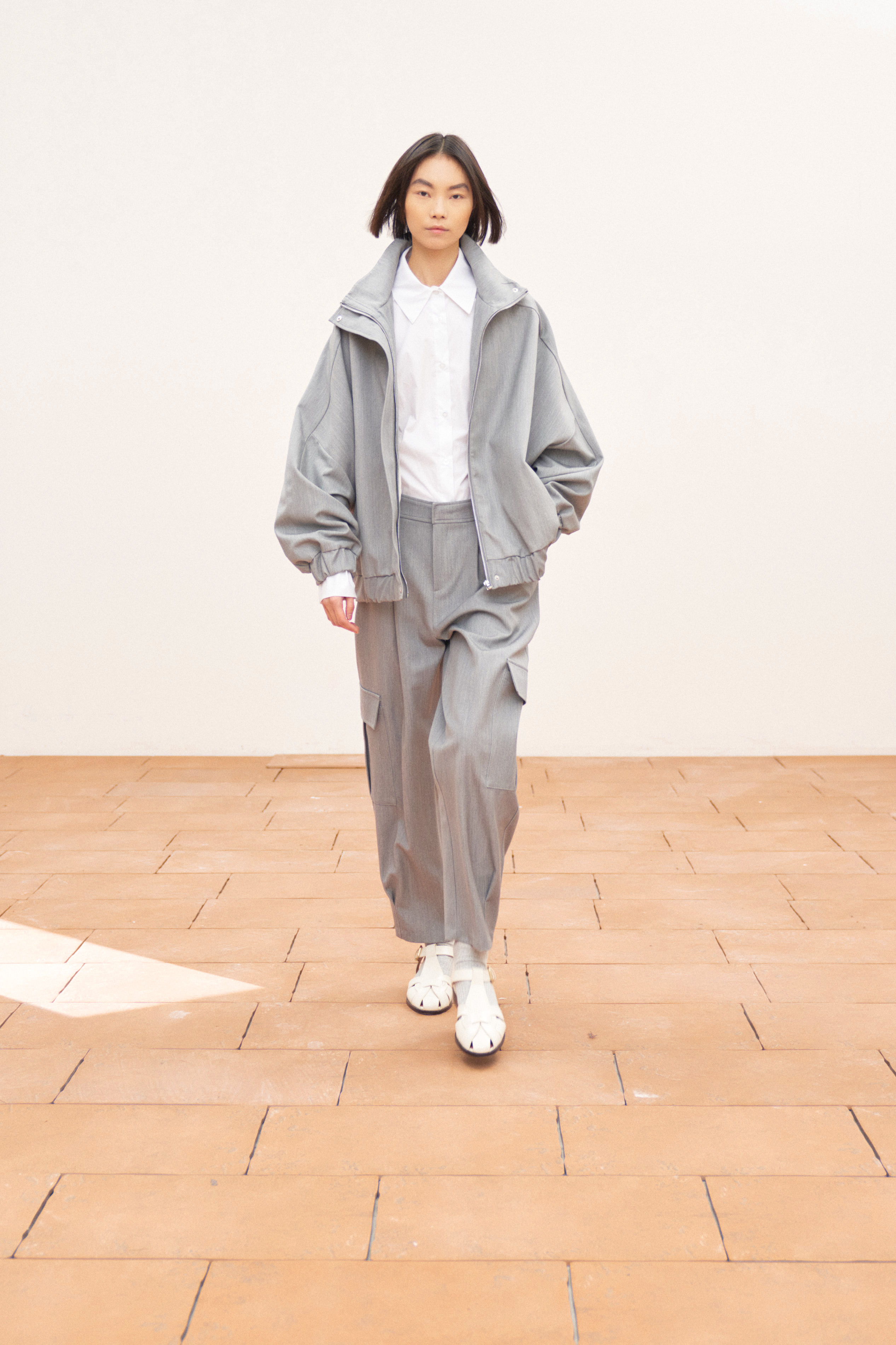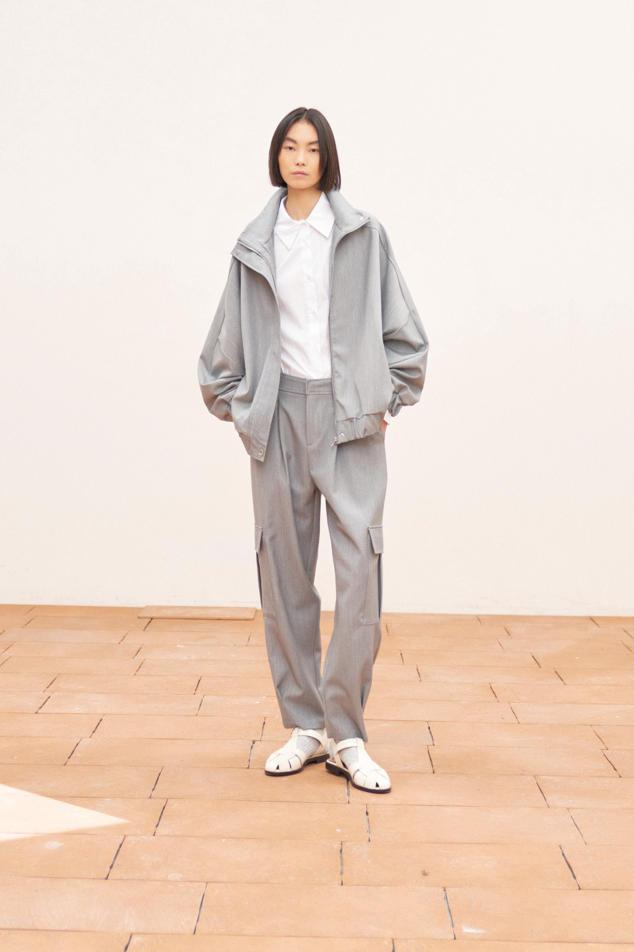 Chiusura frontale con cerniera e bottone.