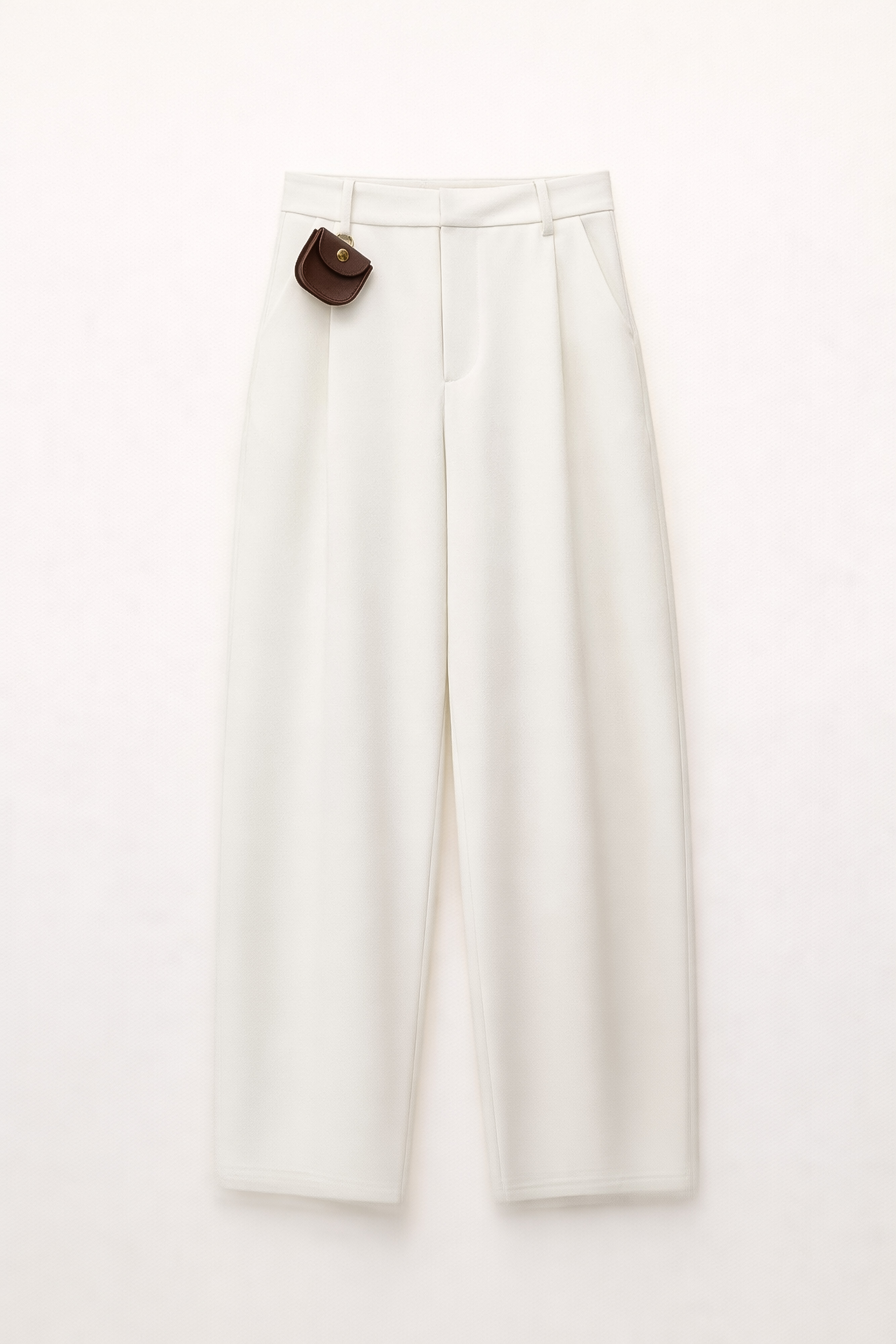 Vita alta con fascia elasticizzata. Tasche laterali inserite.