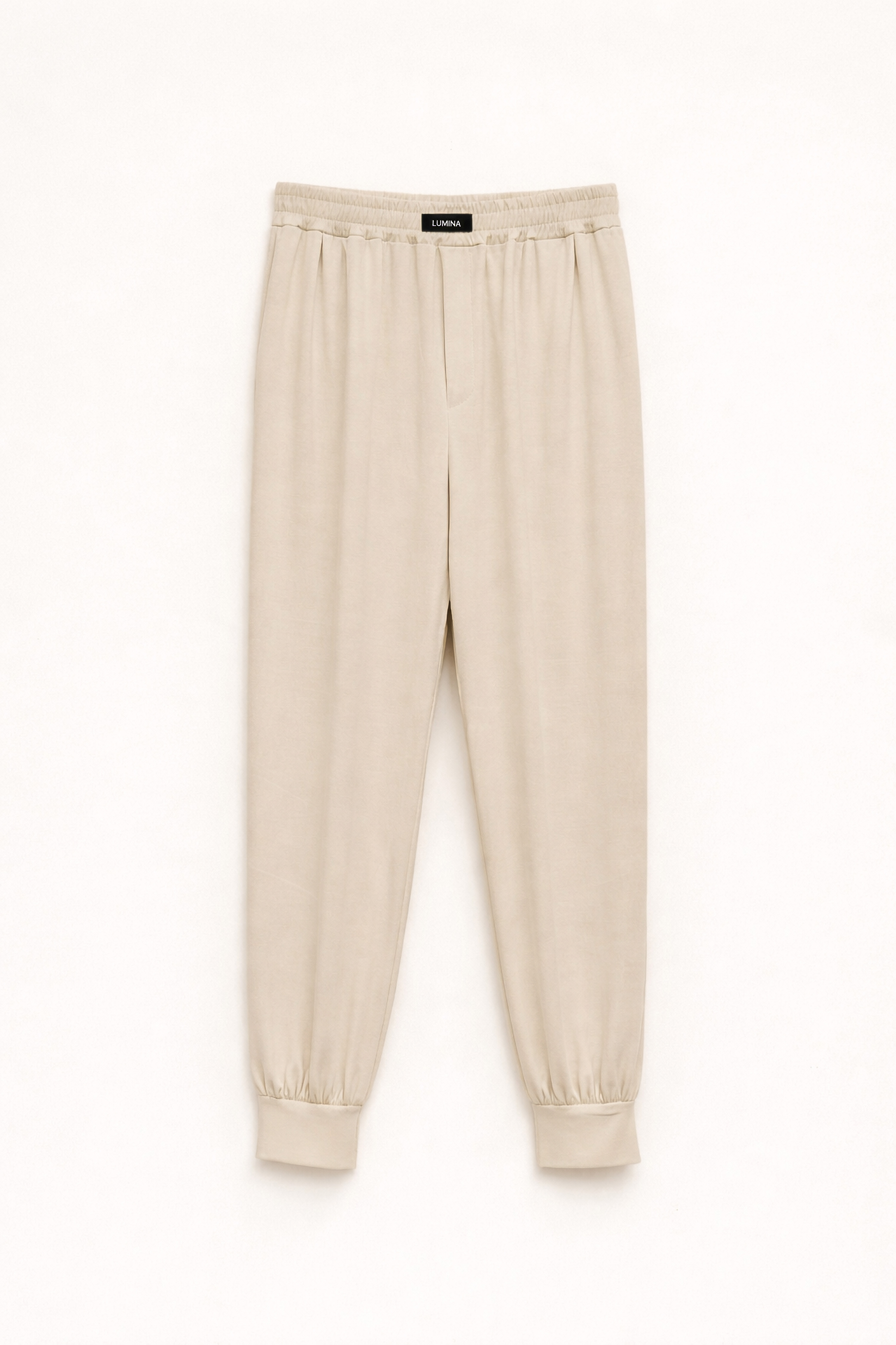 Pantaloni balloon in tessuto satinato misto lyocell. Vita alta con ampia fascia elasticizzata con arricciature. Fondo gamba con elastico. Tasche laterali inserite. Vestibilità regolare, disponibile in taglia S/M, M/L.