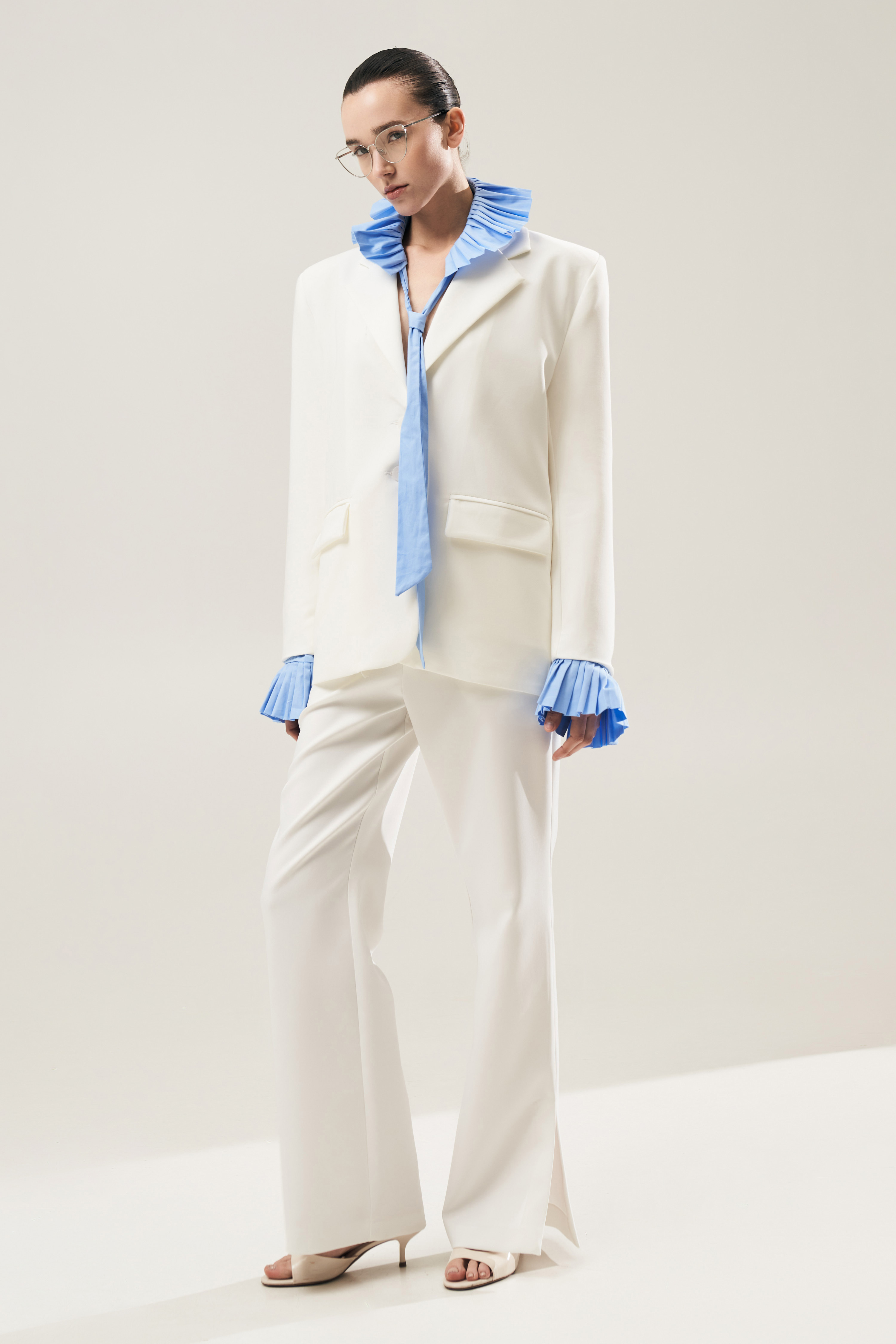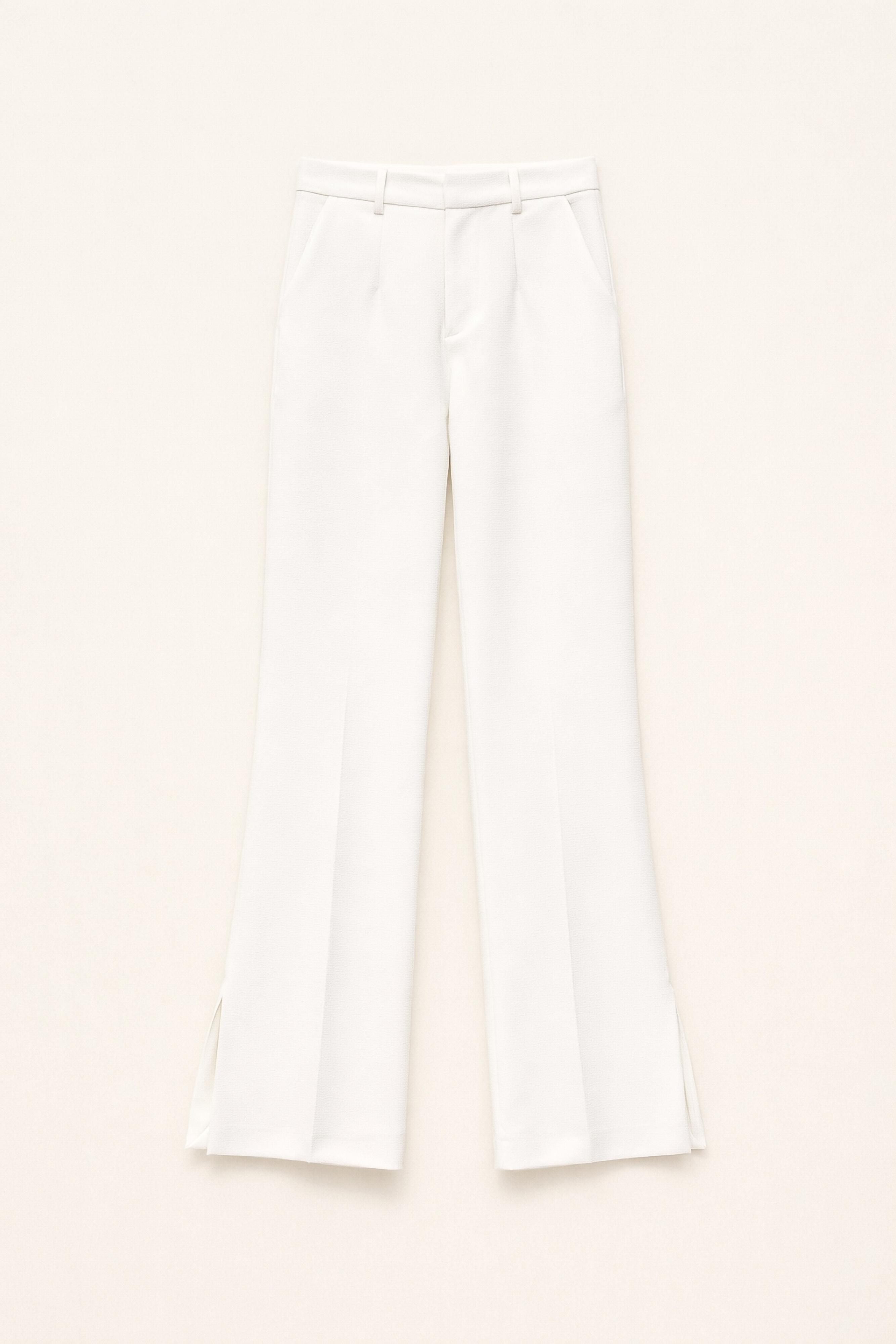 Pantaloni lunghi con spacchi laterali sul fondo. Vita alta con passanti. Gamba dritta. Chiusura frontale con cerniera e gancio. Vestibilità regolare, disponibile in taglia S, M, L.