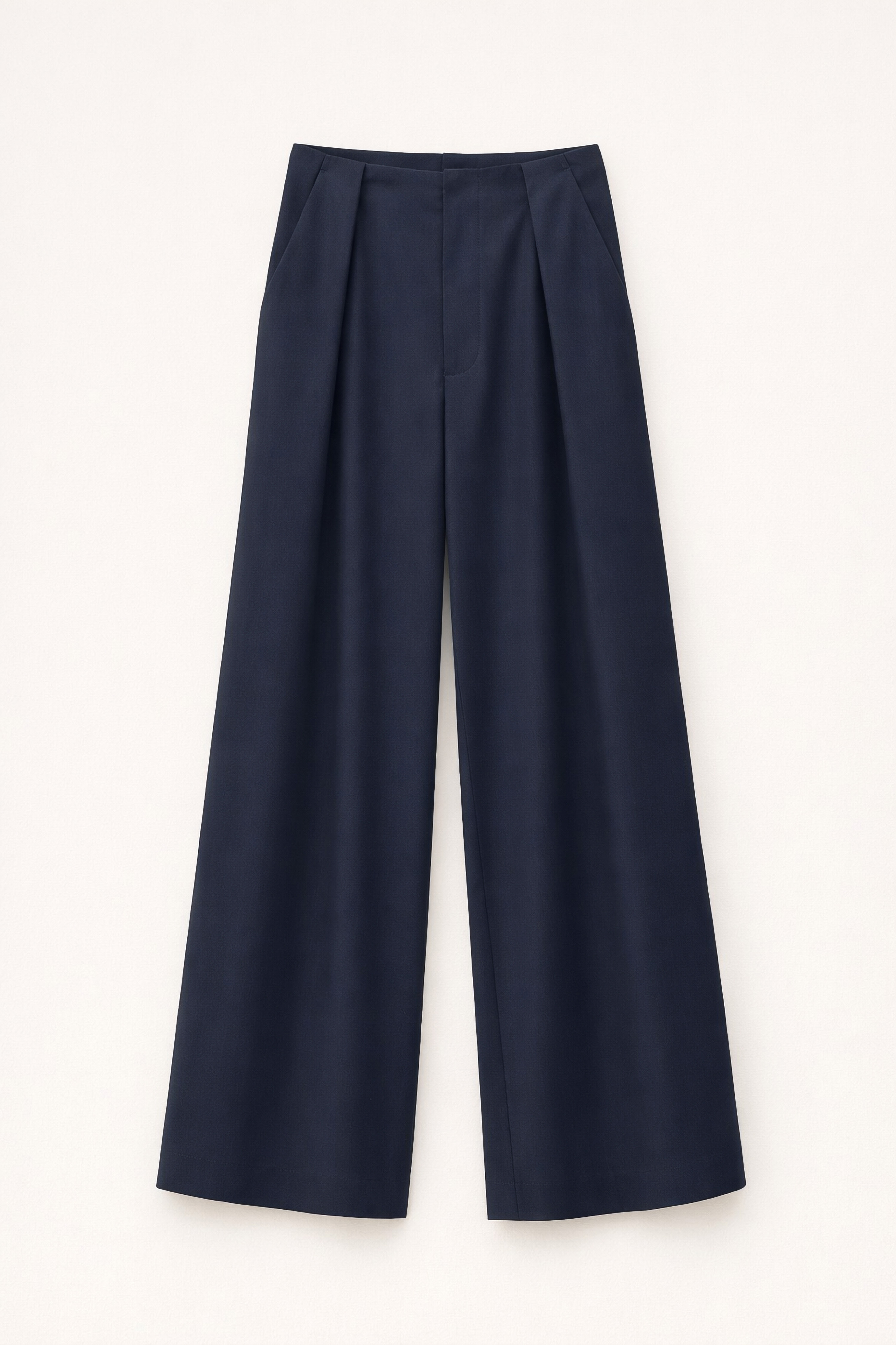 Pantaloni palazzo vita alta in misto lyocell. Pinces frontali. Tasche posteriori a filetto. Tasche laterali inserite nei fianchi. Chiusura laterale con zip invisibile. Vestibilità regolare, disponibile in taglia S, M, L.