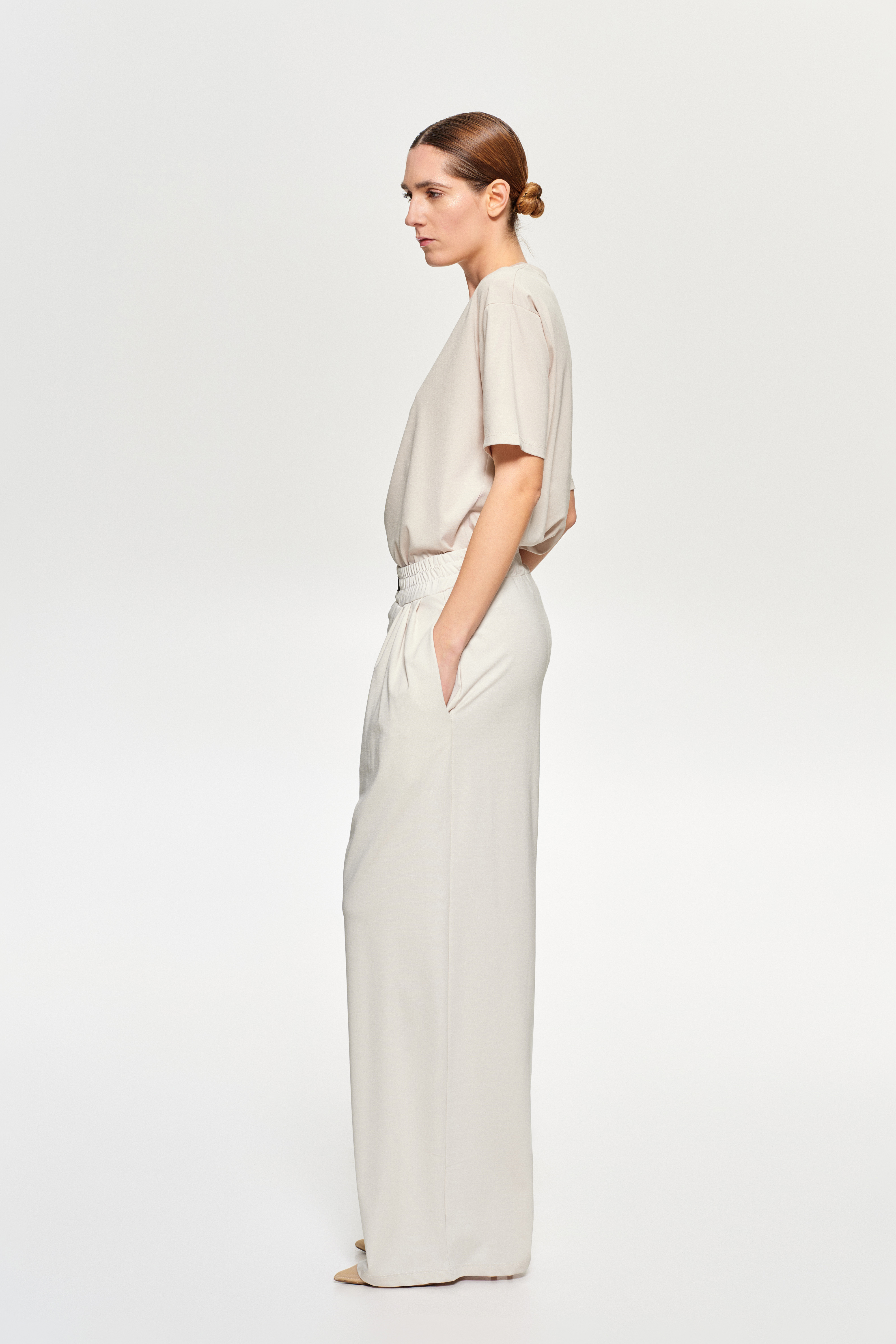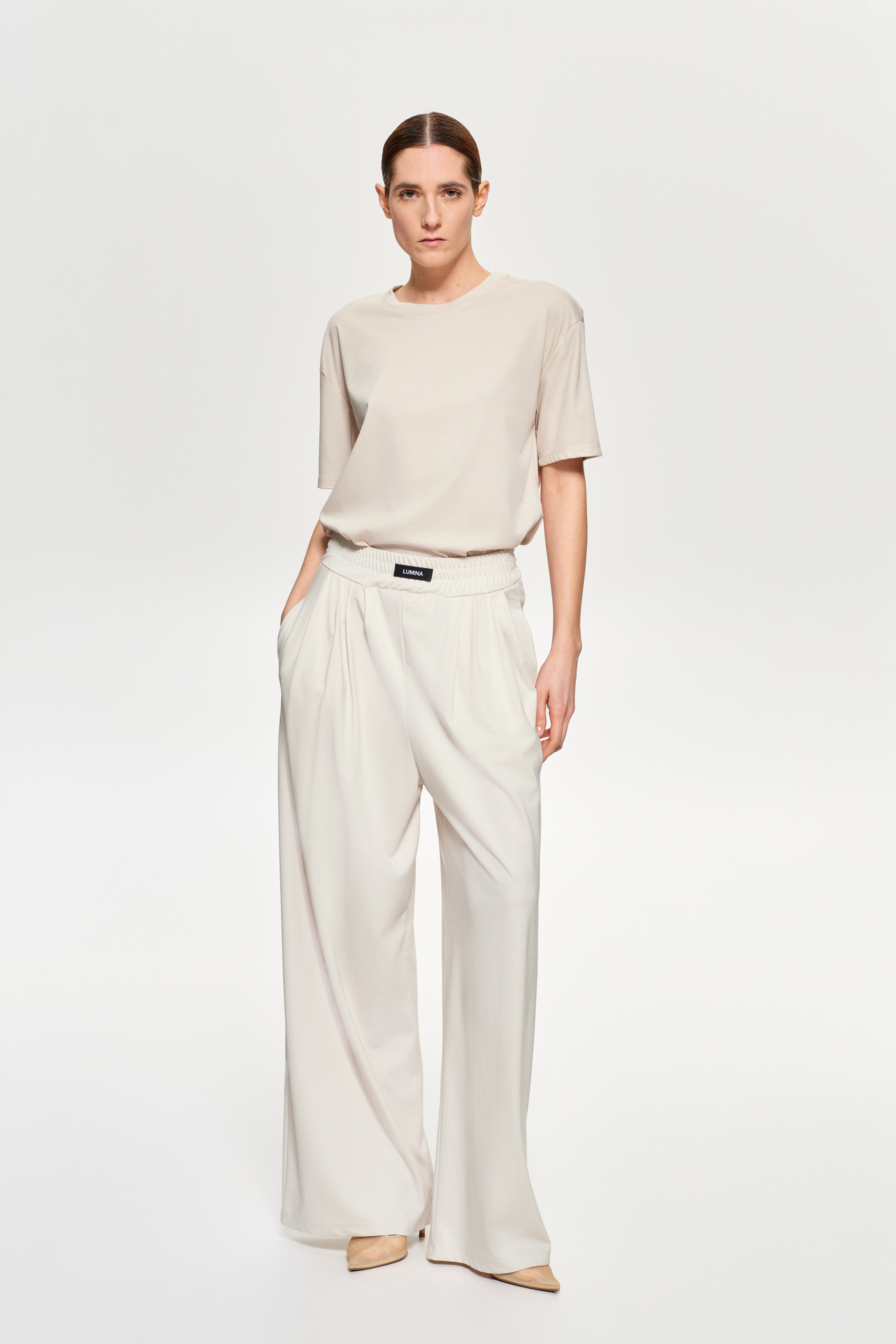 Pantaloni palazzo in tessuto semitrasparente satinato. Vita alta con fascia elasticizzata. Tasche laterali inserite. Vestibilità regolare, disponibile in taglia S, M, L.