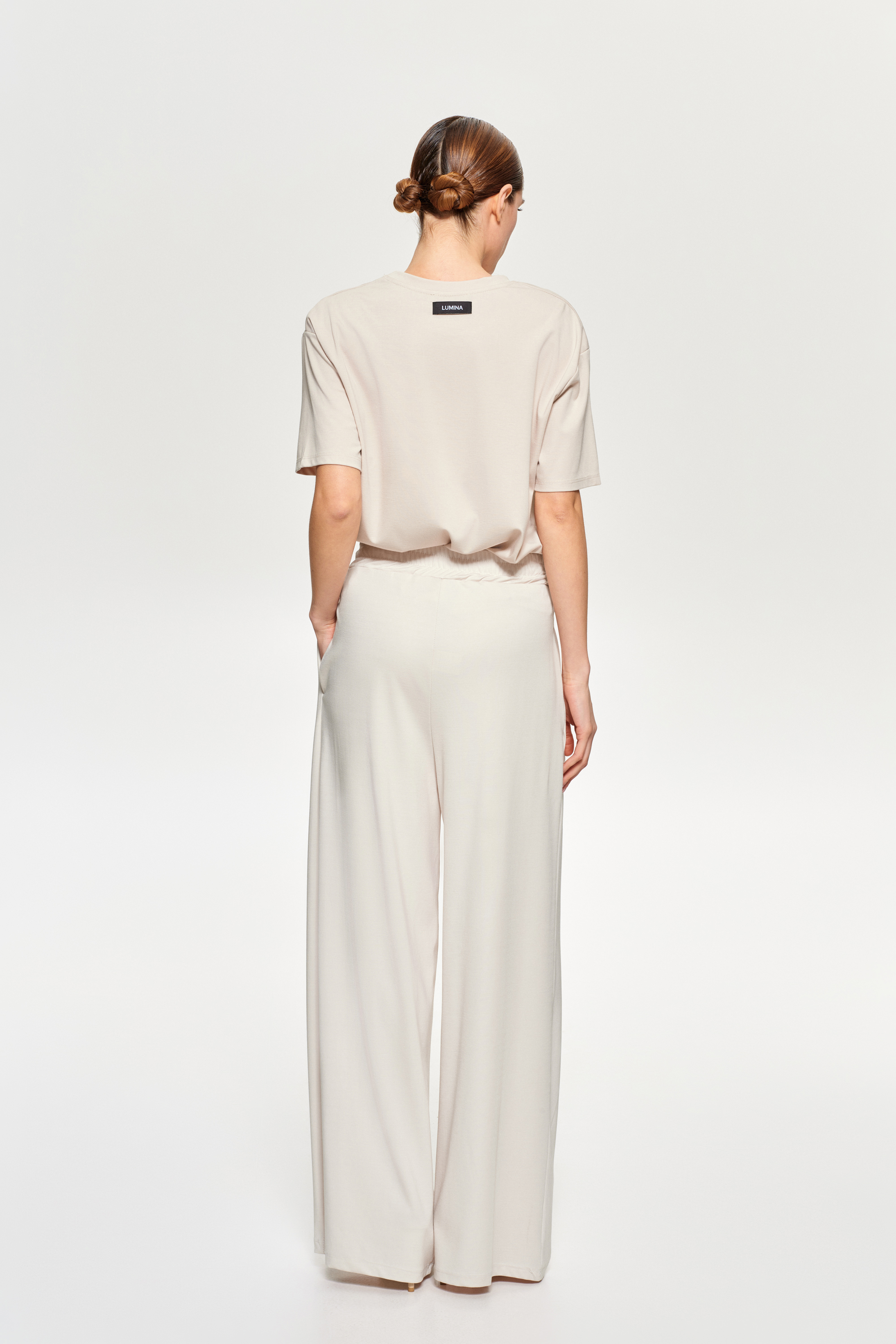 Pantaloni wide-leg in misto lino. Tasche laterali inserite funzionali. Vita elasticizzata con coulisse regolabile. Fondo con laccetti regolabili per effetto arricciato. Vestibilità regolare, disponibile in taglia S/M, M/L.