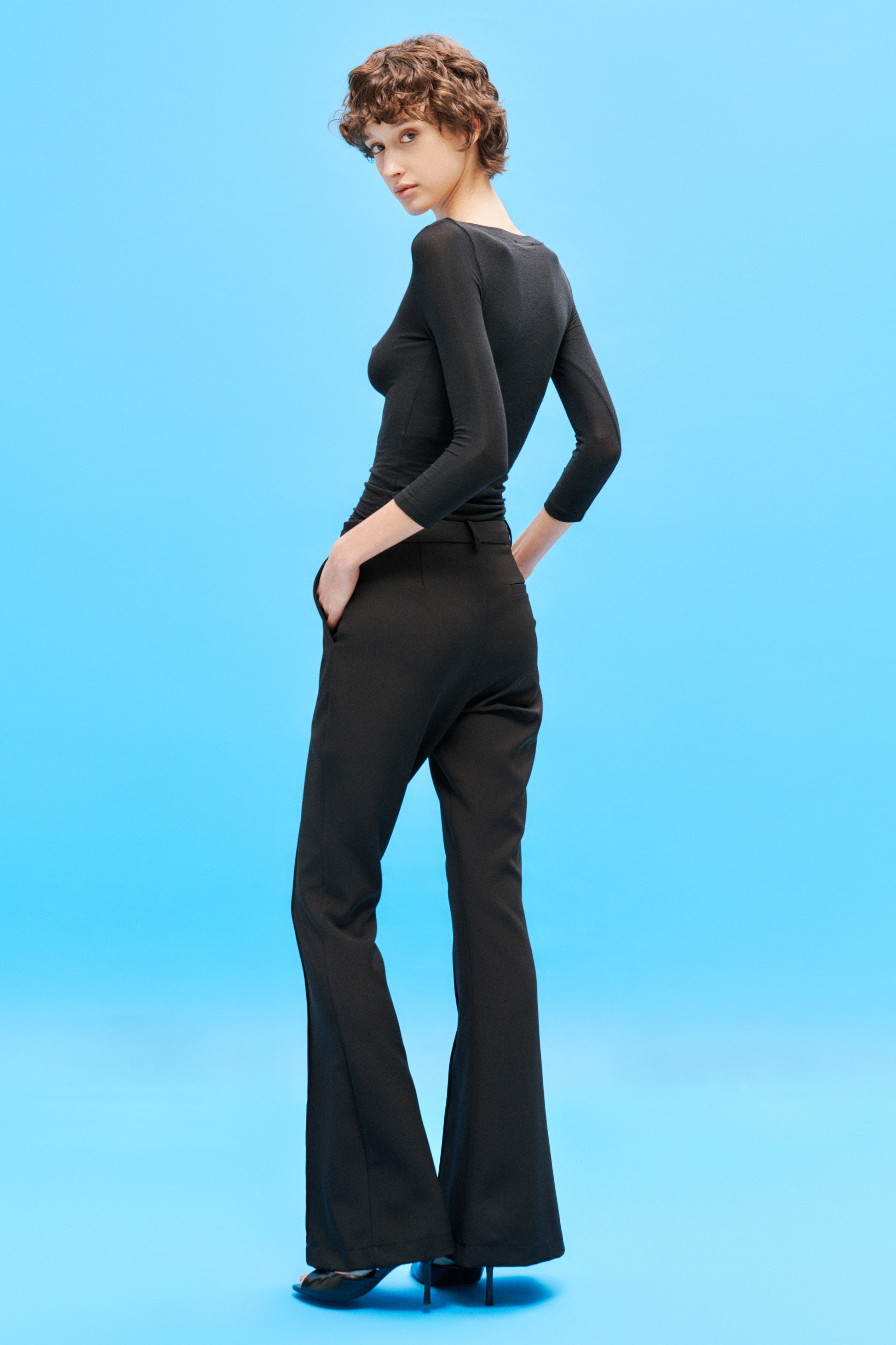 Vita alta con fascia elasticizzata. Tasche laterali inserite.