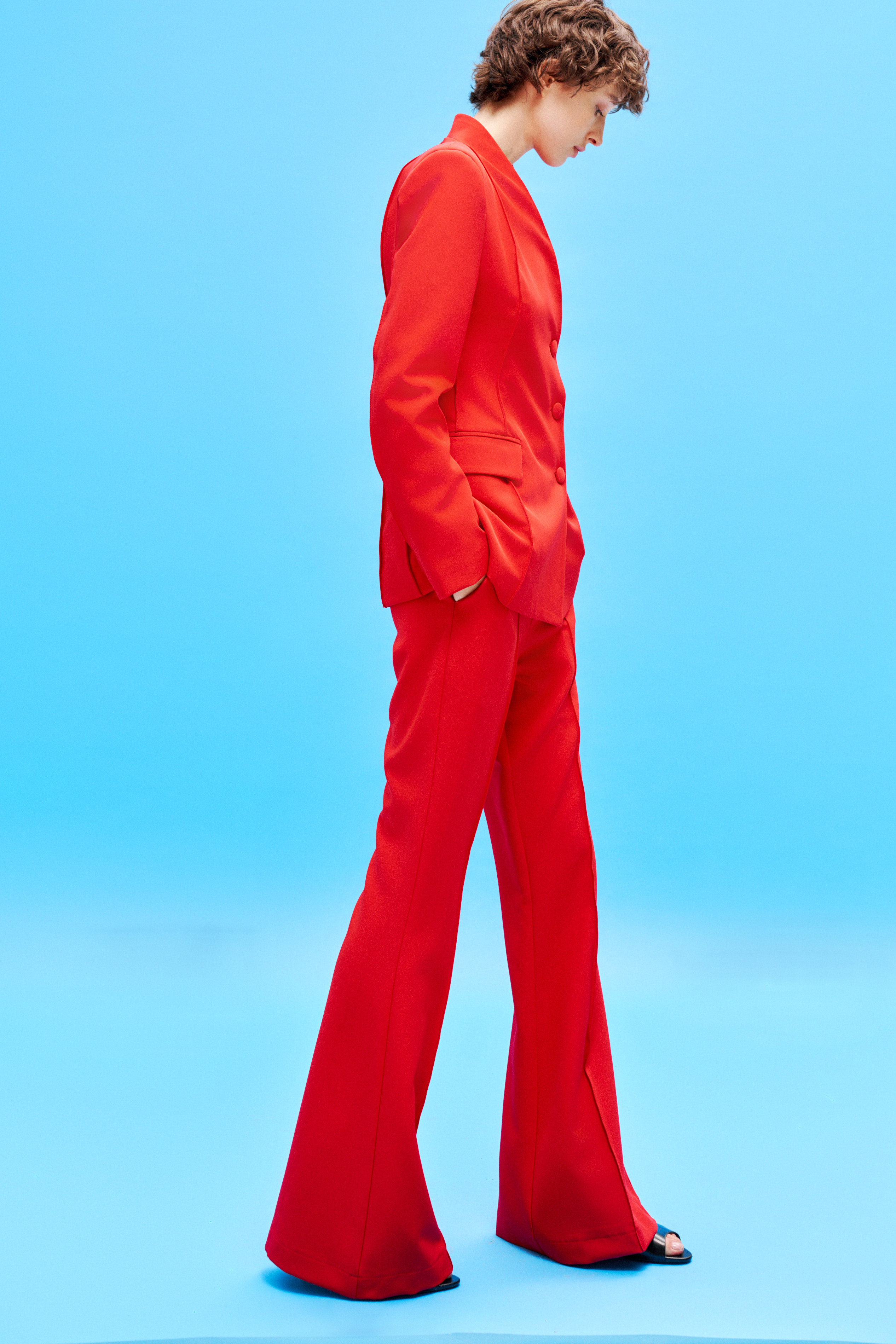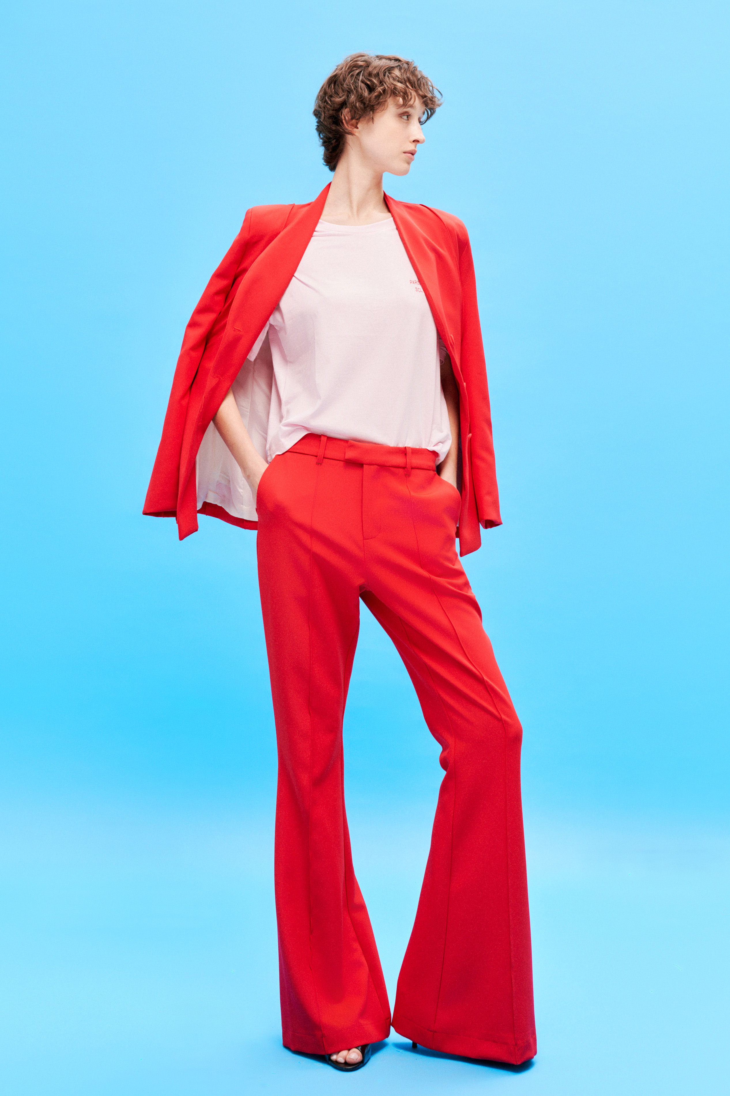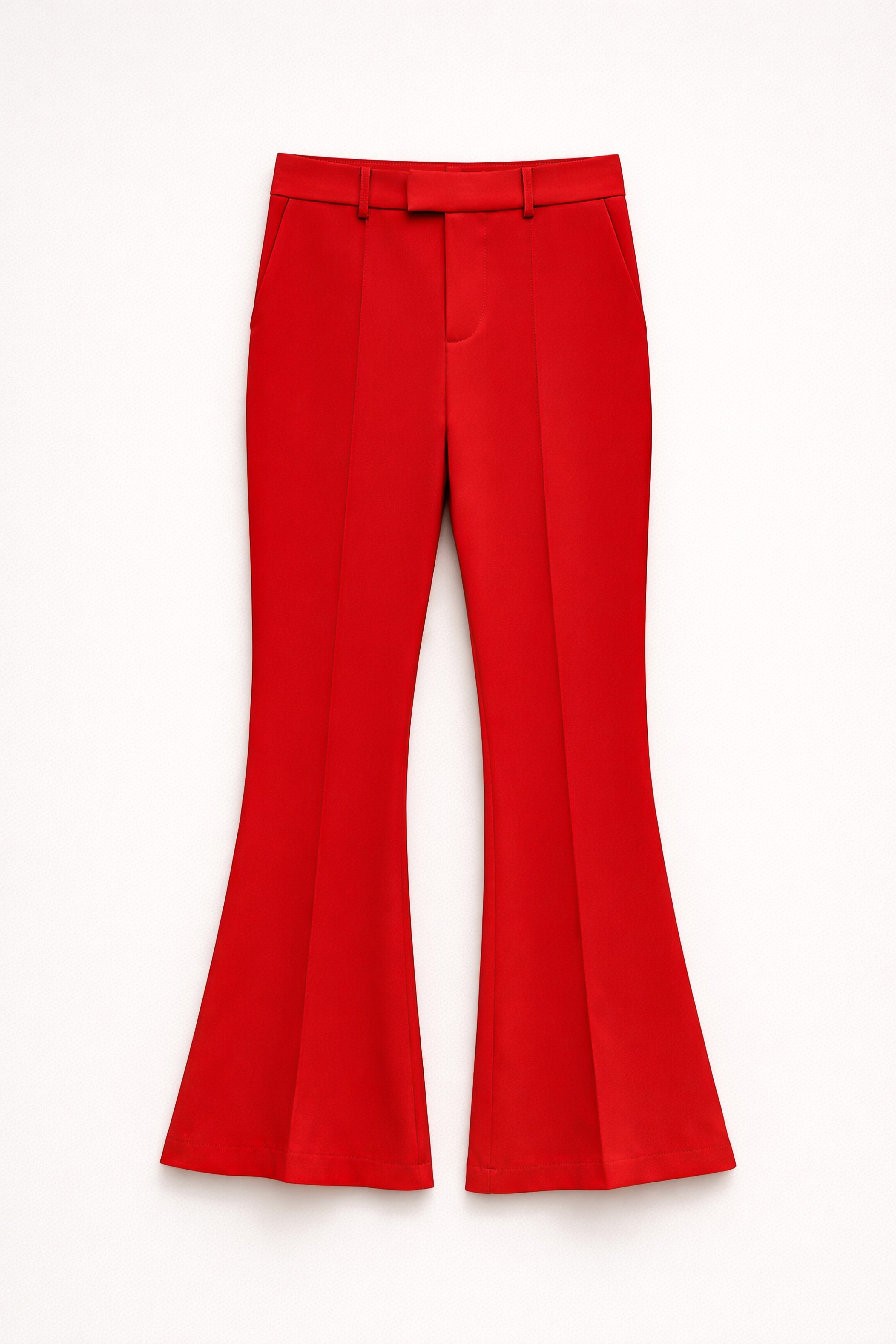 Pantaloni flare vita regolare con passanti. Tagli e cuciture verticali frontali effetto shaping. Tasche laterali inserite. Tasca a filetto sul retro. Chiusura frontale con cerniera, gancio e bottone. Vestibilità regolare, disponibile in taglia S, M, L.