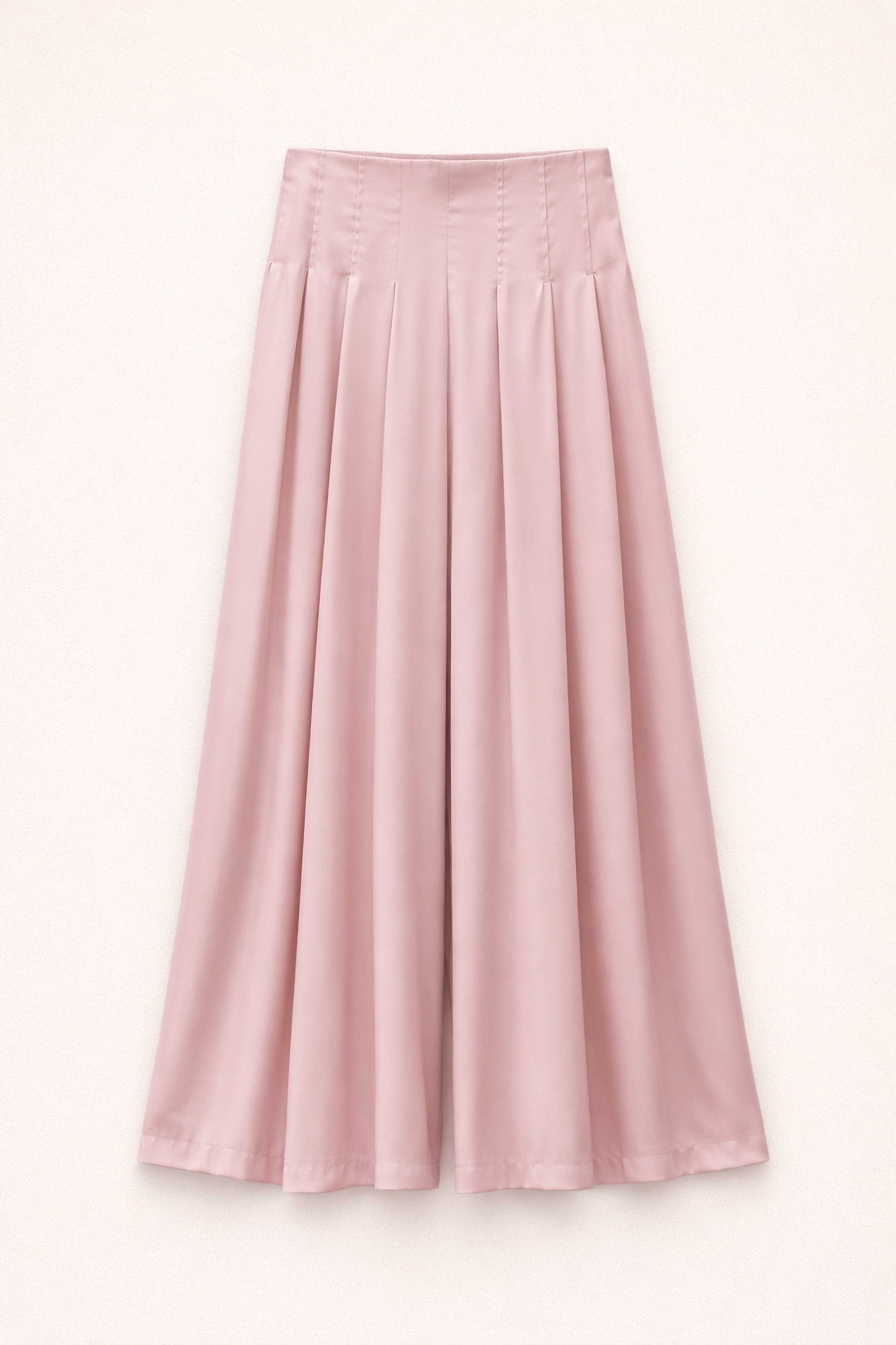 Pantaloni palazzo in raso fluido e satinato. Vita elasticizzata con arricciatura e coulisse regolabile. Pinces sul davanti. Tasche laterali inserite nei fianchi. Vestibilità regolare, disponibile in taglia S, M, L.