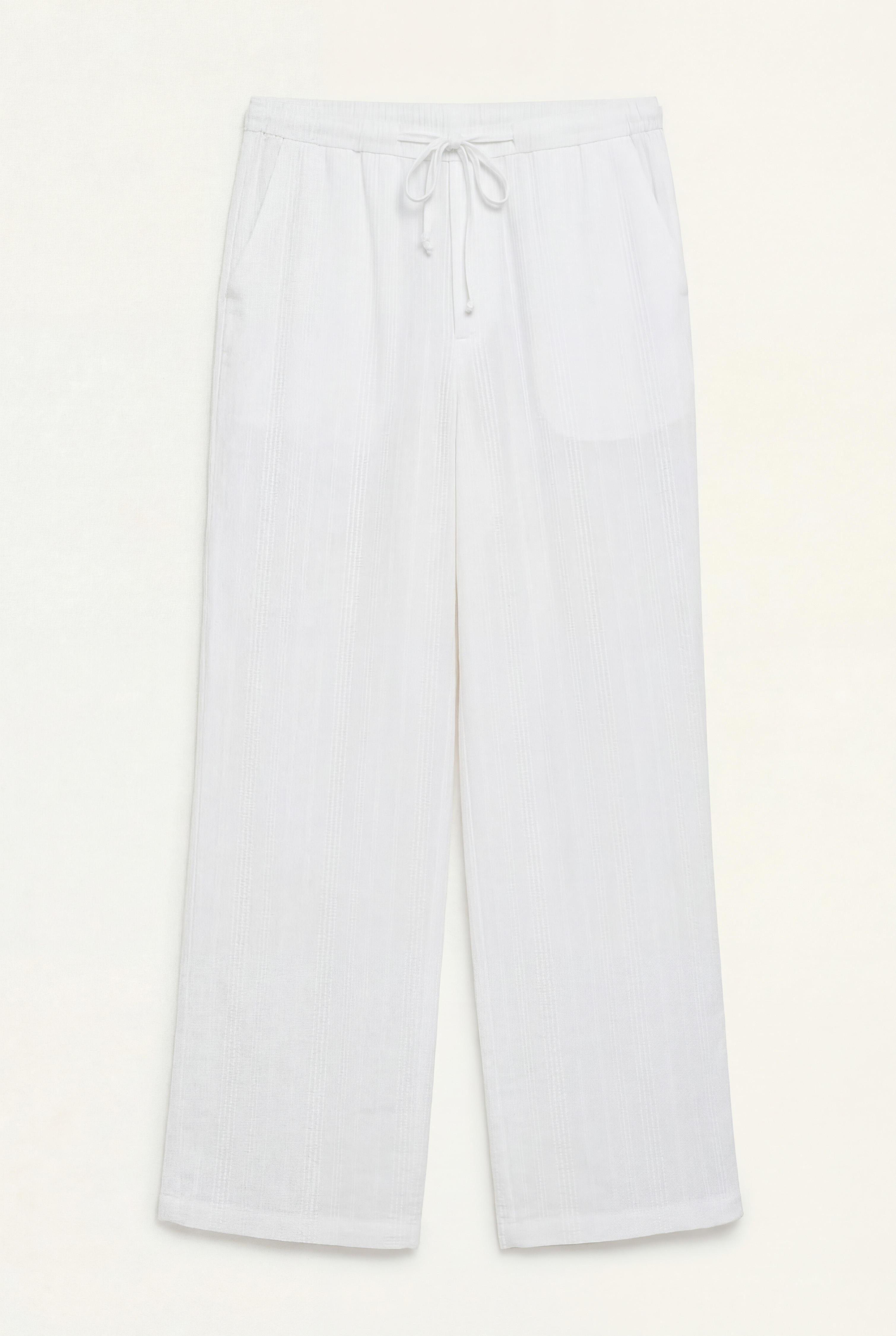 Pantaloni in tessuto con lavorazioni jacquard a righe in rilievo. Vita elasticizzata con coulisse regolabile. Chiusura frontale con cerniera e bottone. Vestibilità regolare, disponibile in taglia S/M, M/L.