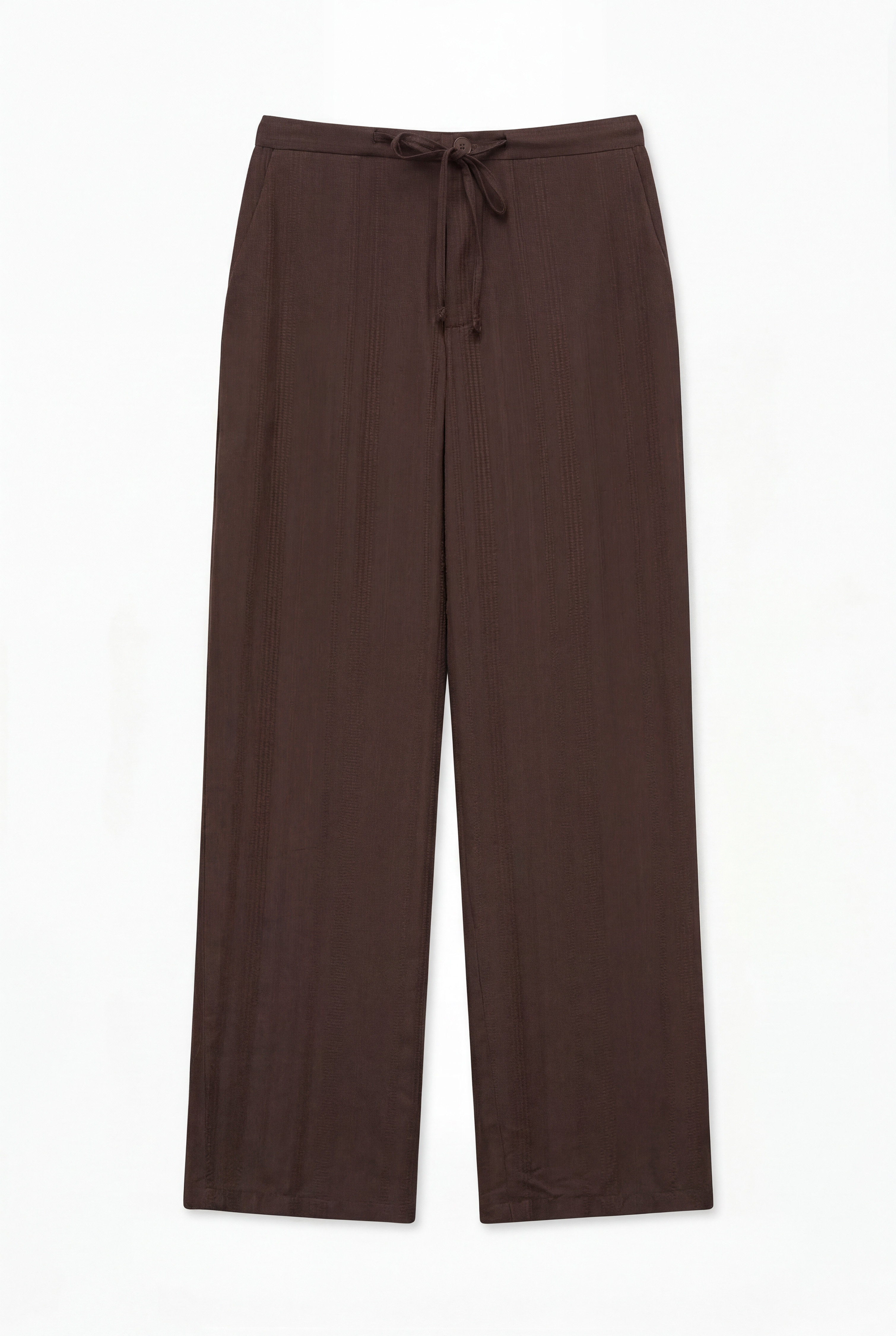 Pantaloni in tessuto con lavorazioni jacquard a righe in rilievo. Vita elasticizzata con coulisse regolabile. Chiusura frontale con cerniera e bottone. Vestibilità regolare, disponibile in taglia S/M, M/L.