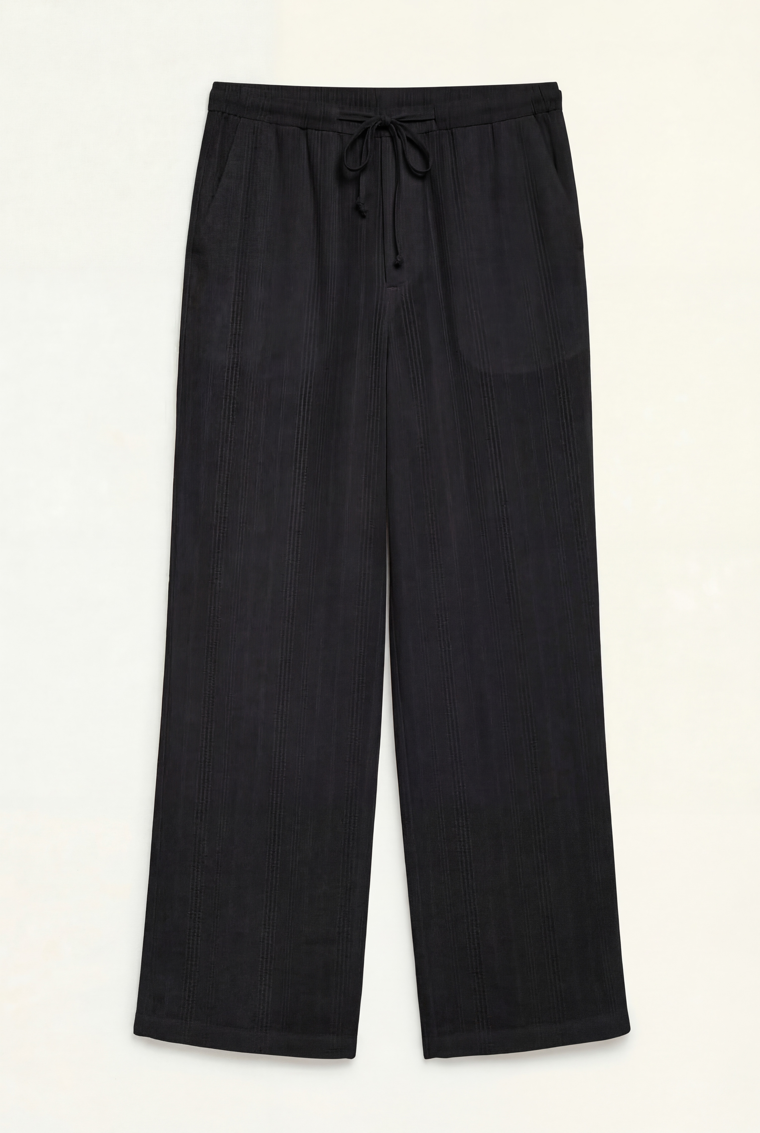 Pantaloni in tessuto con lavorazioni jacquard a righe in rilievo. Vita elasticizzata con coulisse regolabile. Chiusura frontale con cerniera e bottone. Vestibilità regolare, disponibile in taglia S/M, M/L.