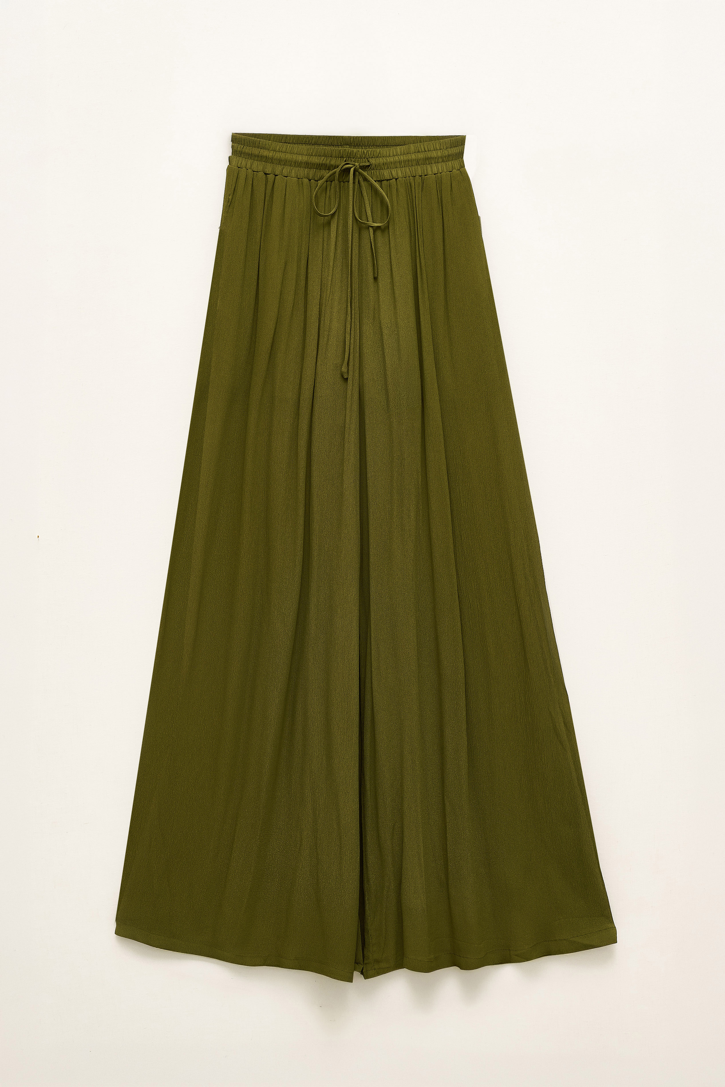 Pantaloni palazzo in tessuto semitrasparente satinato.
