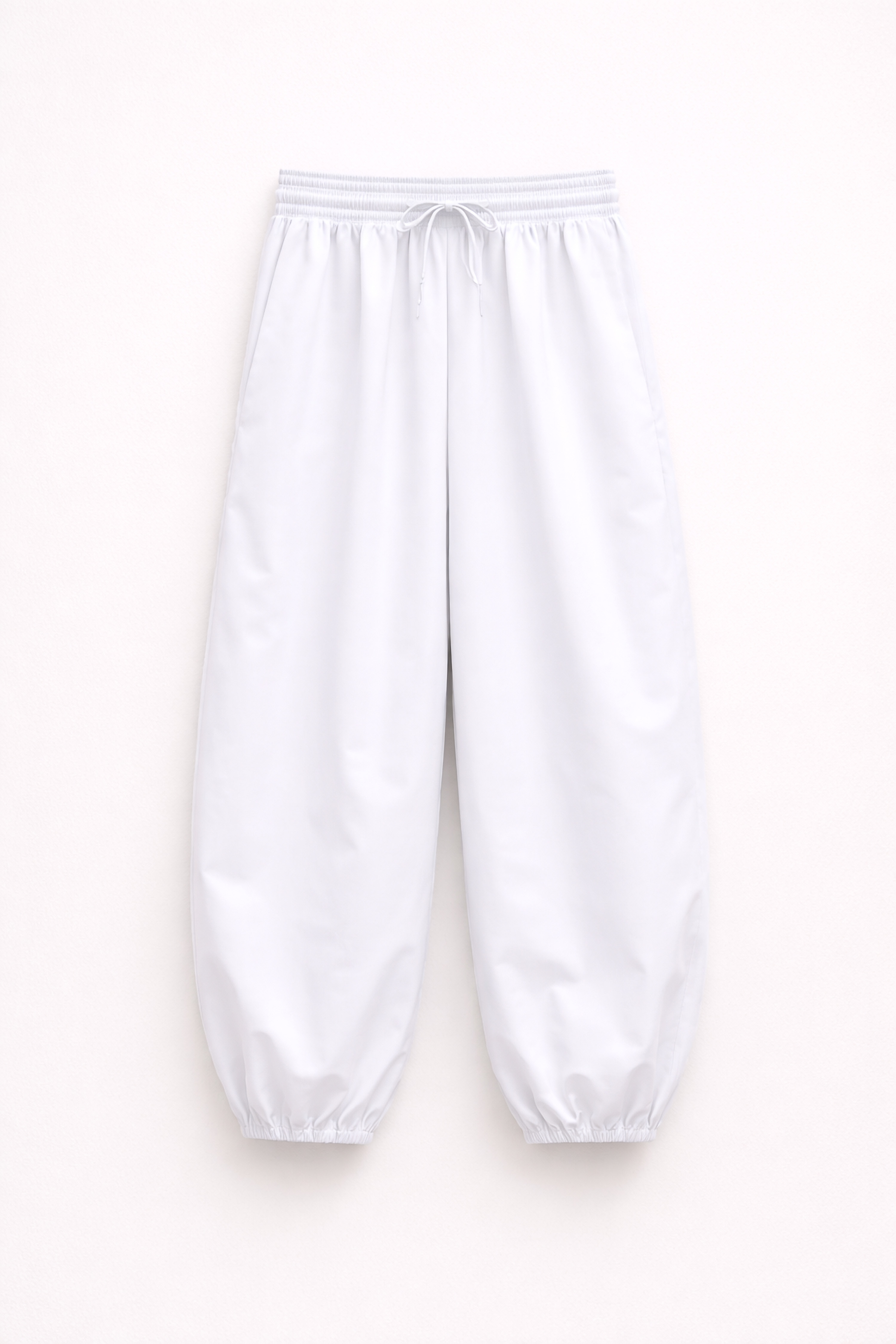 Pantaloni balloon in tessuto satinato misto lyocell. Vita alta con ampia fascia elasticizzata con arricciature. Fondo gamba con elastico. Tasche laterali inserite. Vestibilità regolare, disponibile in taglia S/M, M/L.